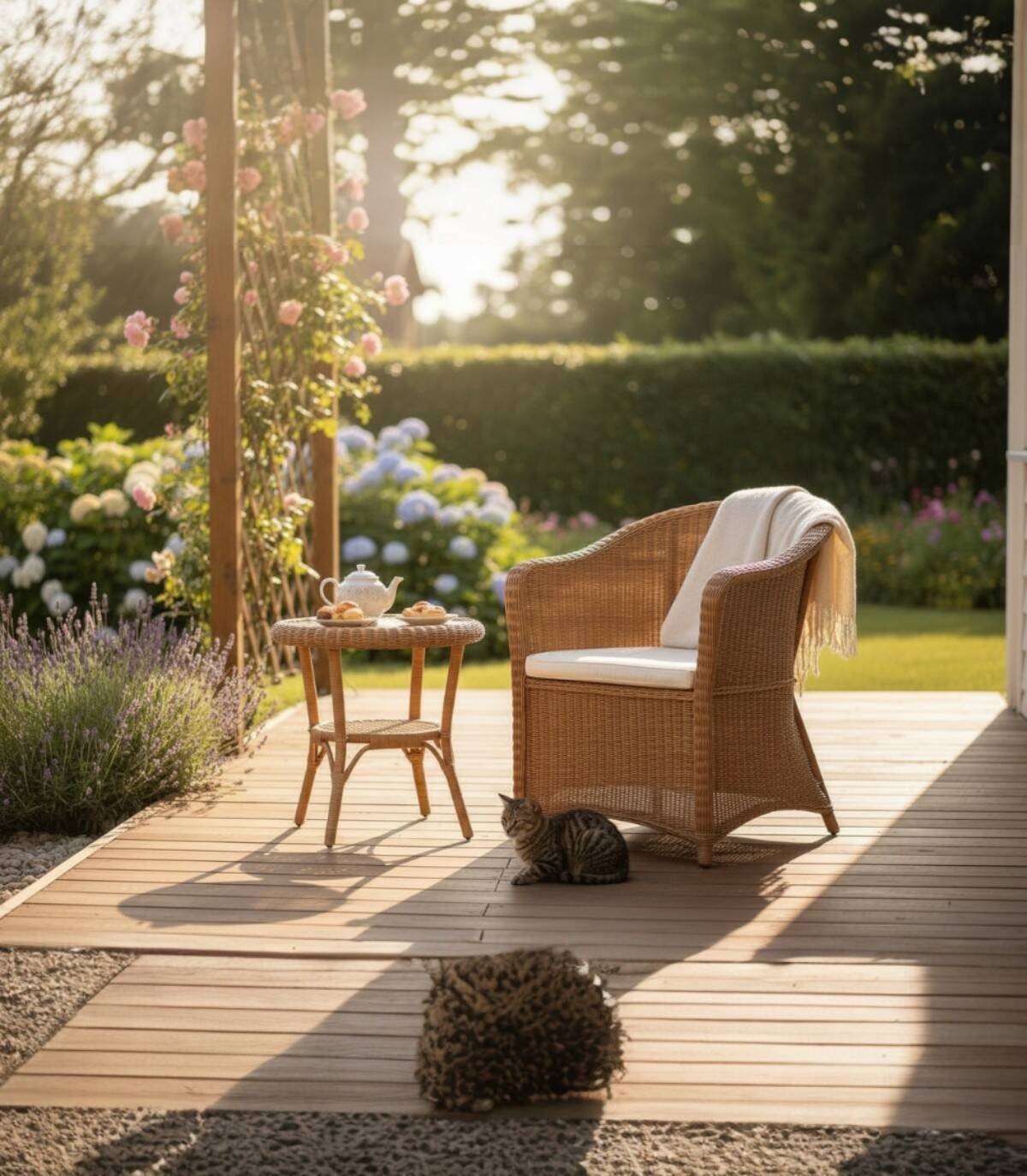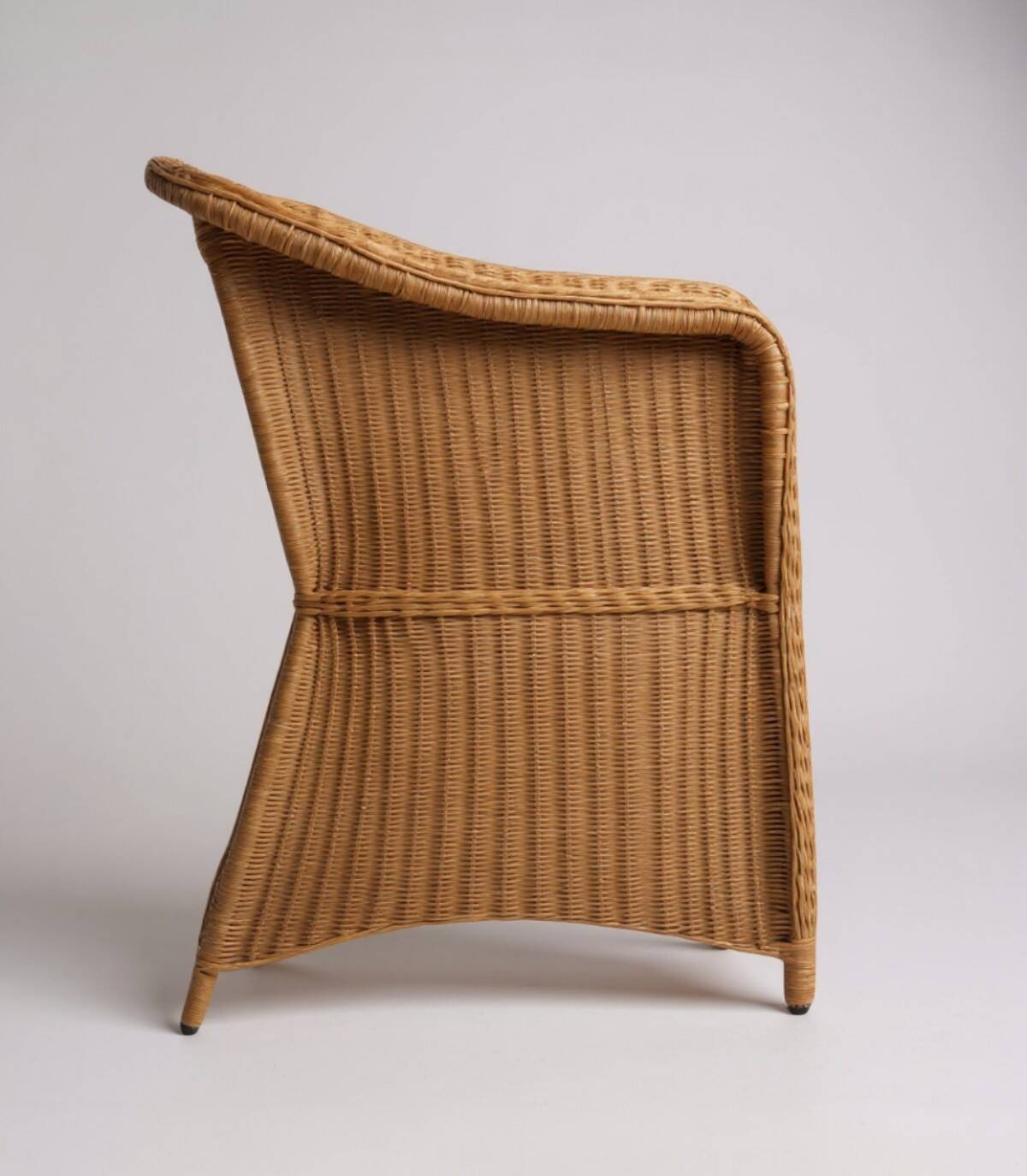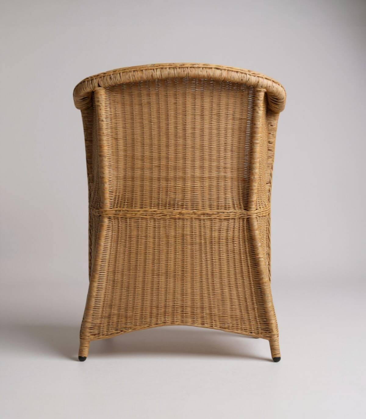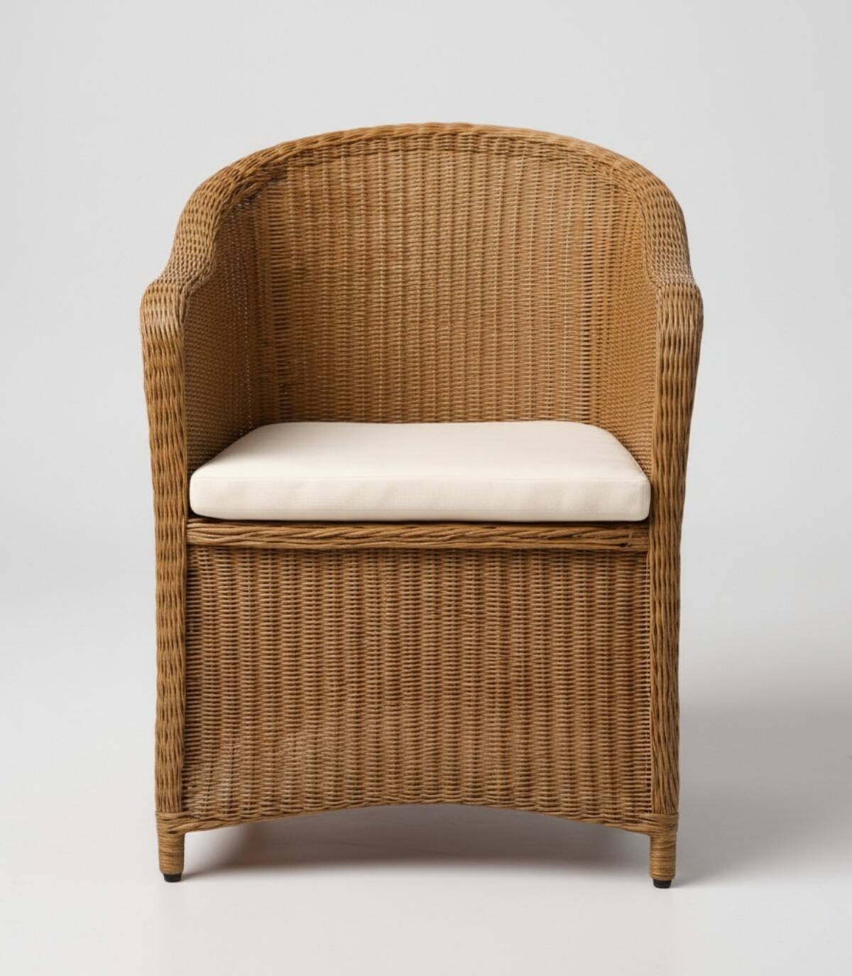 La silla Emma se compone de asiento, respaldo y reposabrazos fabricado en ratán sintetico con reposabrazos unidos al respaldo en forma semicircular, con cuatro patas y cojín de asiento de color blanco.