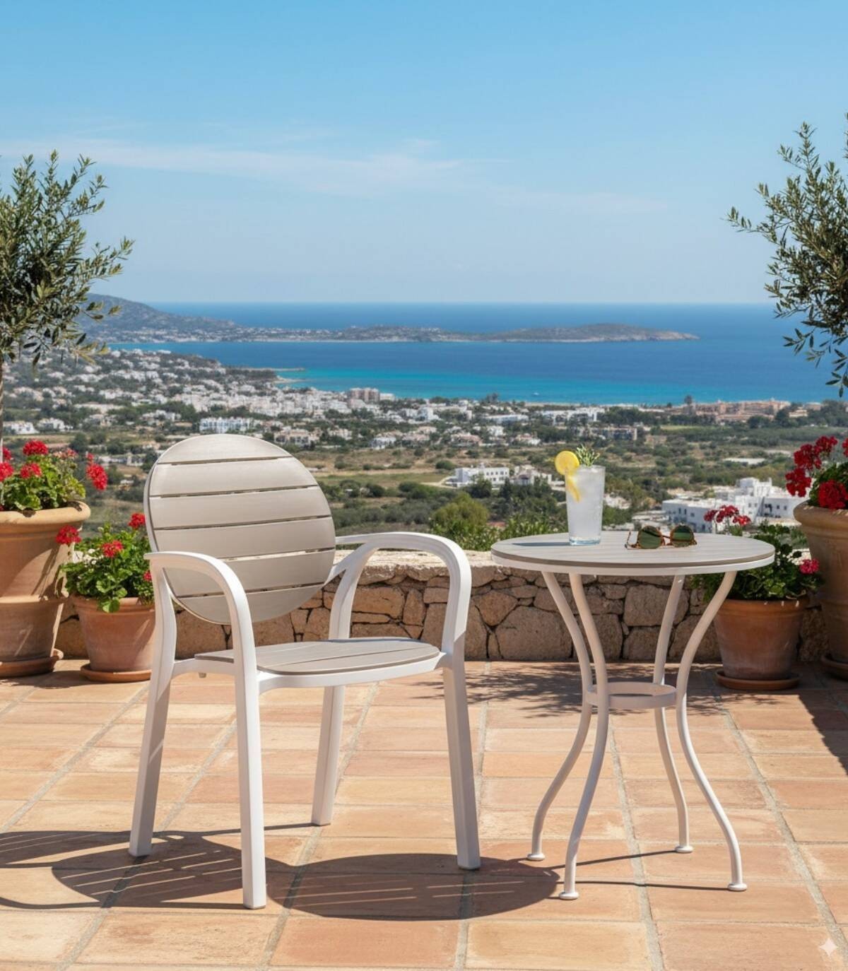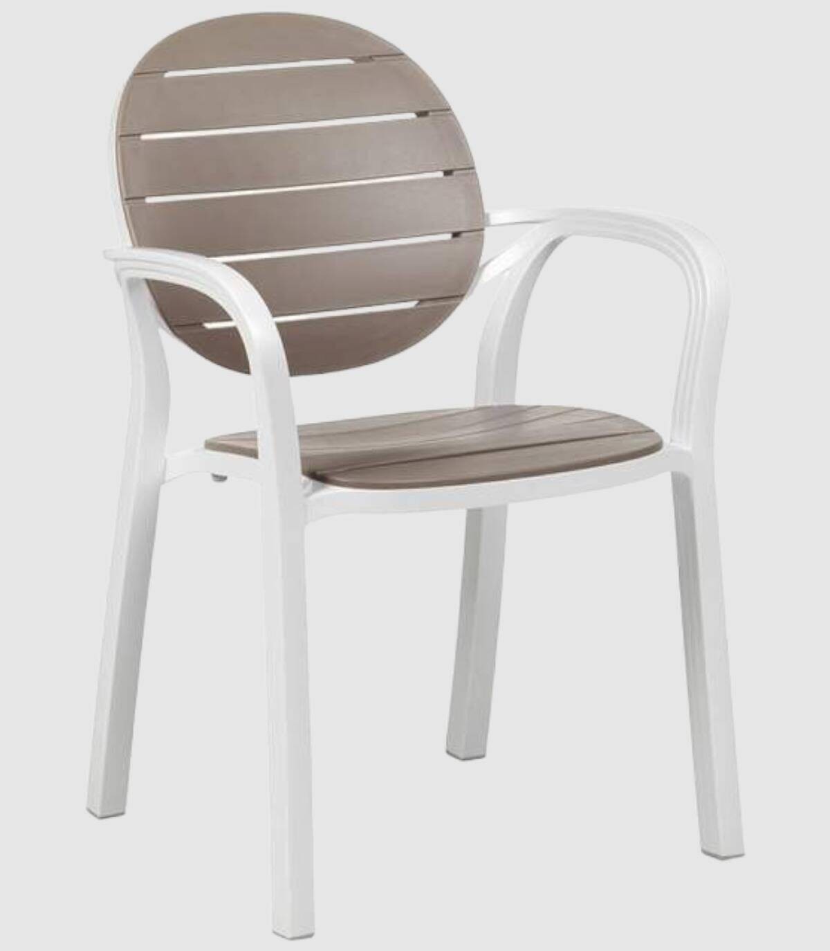 De Palma fauteuil heeft een monobloc plankstijl. Materiaal: polypropyleen glasvezel behandeld anti-UV en massageverfd. recyclebare hars. mat effect. Met antislipdoppen. Kussen beschikbaar op aanvraag.