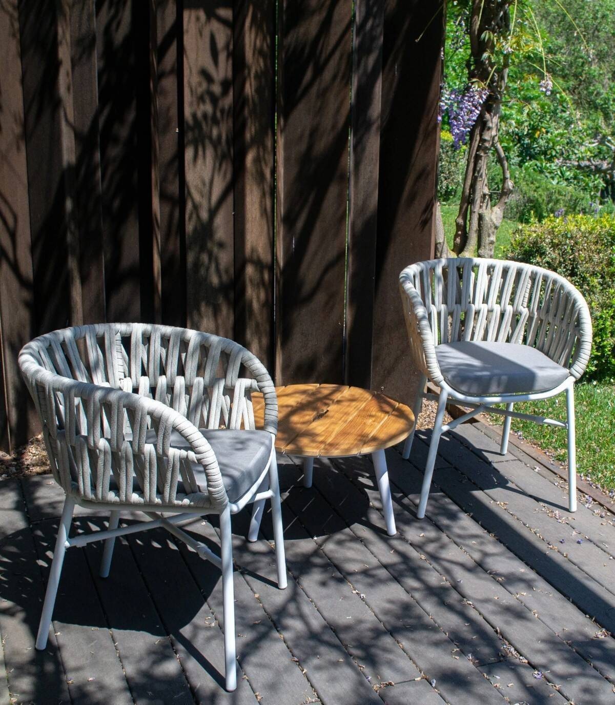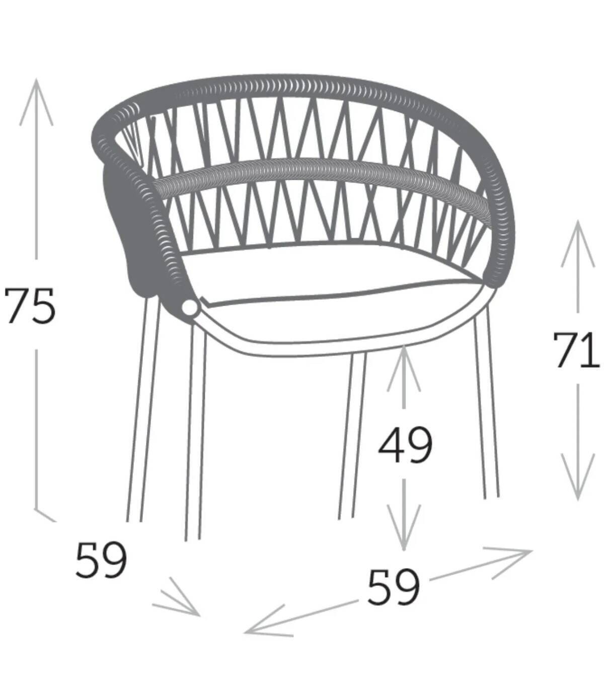 La silla para jardín Drop está fabricada en aluminio con revestimiento en polvo (poliéster). Tiene una asiento tejido con textilene. Las 4 patas tienen tapones antideslizantes.