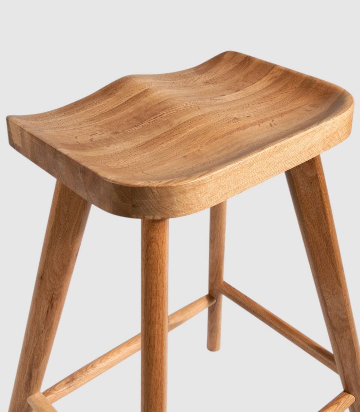 El taburete Junco de comedor se compone de asiento y patas de madera de color roble natural.