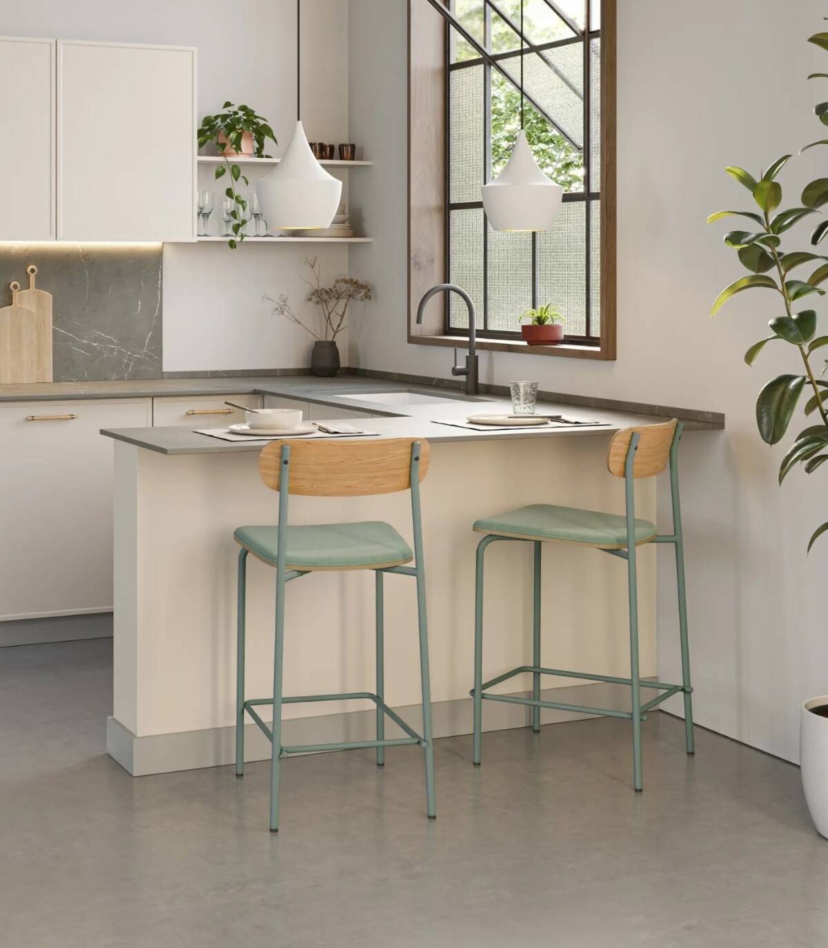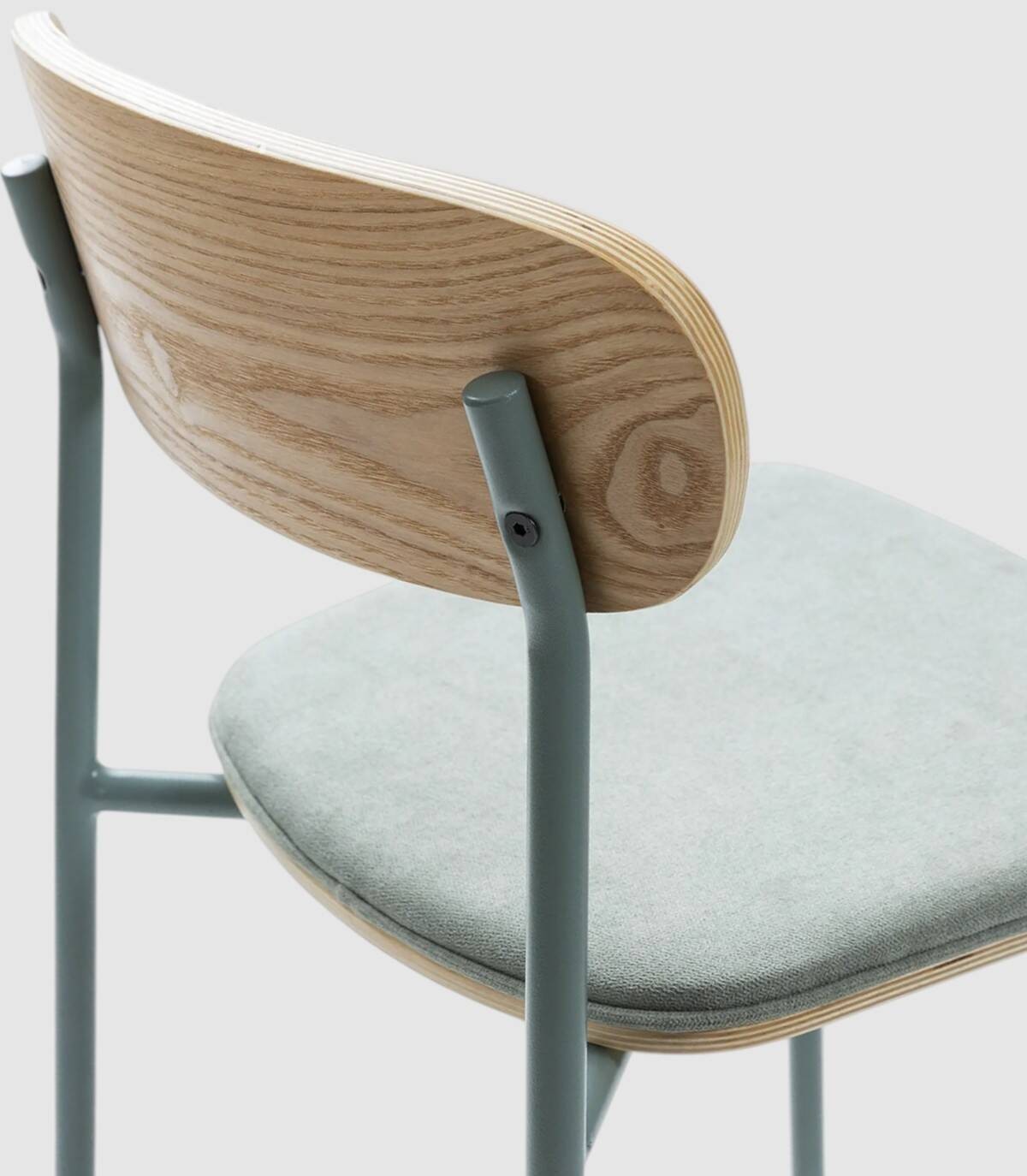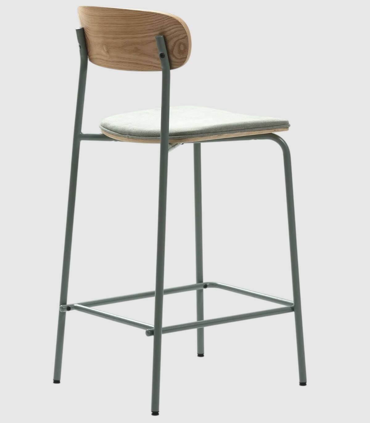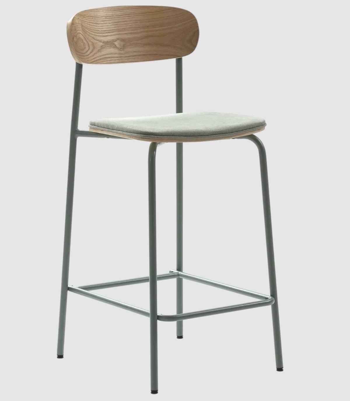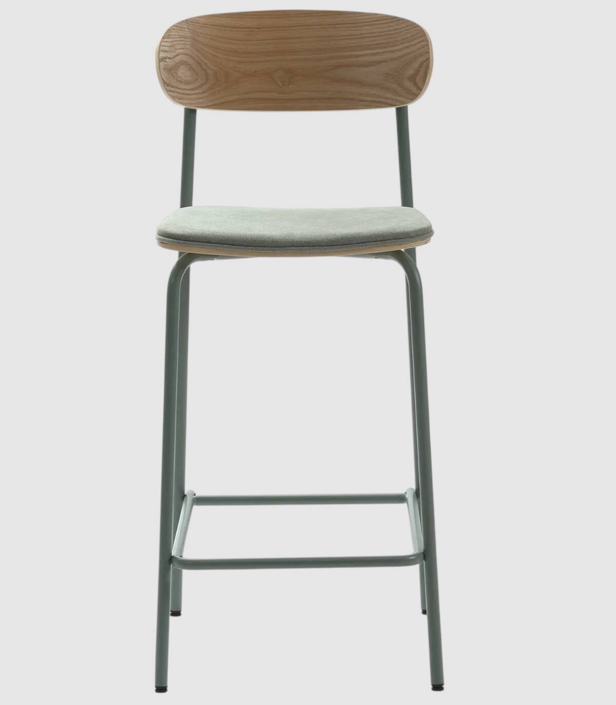 El taburete Basol se compone de asiento tapizado de color aguamarina y respaldo de madera de color natural sobre estructura de metal con cuatro patas pintado de color aguamarina.