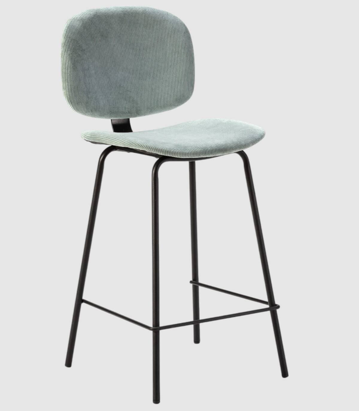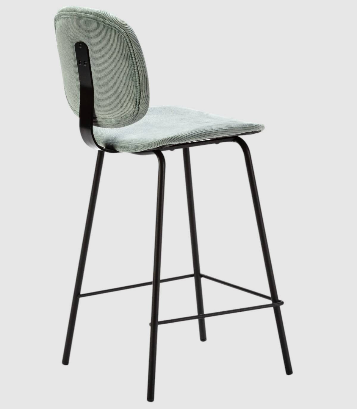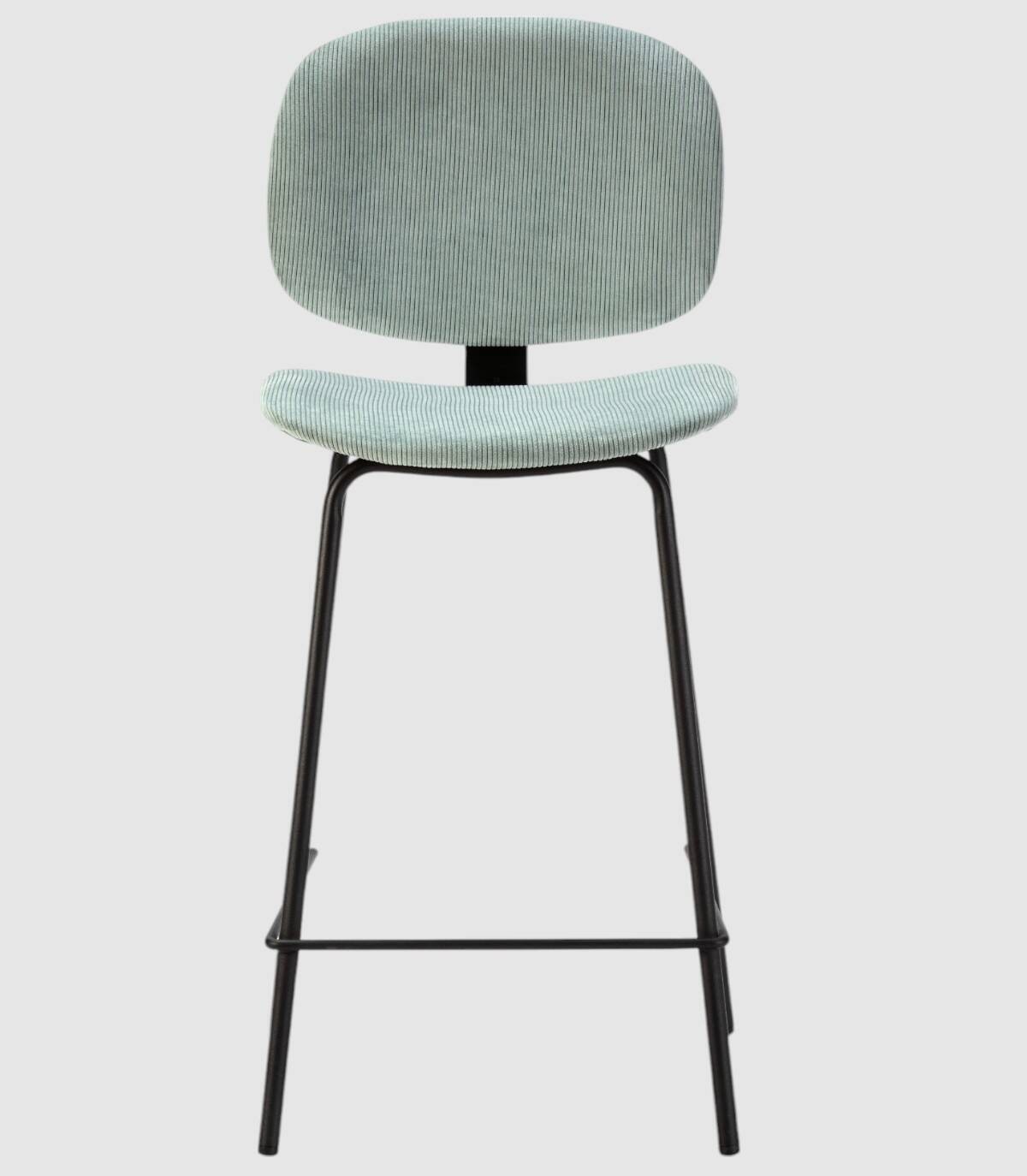 El taburete Dimsu se compone de asiento y respaldo tapizado de color aguamarina sobre estructura de metal con reposapies y cuatro patas pintado de color negro.