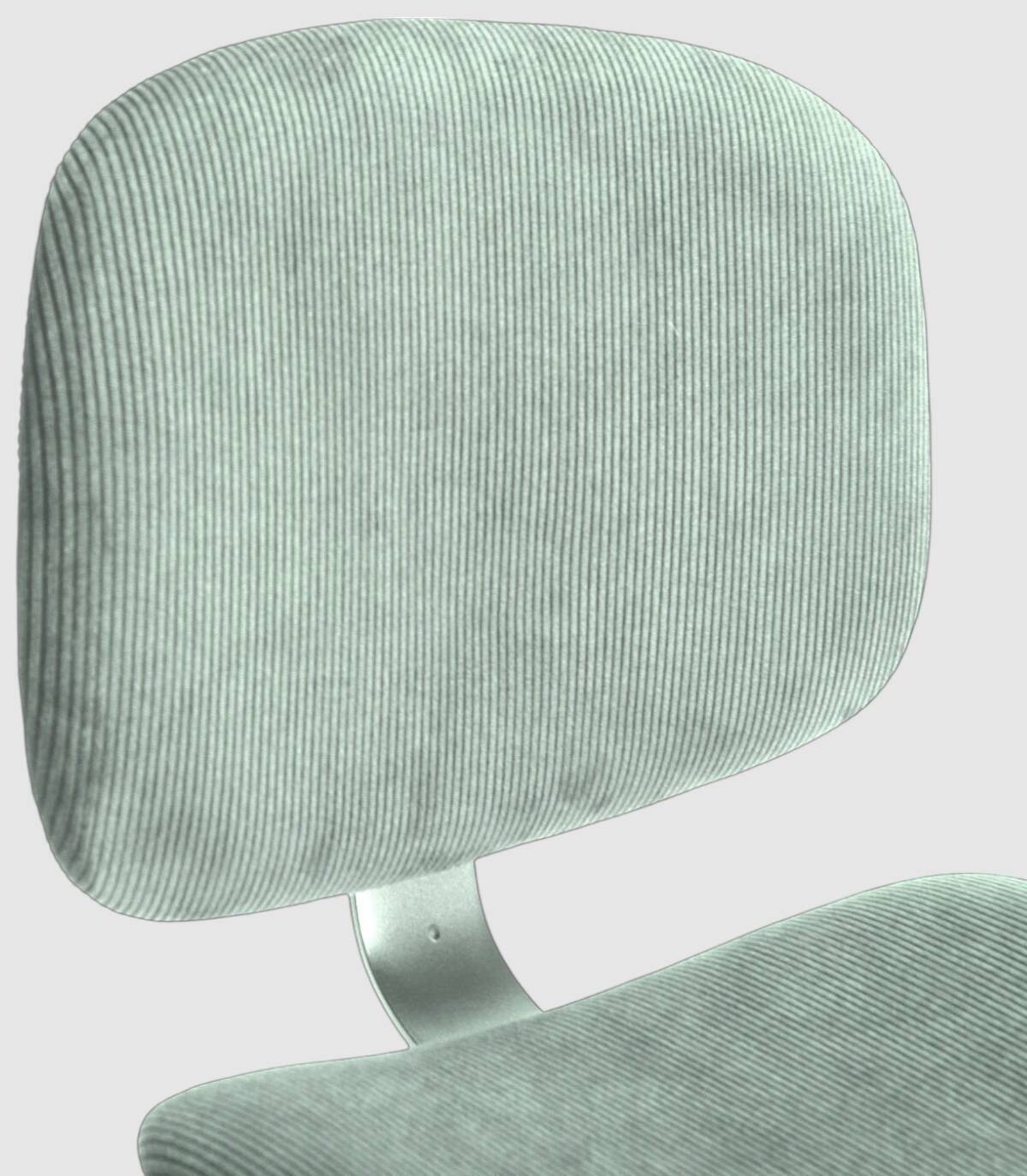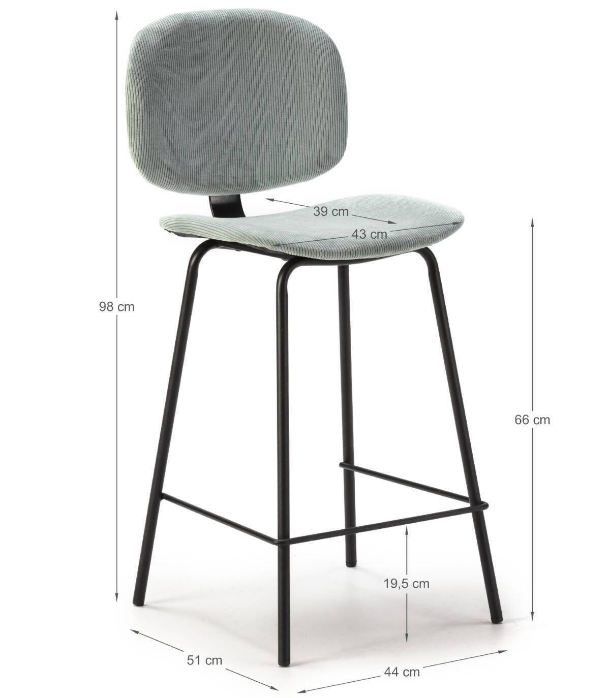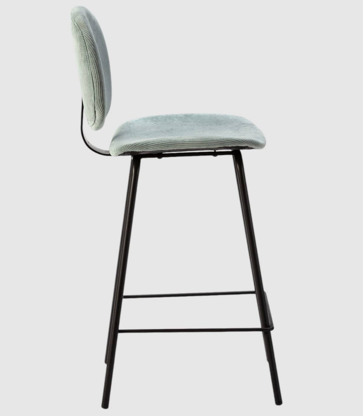 El taburete Dimsu se compone de asiento y respaldo tapizado de color aguamarina sobre estructura de metal con reposapies y cuatro patas pintado de color negro.