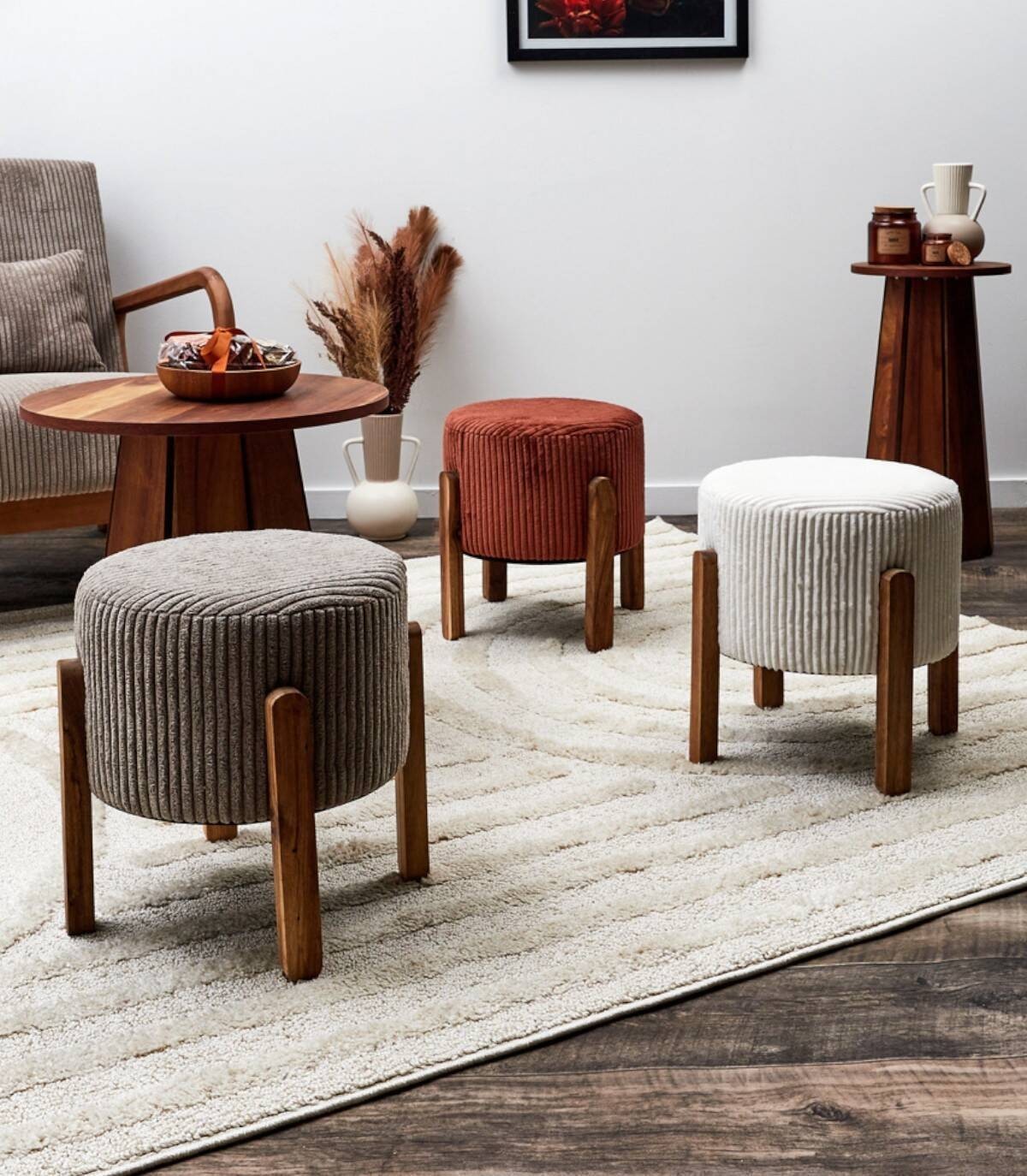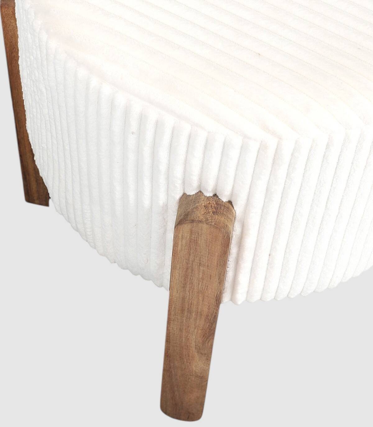 El taburete Scott se compone de estructura y cuatro patas de madera MDF y tapizado acanalado de poliéster color blanco relleno de poliuretano.