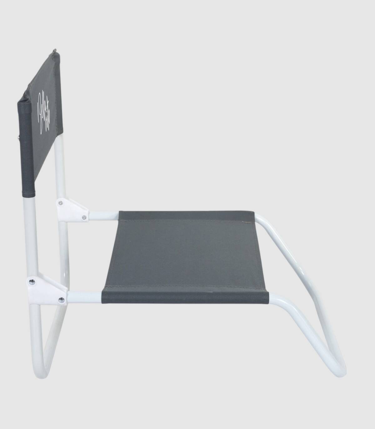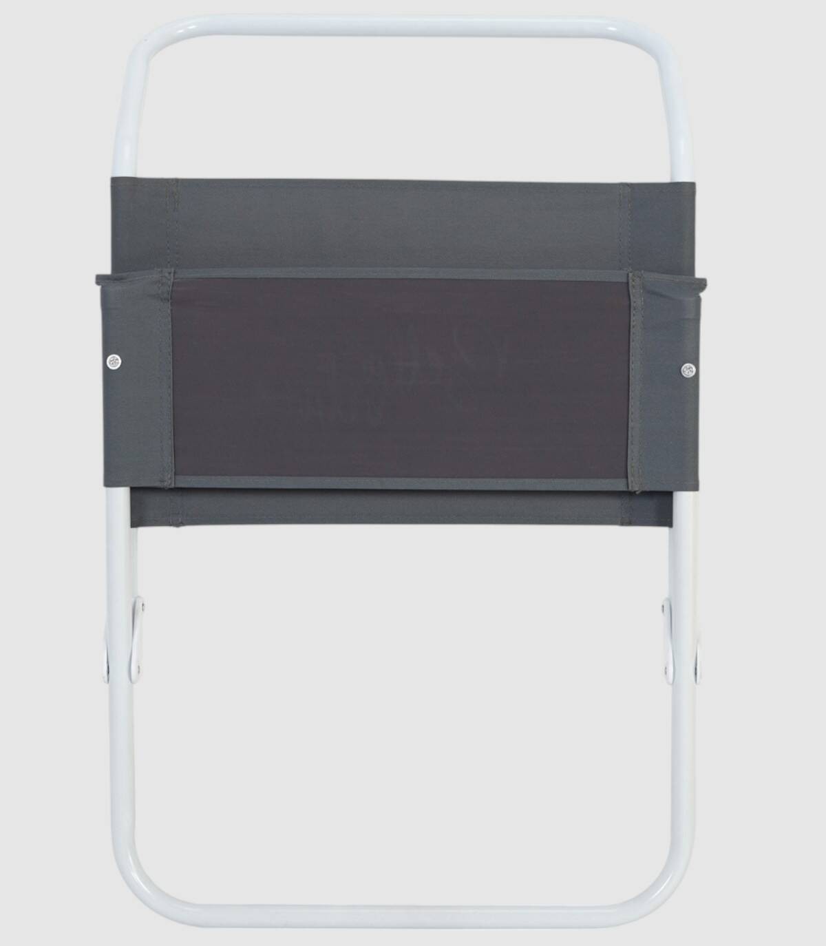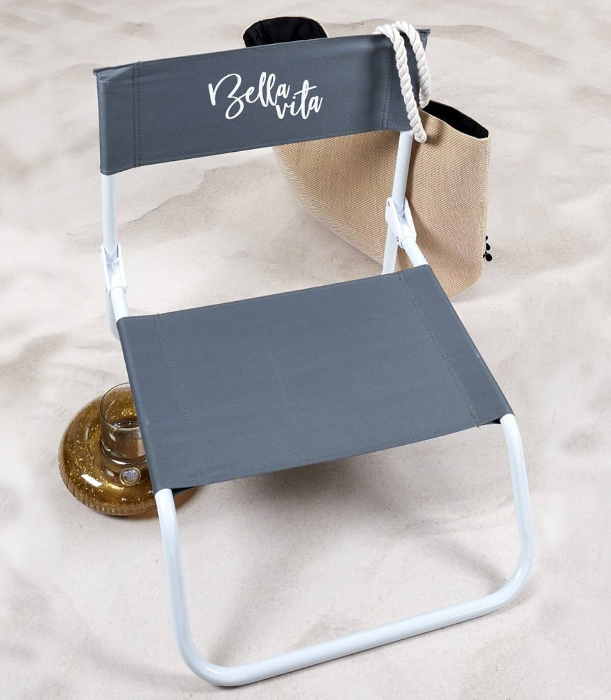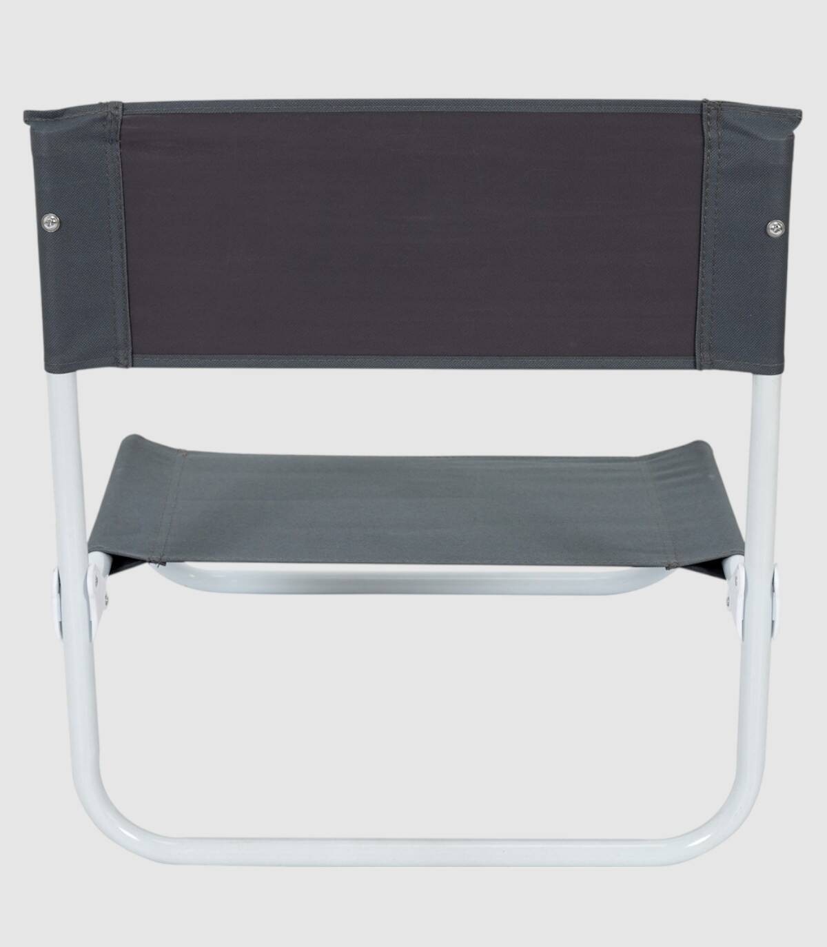 Silla de playa plegable con asiento y respaldo de tela de color gris y patas plegables de aluminio pintado de color blanco.