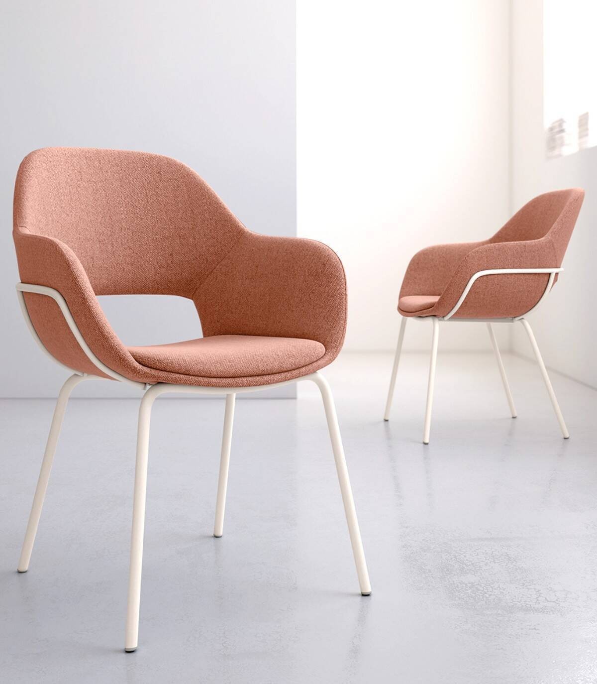 La silla Brisbane con reposabrazos se compone de estructura y patas de color marfil con tapizado de color salmón en el asiento y el respaldo.