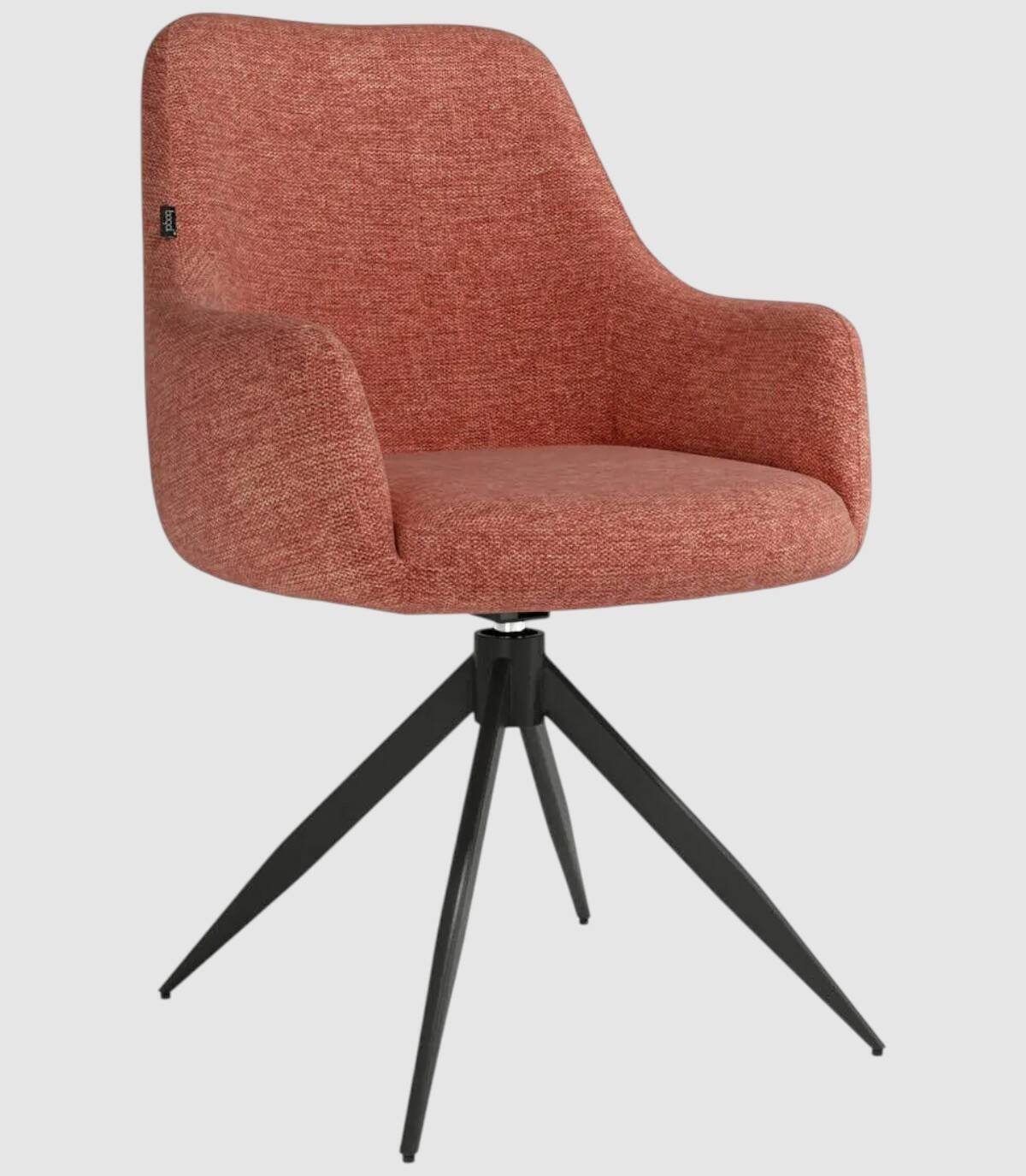La silla Montreal con reposabrazos se compone de estructura con sistema giratorio 180 grados y patas de color negro con tapizado de color salmón en el asiento y el respaldo.