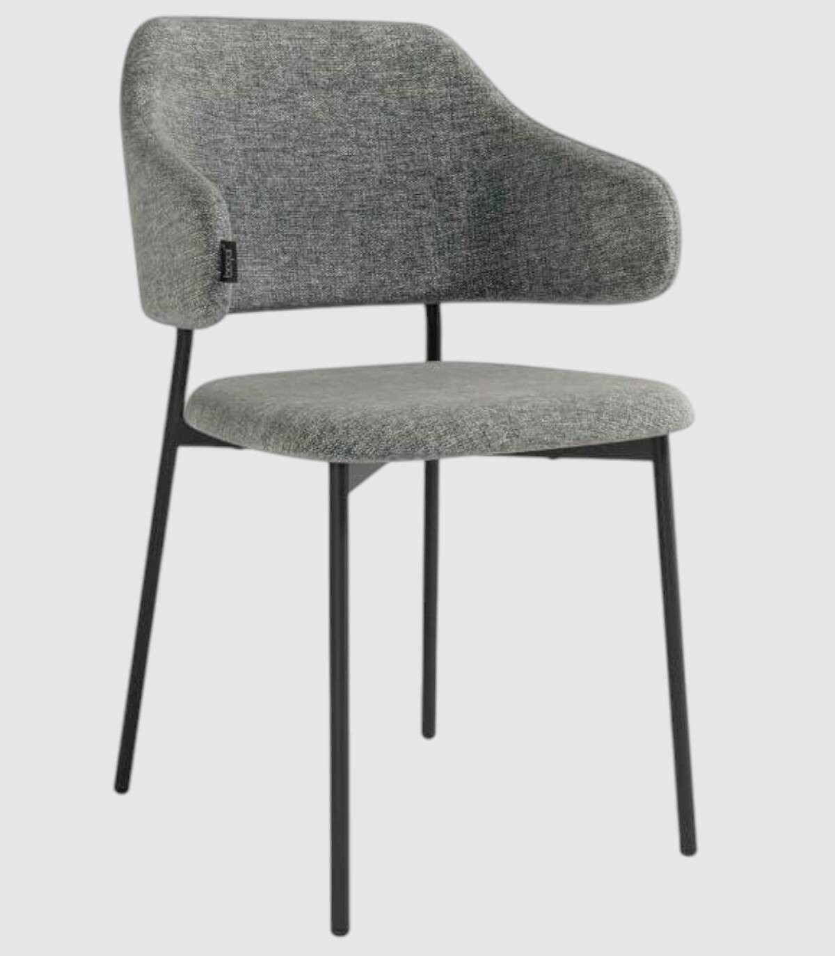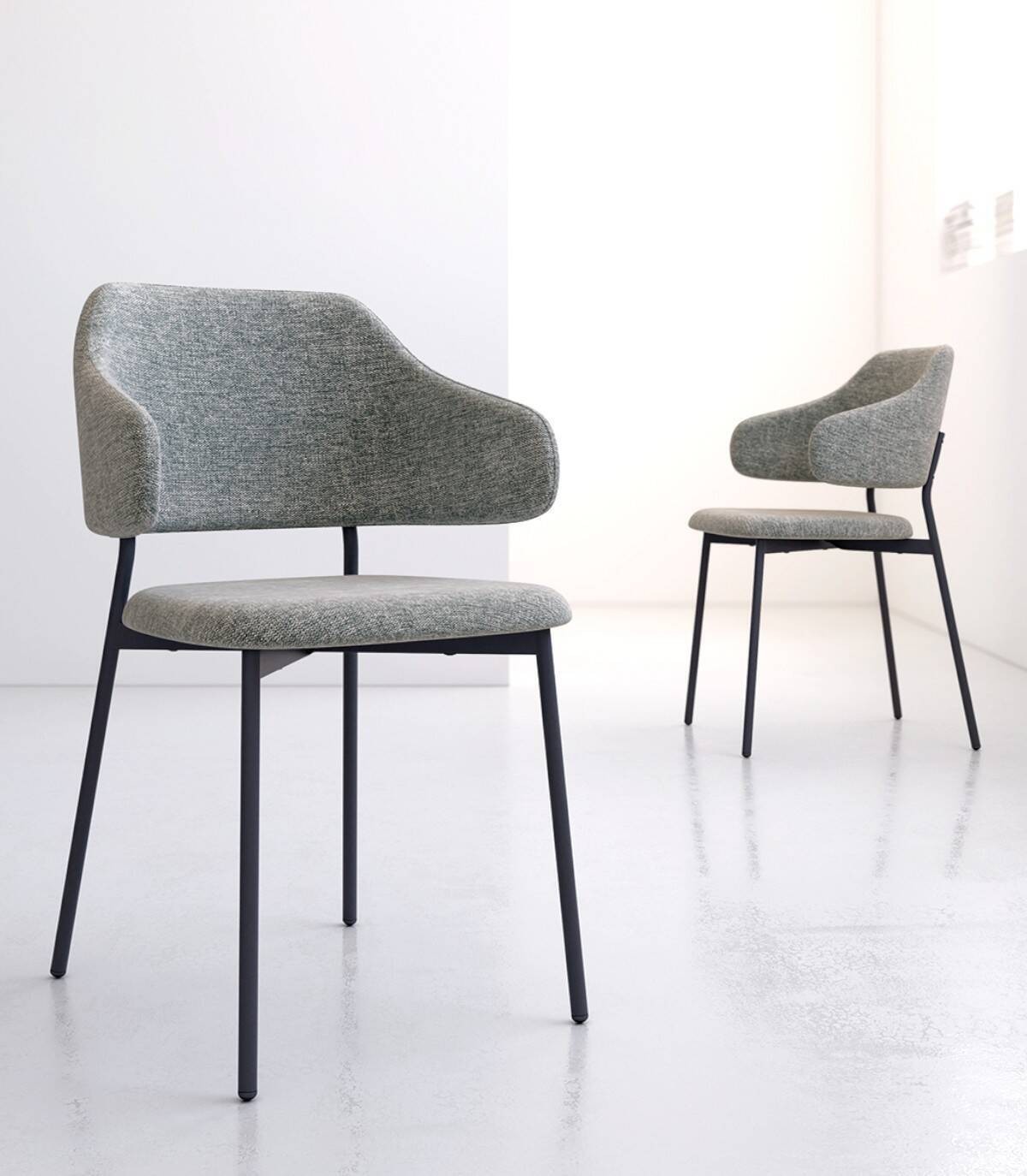 La silla Gante con reposabrazos se compone de estructura y patas de color negro con tapizado de color gris en el asiento y el respaldo.