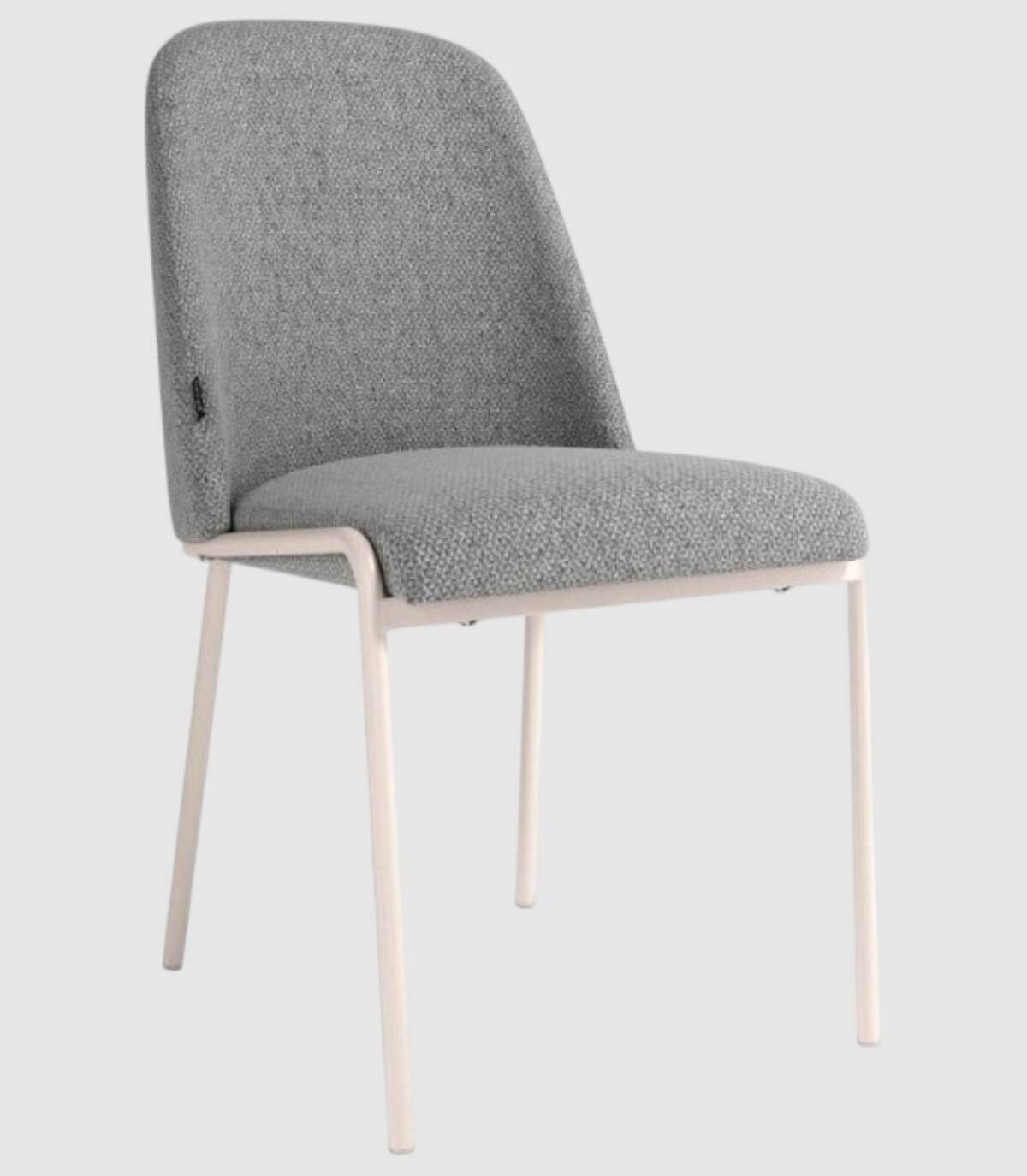 La silla Calgary sin reposabrazos se compone de estructura y patas de color marfil con tapizado de color gris en el asiento y el respaldo.