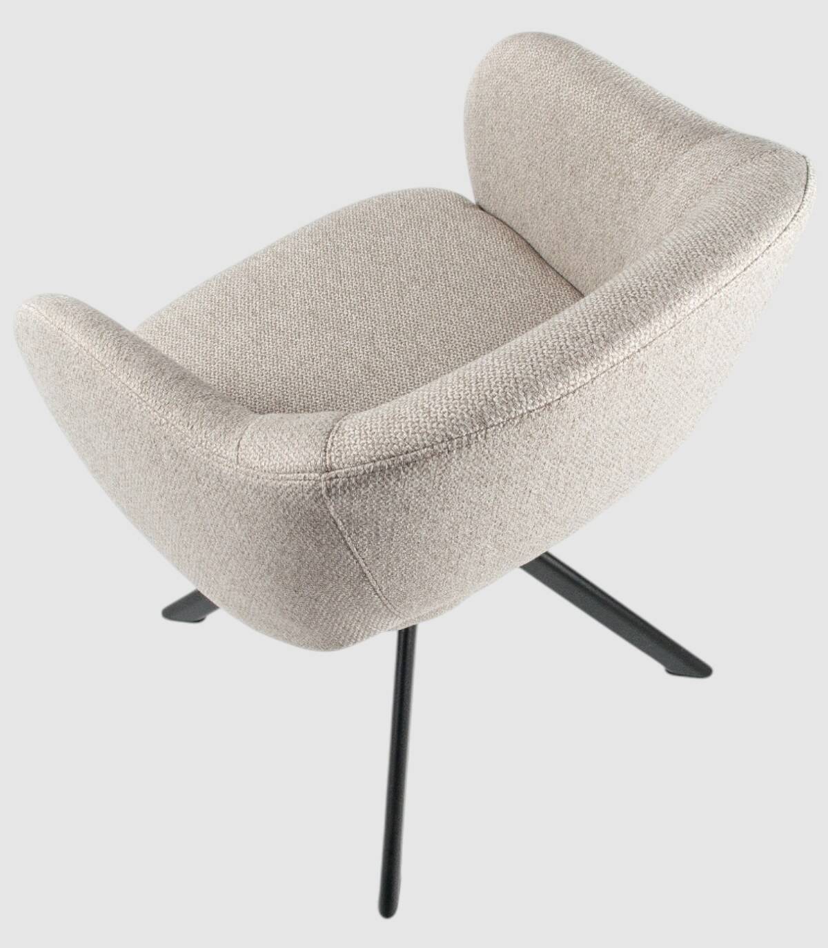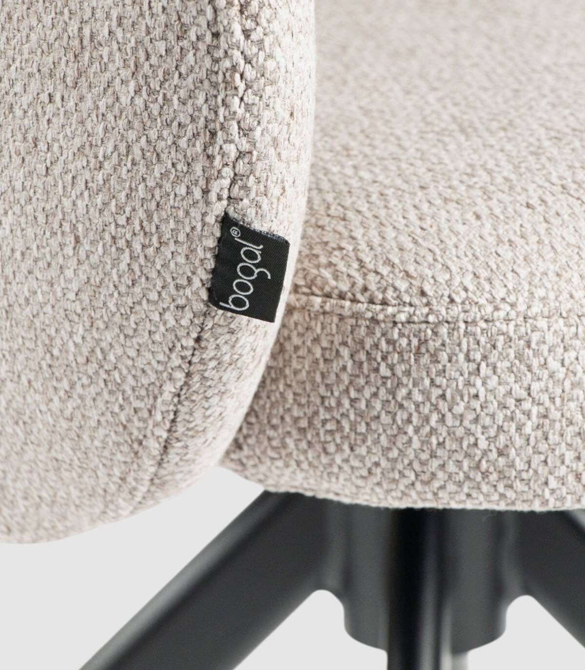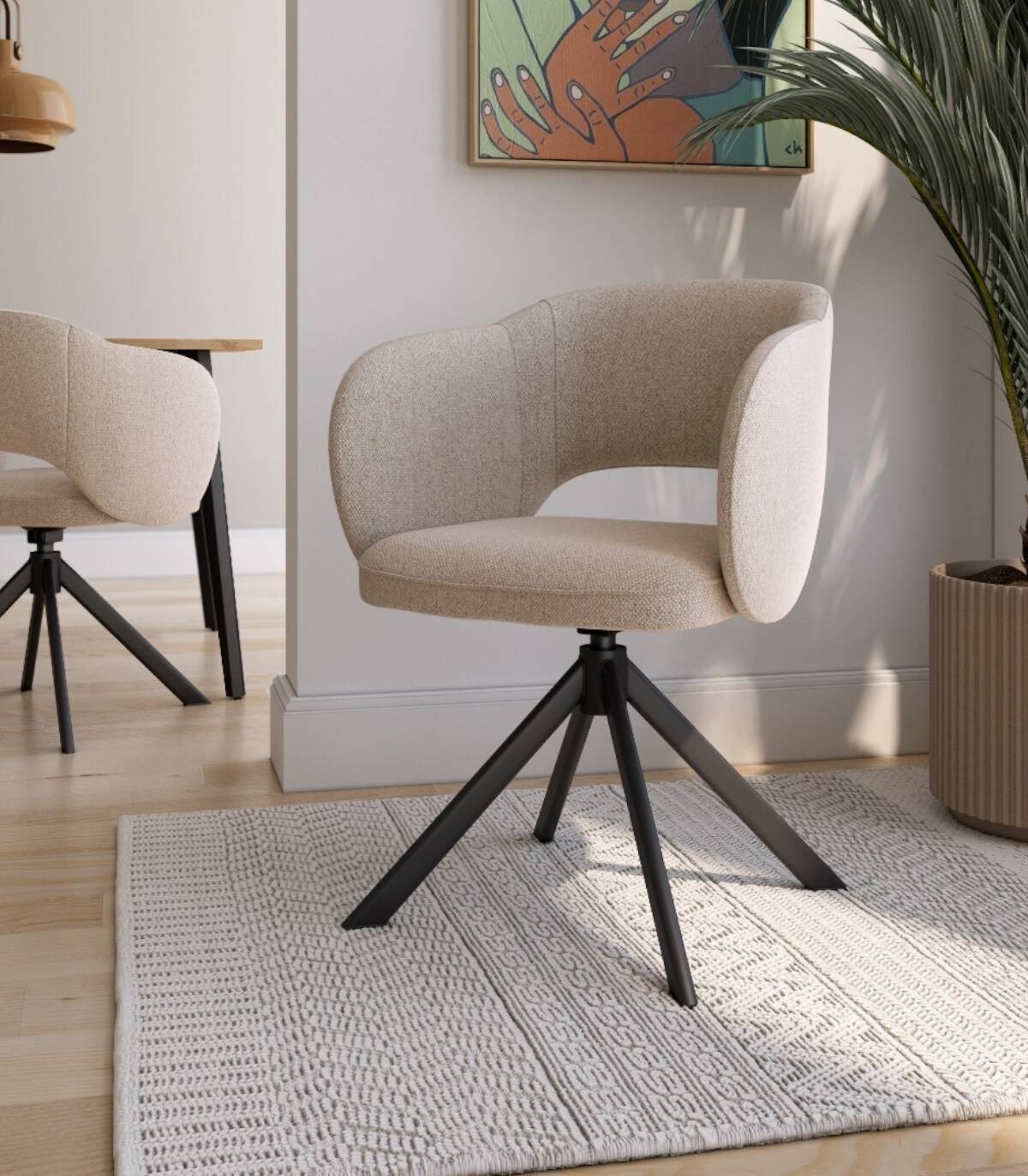 La silla Cork se compone de asiento, respaldo tapizado y patas metálicas negras con sistema giratorio 360 grados.