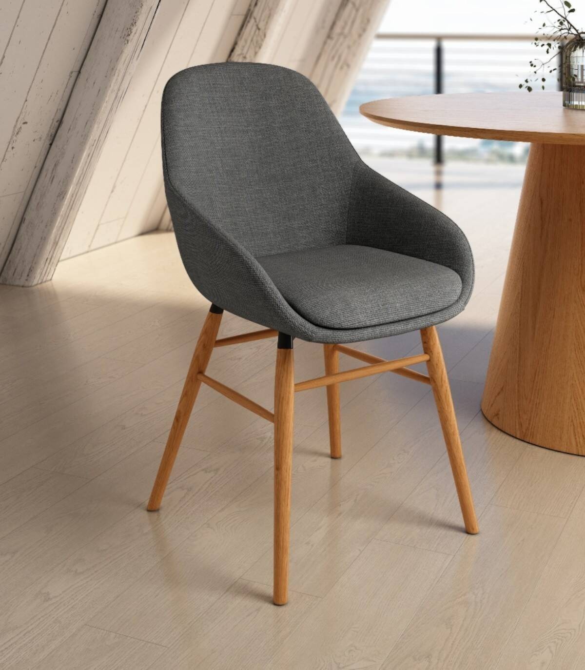 La silla Ottawa de comedor se compone de respaldo, asiento, reposabrazos tapizados y cuatro patas de madera de color roble natural.