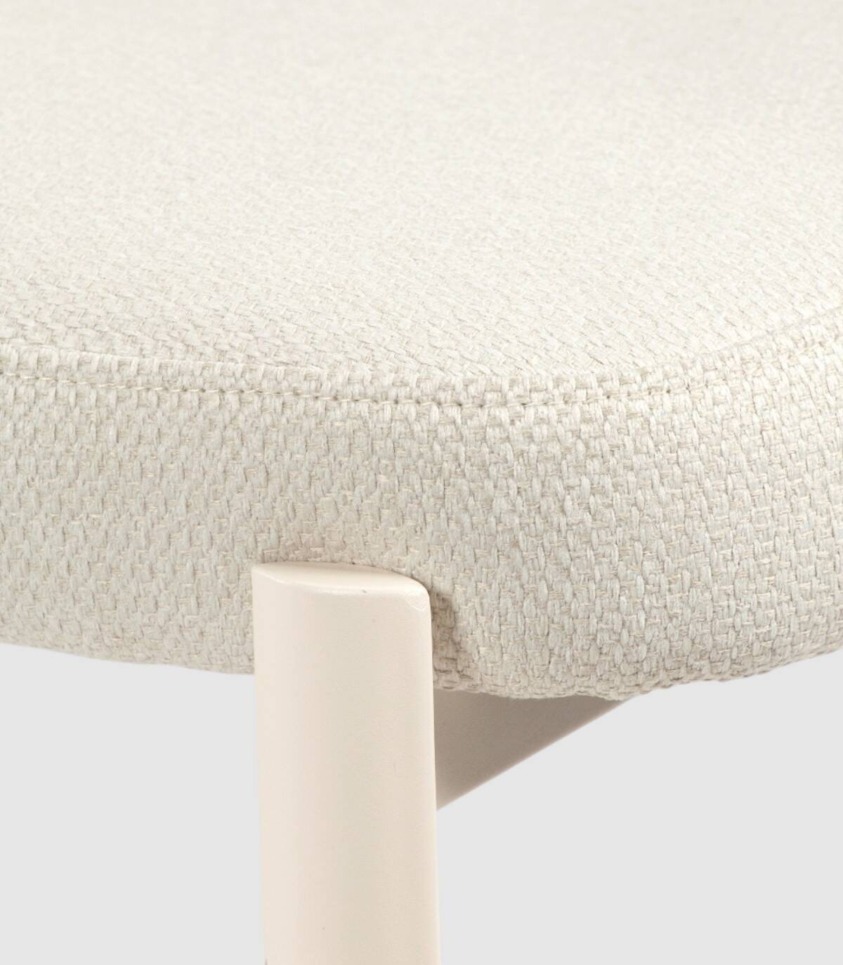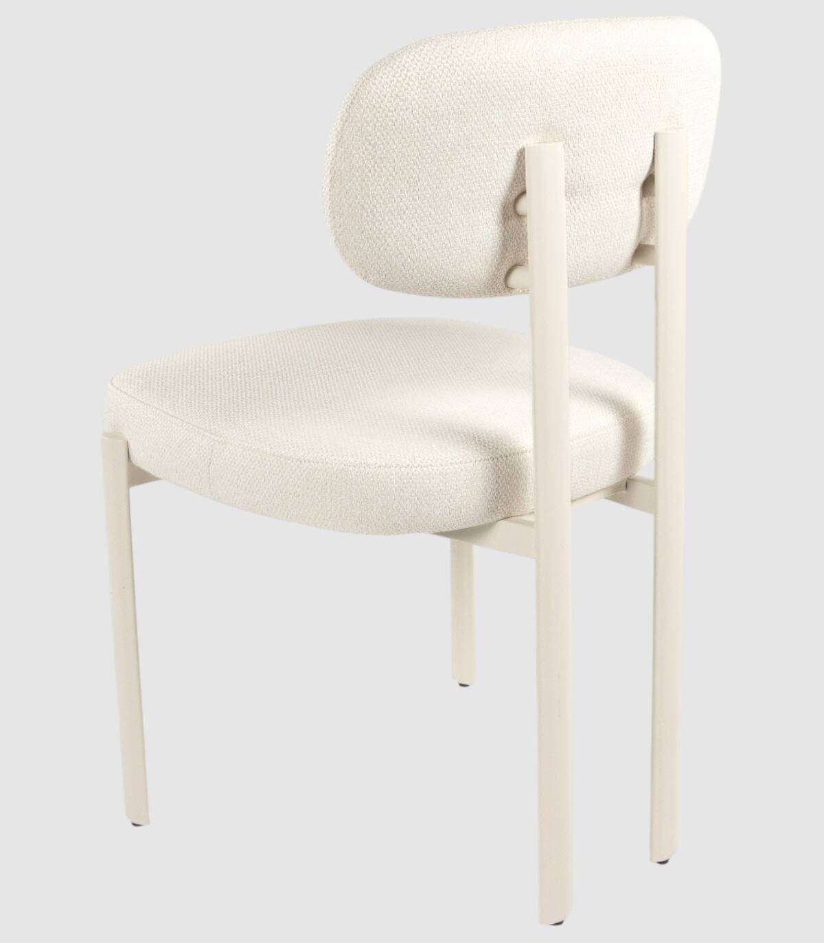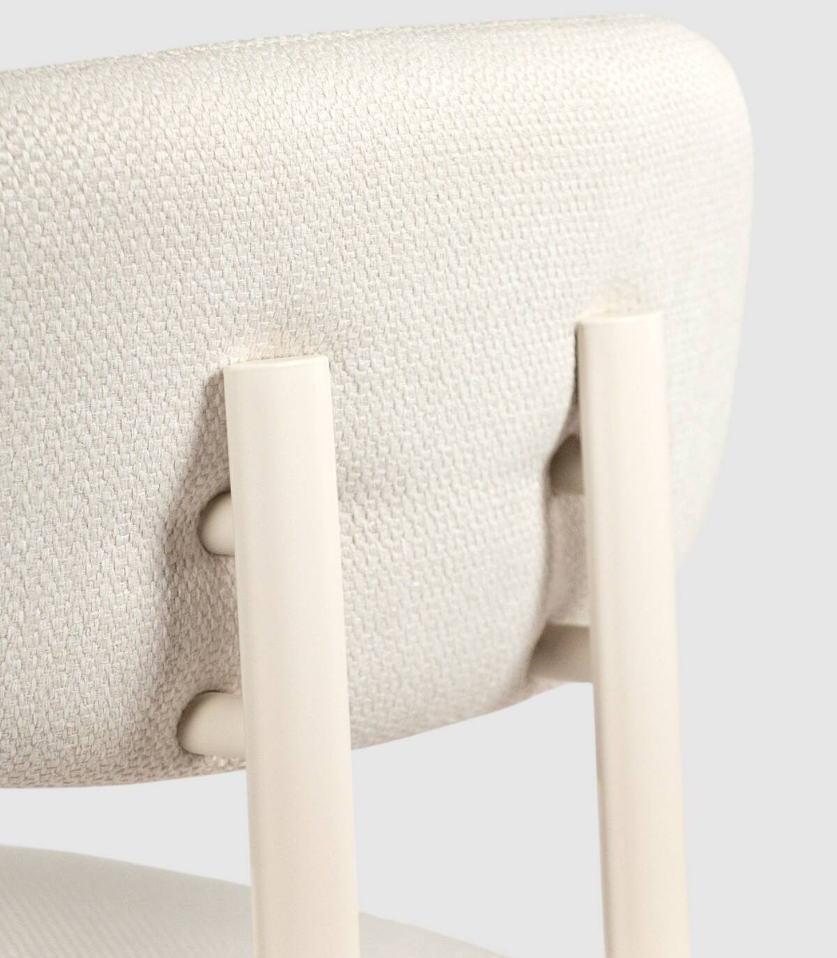 La silla Pretoria de comedor se compone de respaldo y asiento tapizado y patas metálicas pintadas de color marfil.