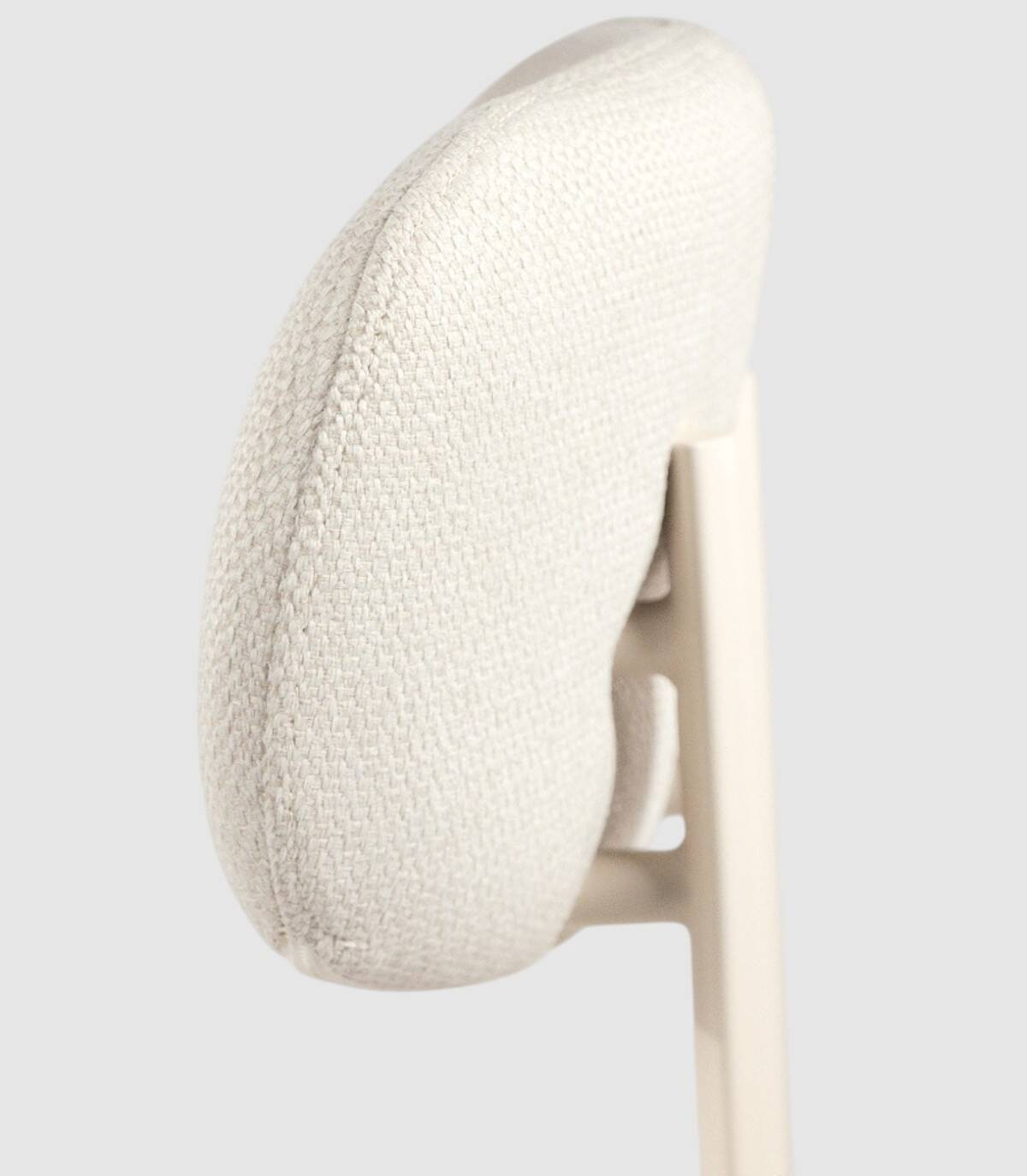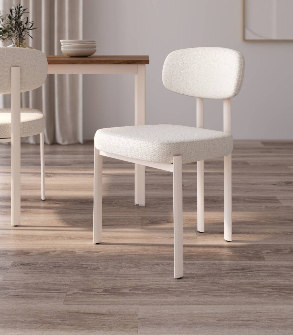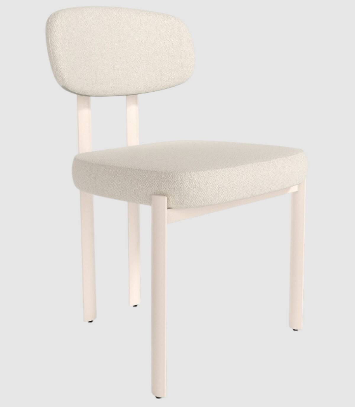 La silla Pretoria de comedor se compone de respaldo y asiento tapizado y patas metálicas pintadas de color marfil.