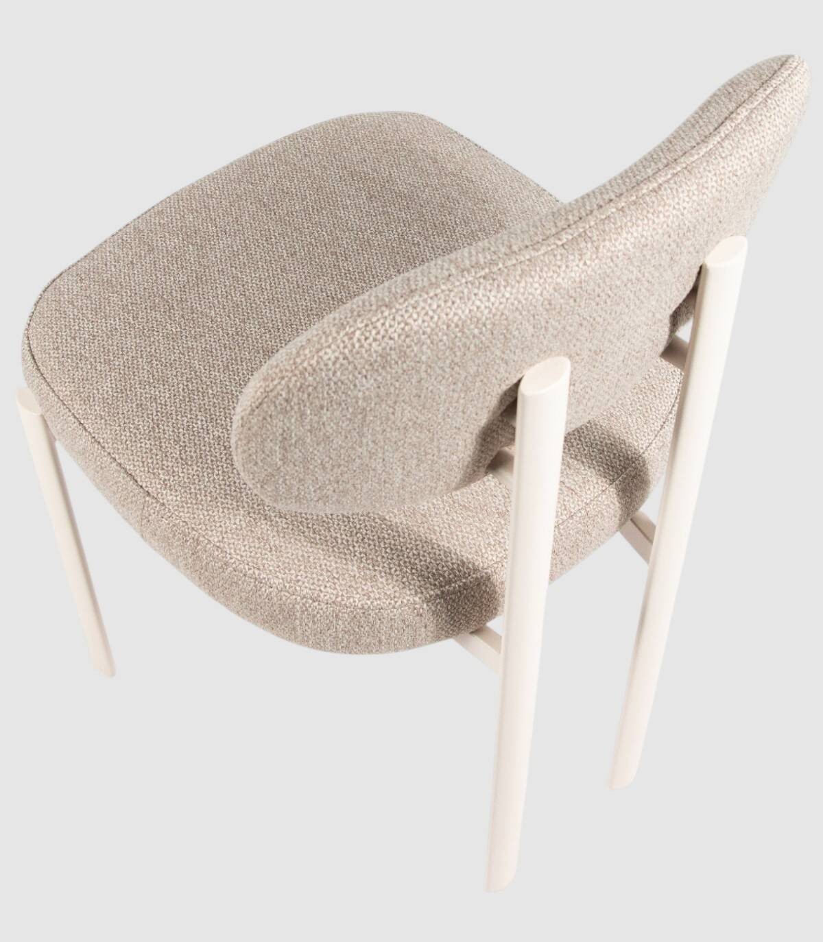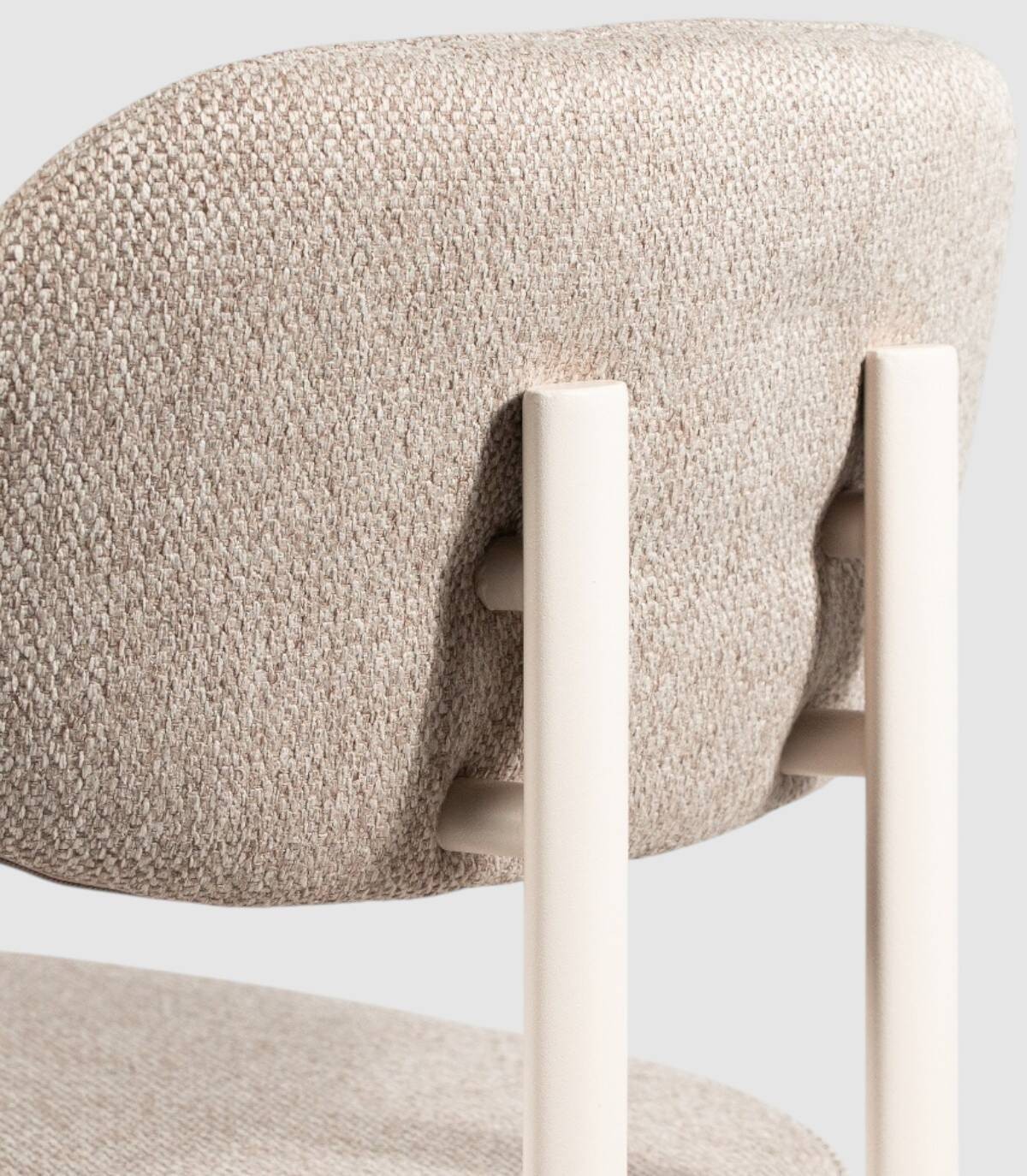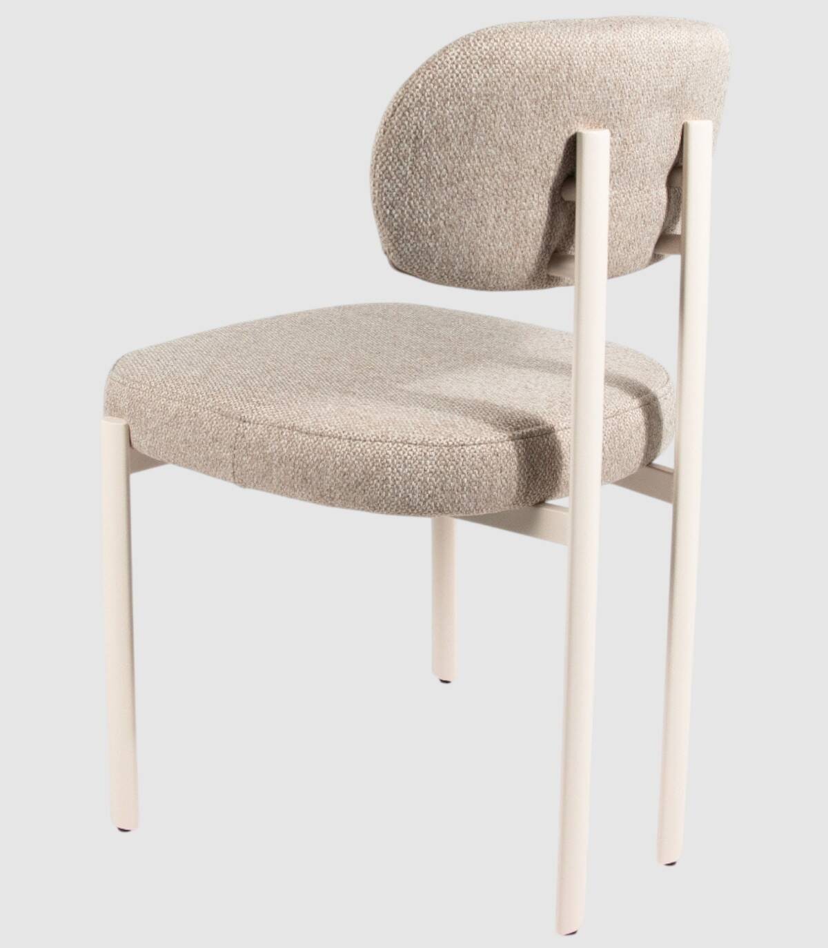 La silla Pretoria de comedor se compone de respaldo y asiento tapizado y patas metálicas pintadas de color marfil.