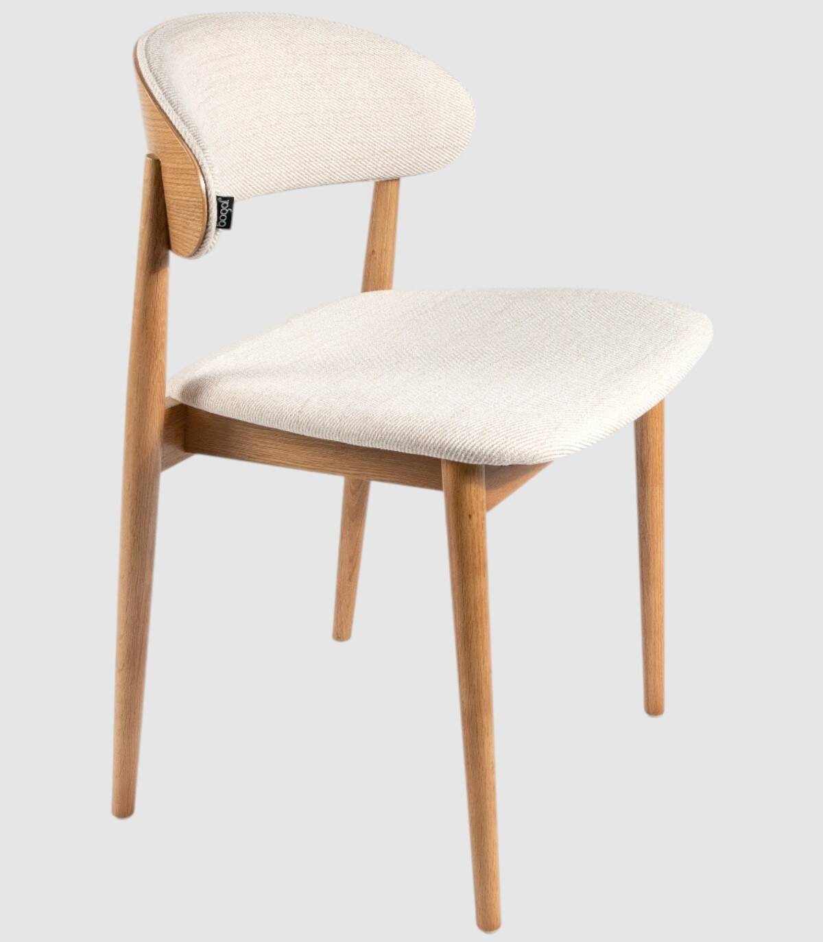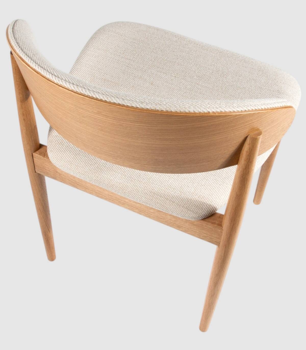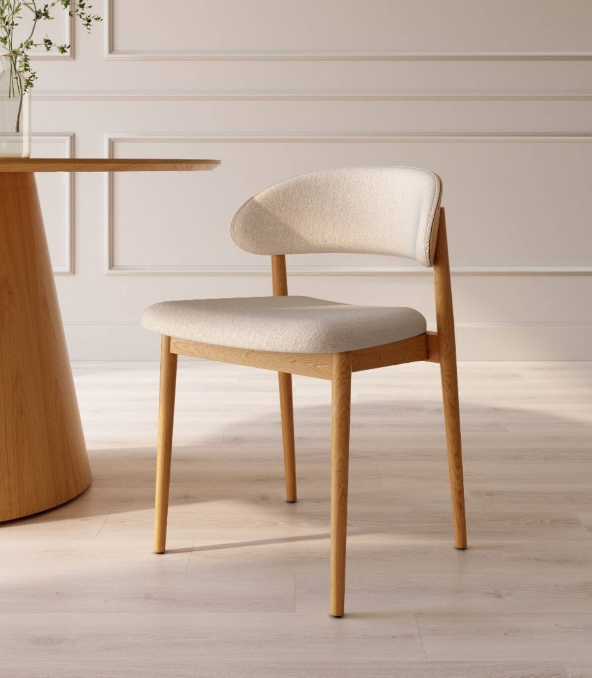 La silla Ariel de comedor se compone de respaldo de madera de color roble natural y tapizado, cuatro patas de madera y asiento tapizado.