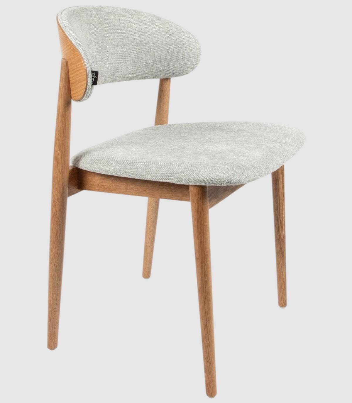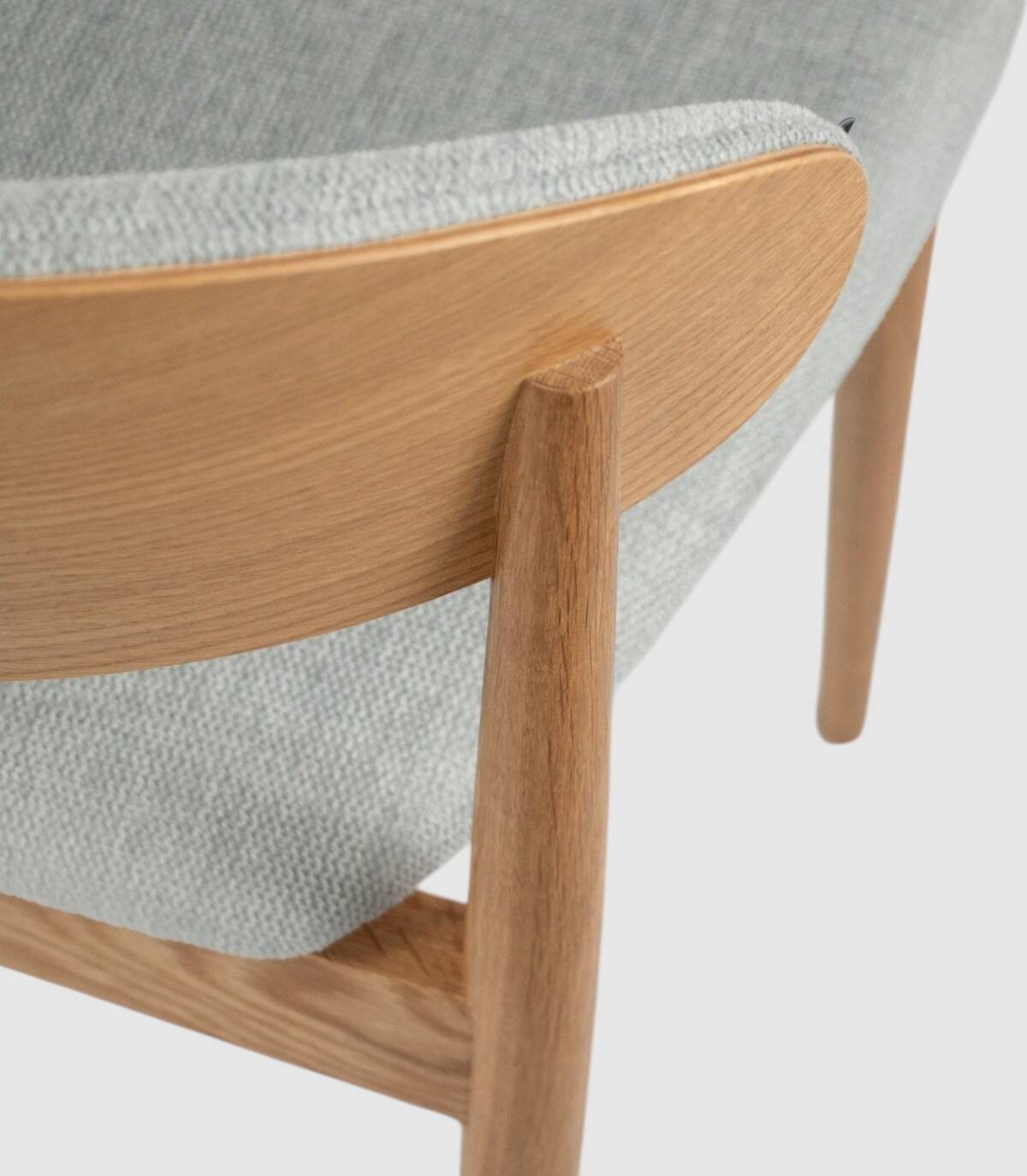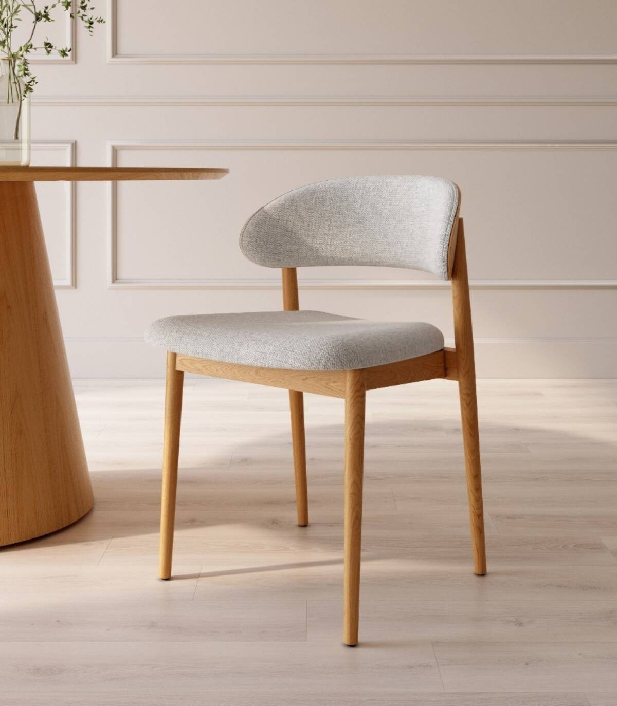 La silla Ariel de comedor se compone de respaldo de madera de color roble natural y tapizado, cuatro patas de madera y asiento tapizado.