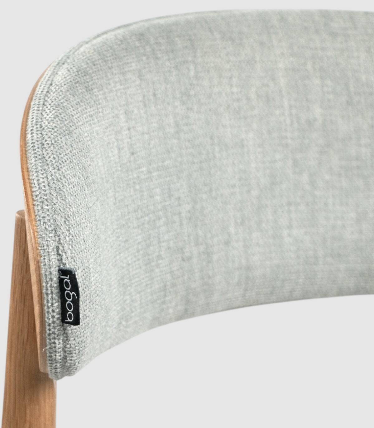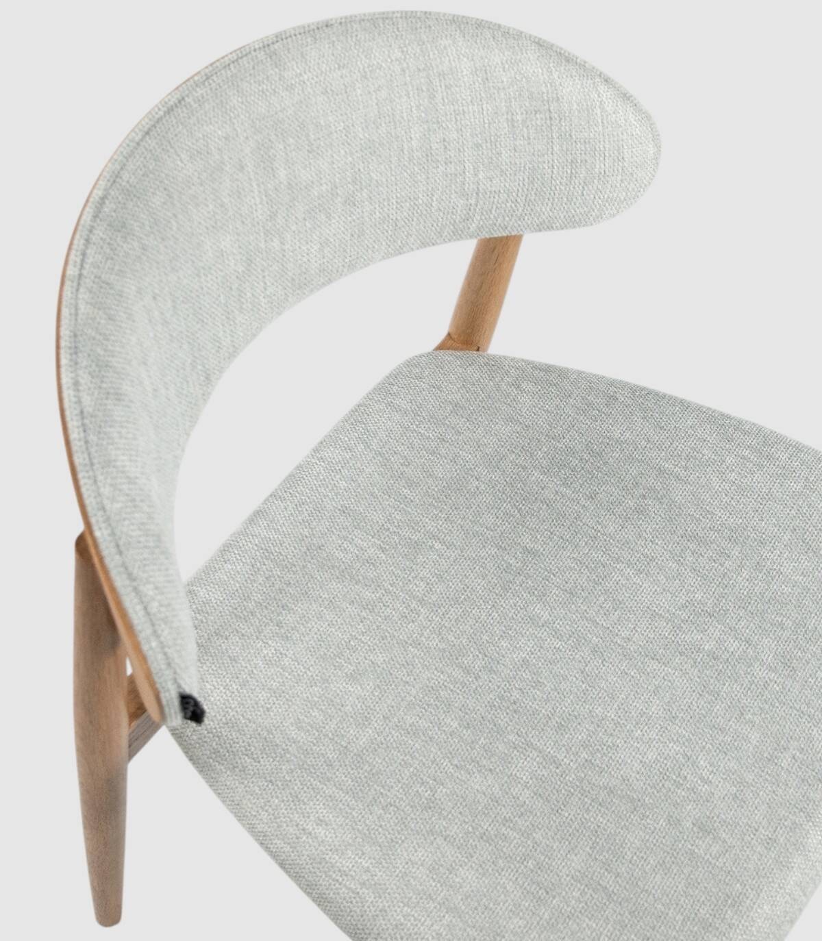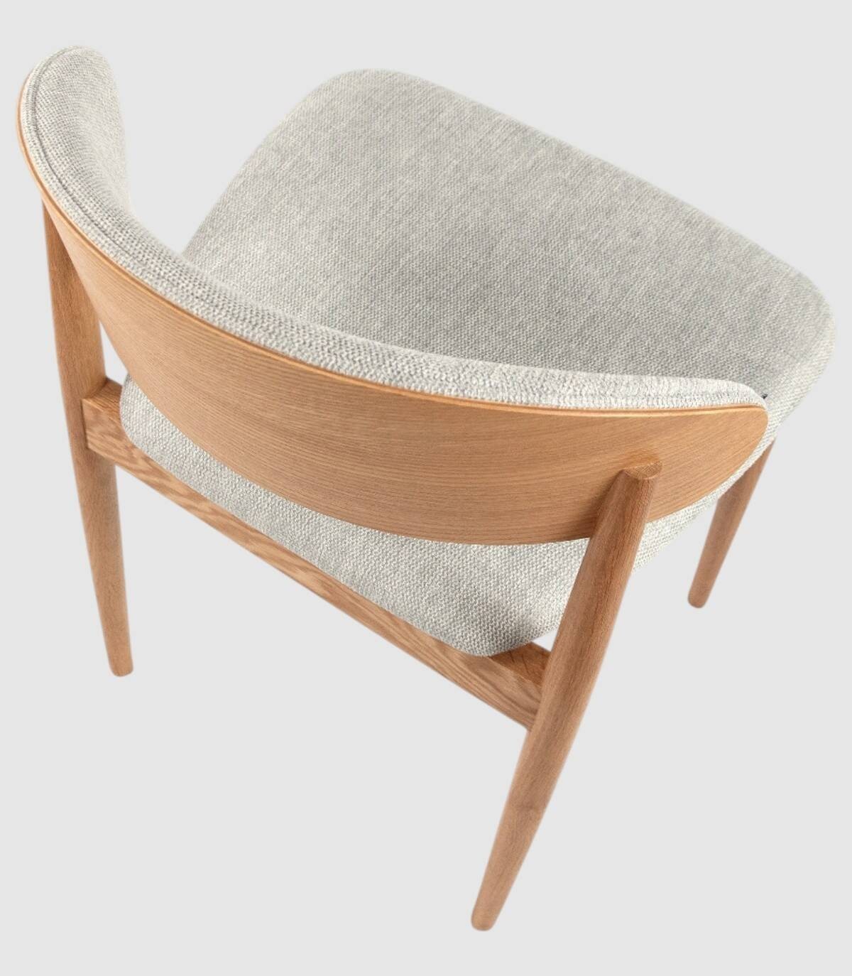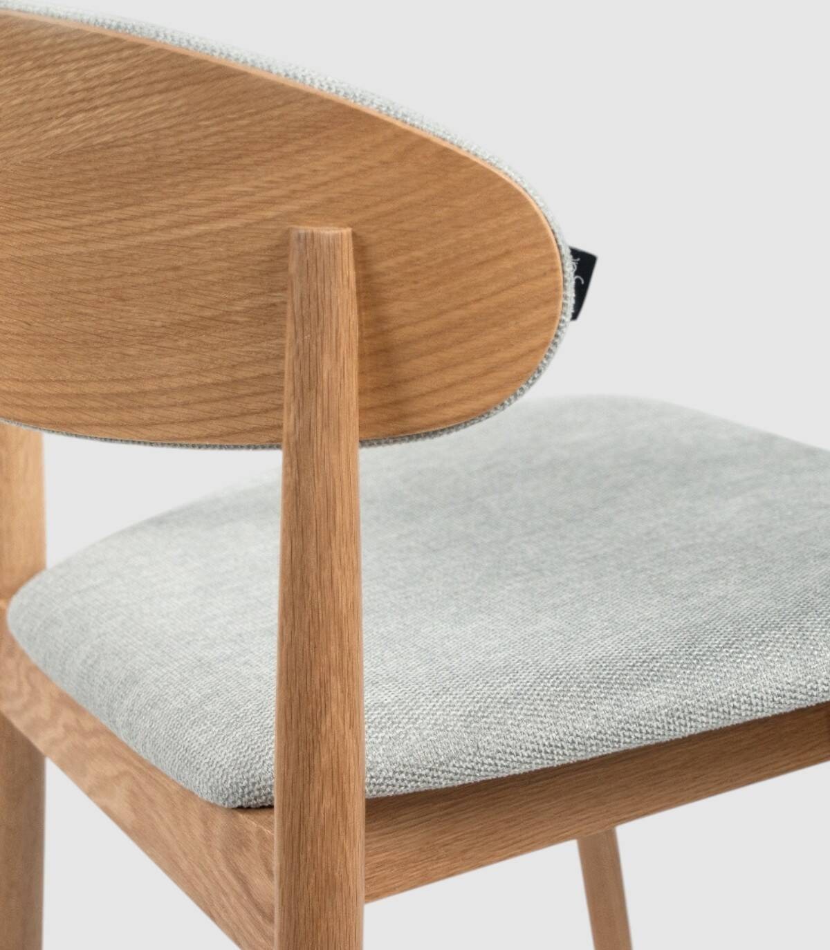La silla Ariel de comedor se compone de respaldo de madera de color roble natural y tapizado, cuatro patas de madera y asiento tapizado.