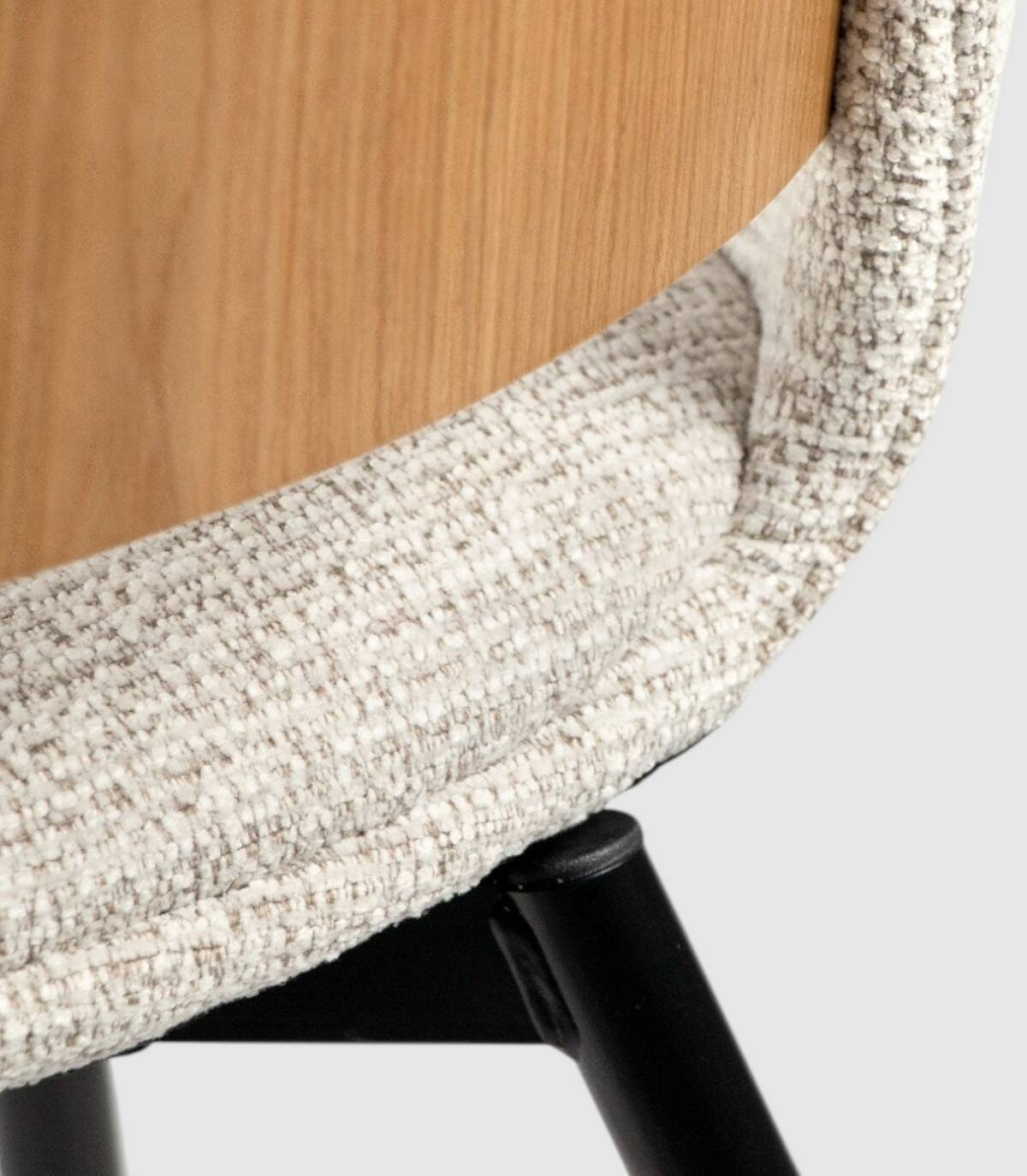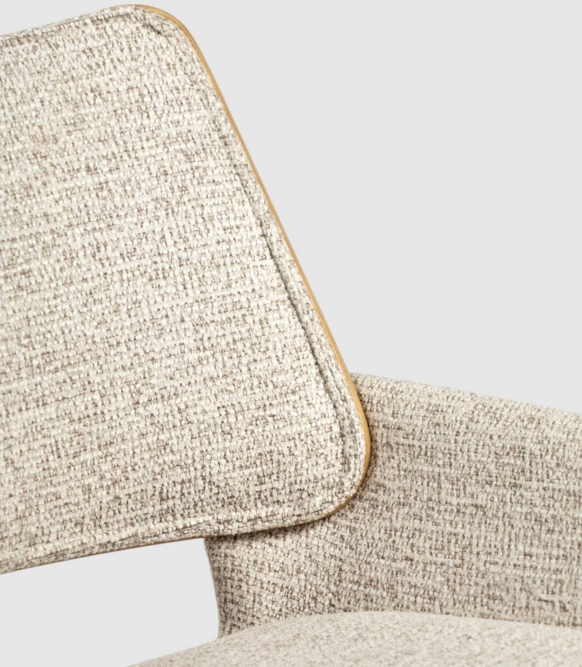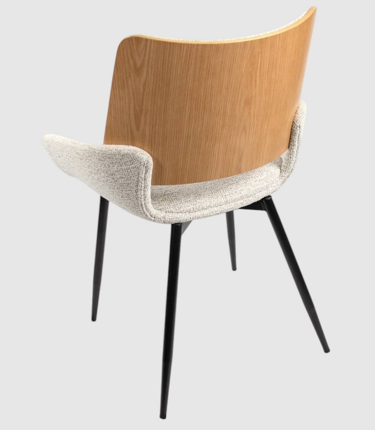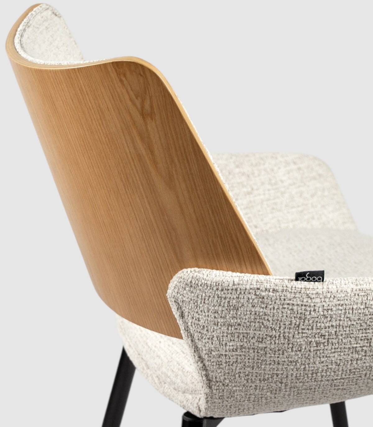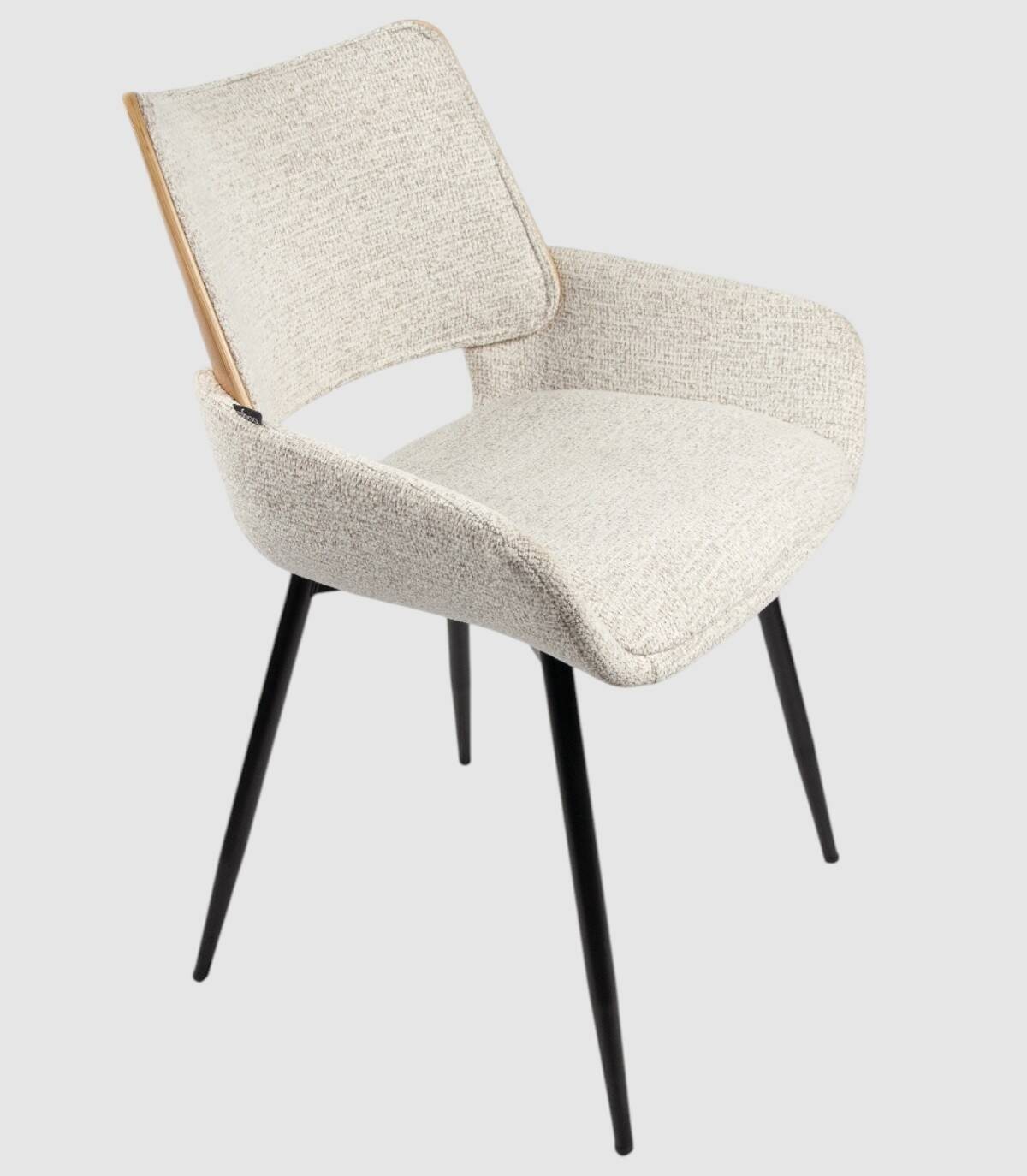 La silla Eva de comedor se compone de respaldo de madera de color roble natural y tapizado, cuatro patas metálicas negras, asiento y reposabrazos tapizados.