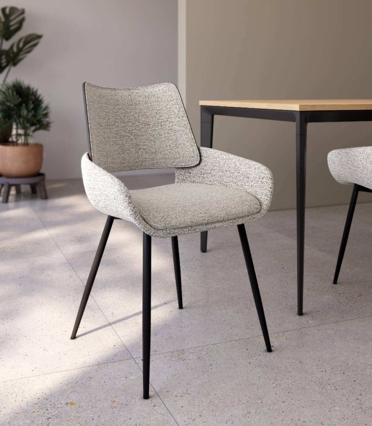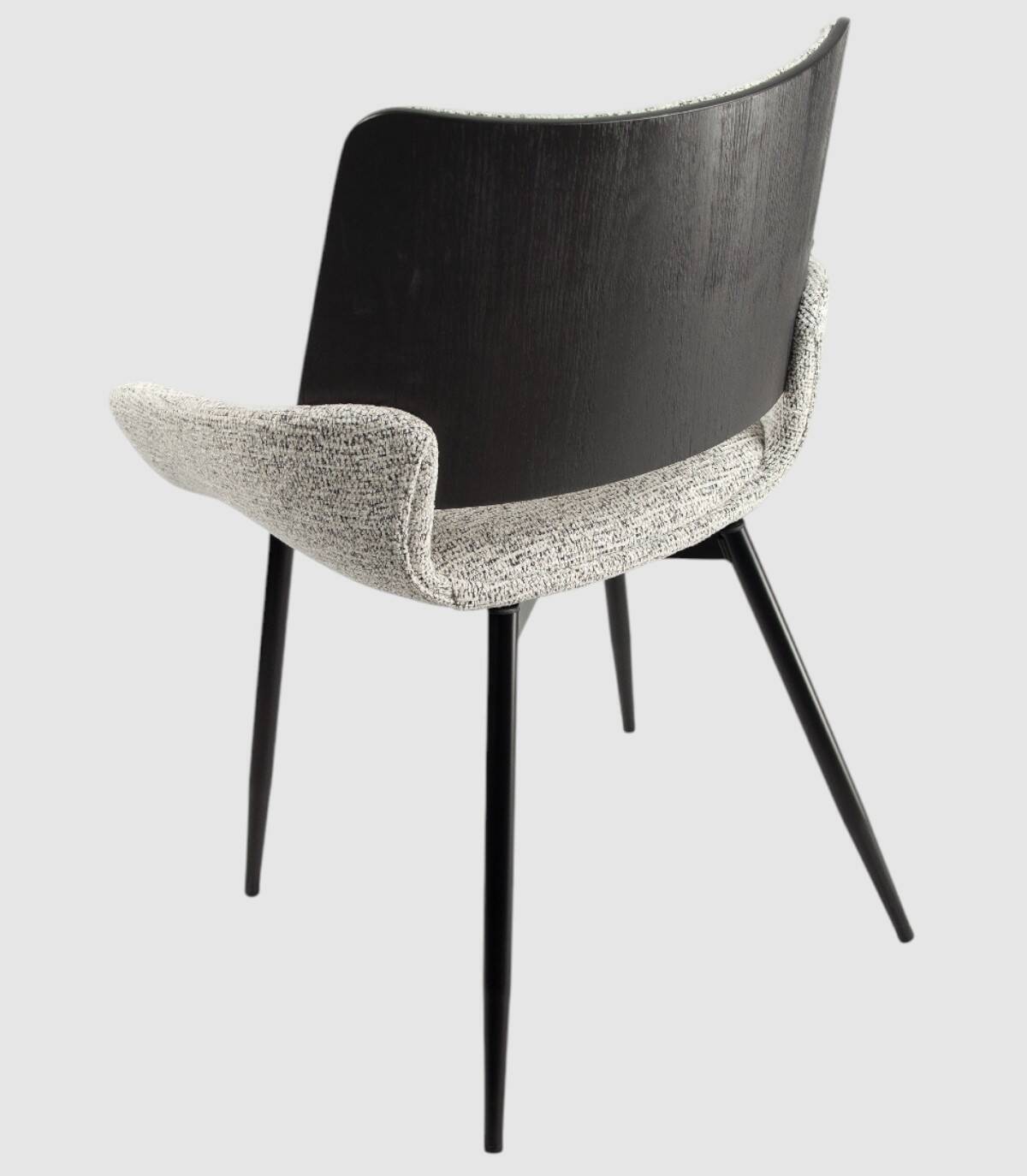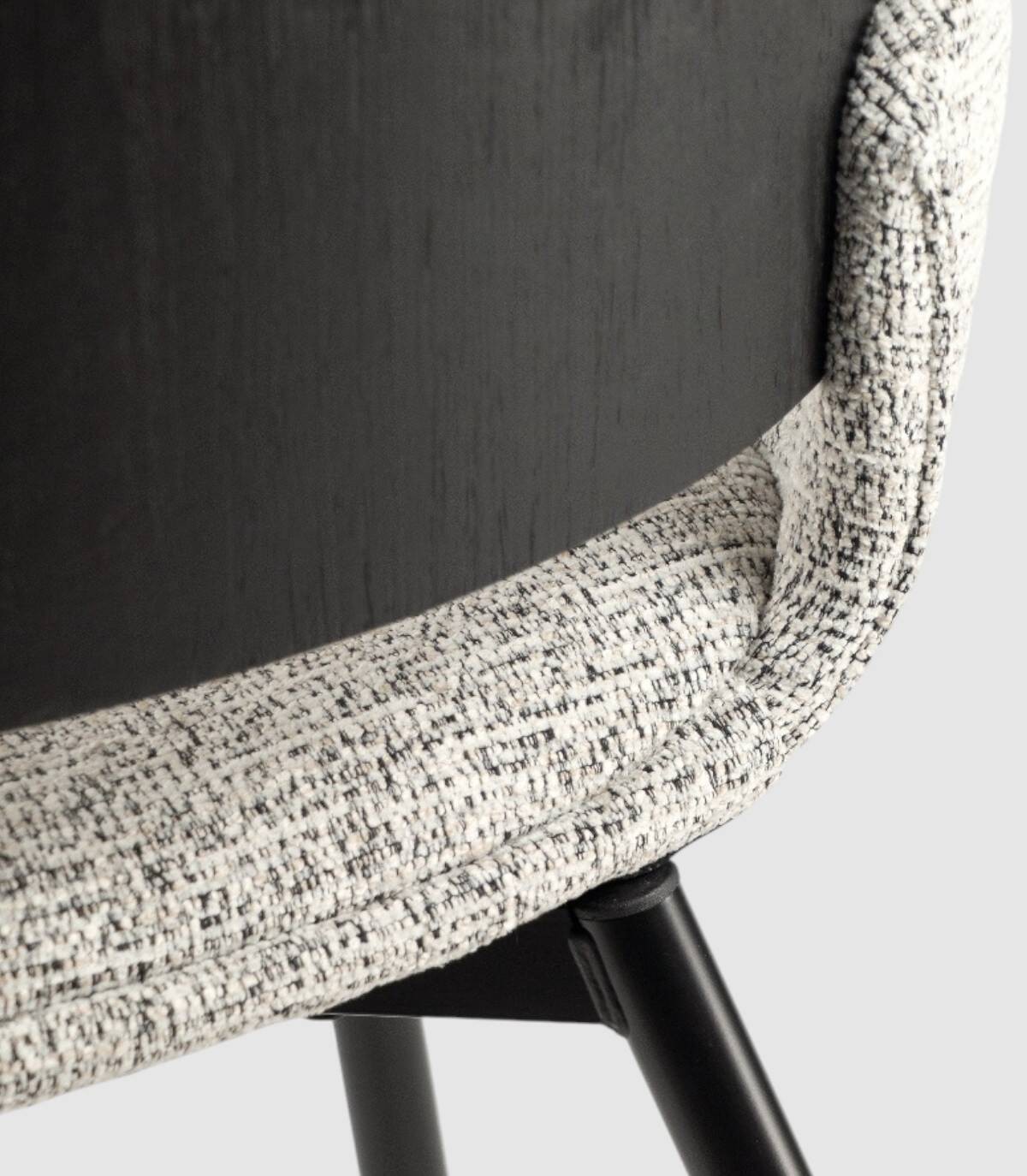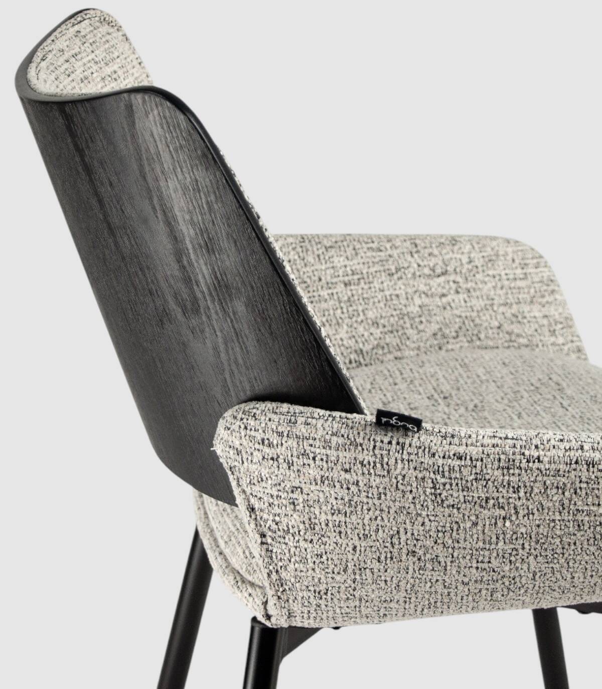 La silla Eva de comedor se compone de respaldo de madera de color roble negro y tapizado, cuatro patas metálicas negras, asiento y reposabrazos tapizados.