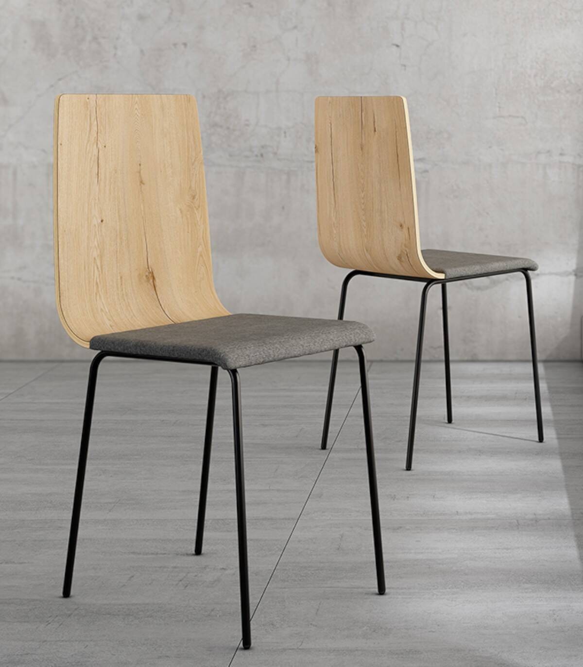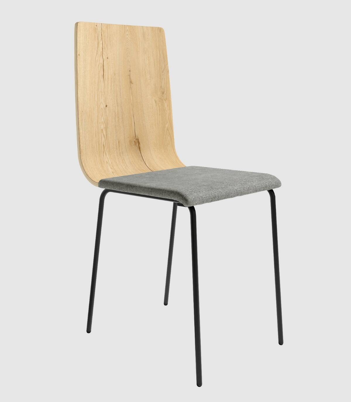 La silla Dubai con asiento tapizado gris y respaldo de madera contrachapada, de diseño elegante y moderno, tiene una estructura de cuatro patas metálicas pintadas de color negro.