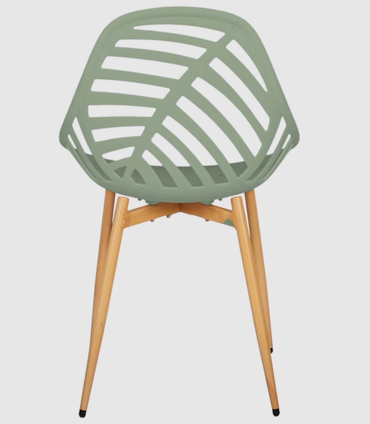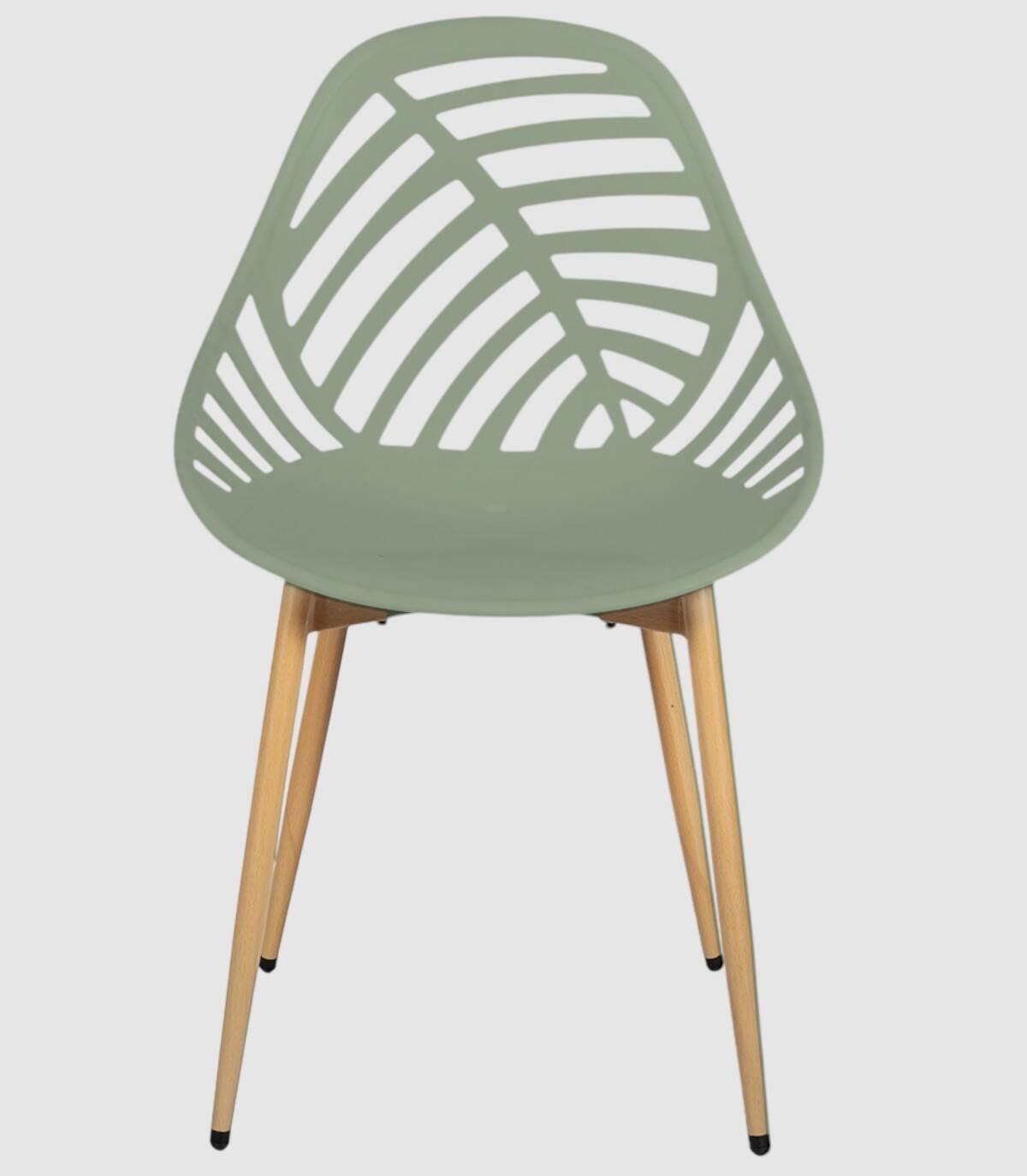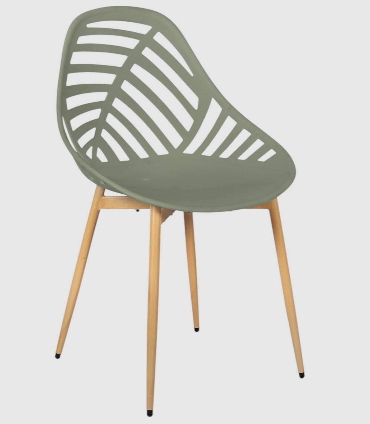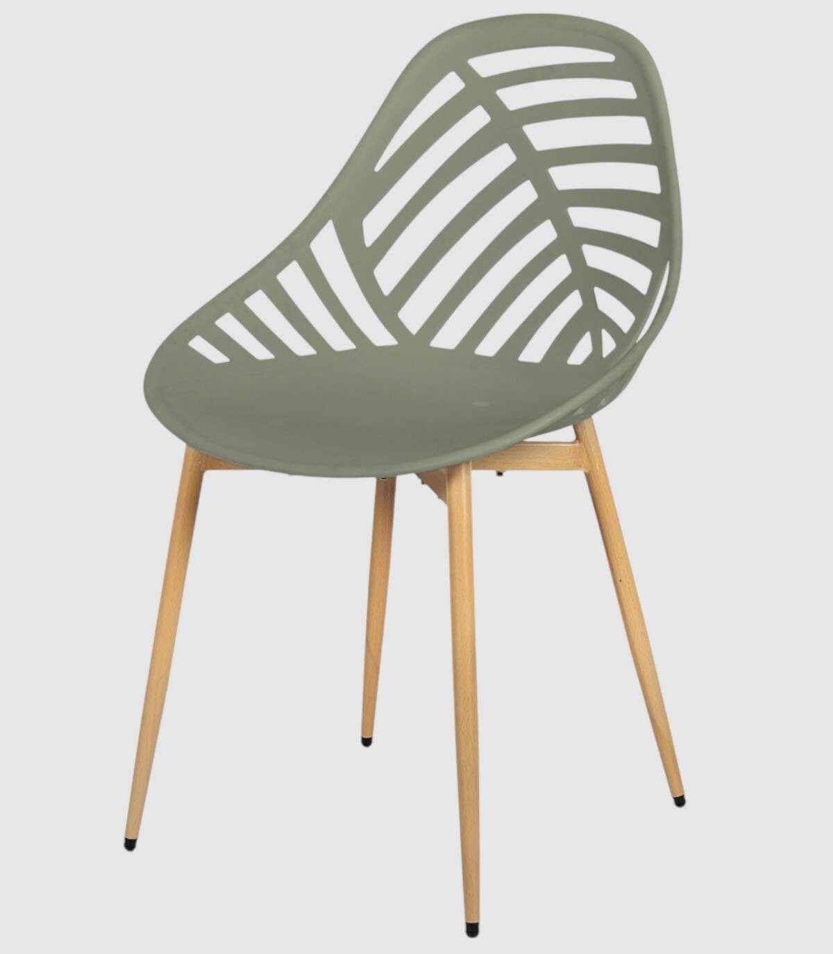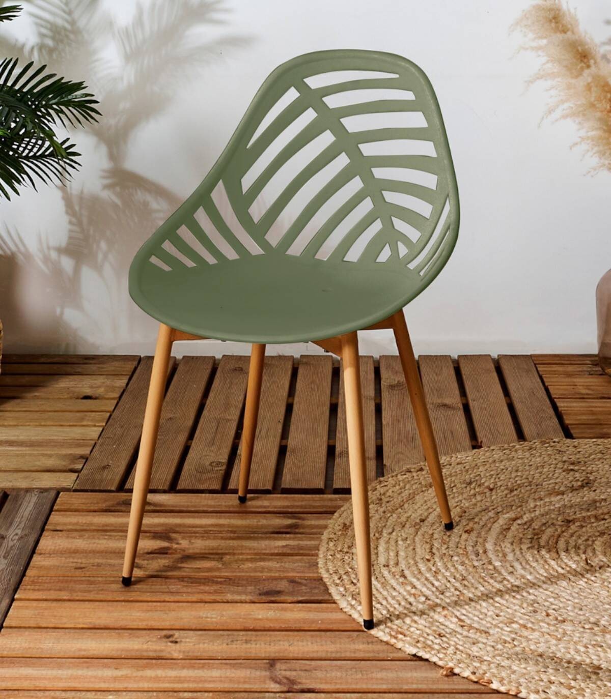 La silla Alameda se compone de asiento y respaldo de una pieza de plástico PP con perforaciones de dibujos de hojas y patas de hierro de color beige. En la terraza o el jardín, relájate en esta cómoda silla para exteriores.