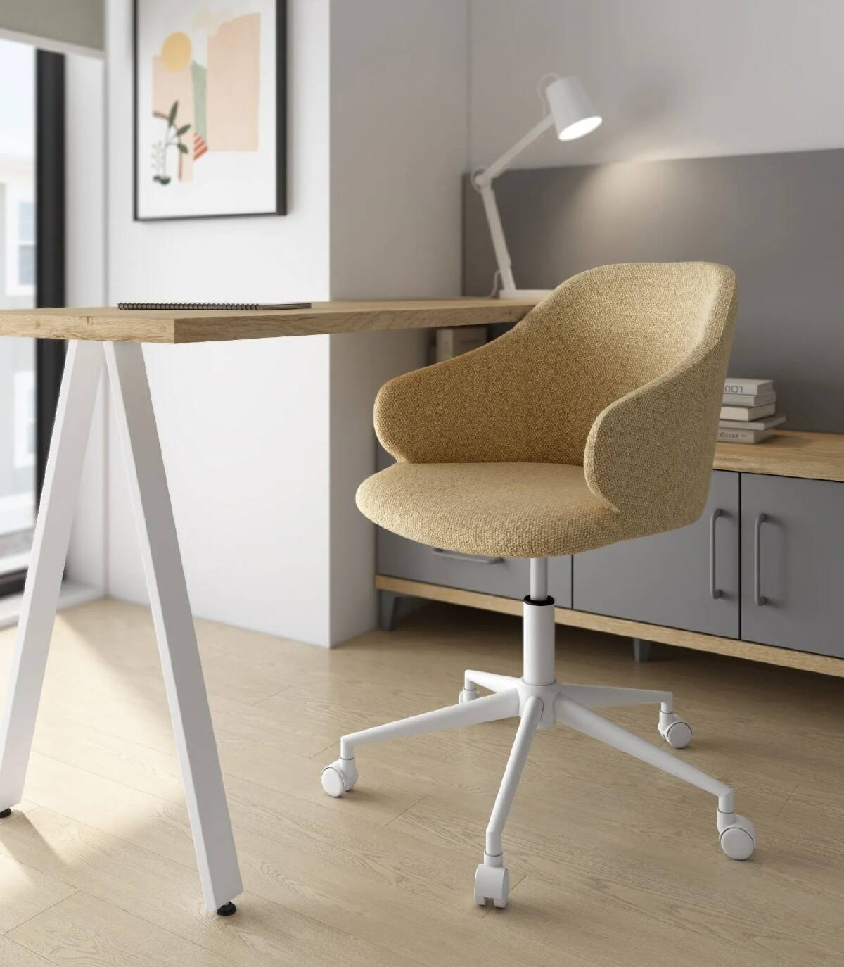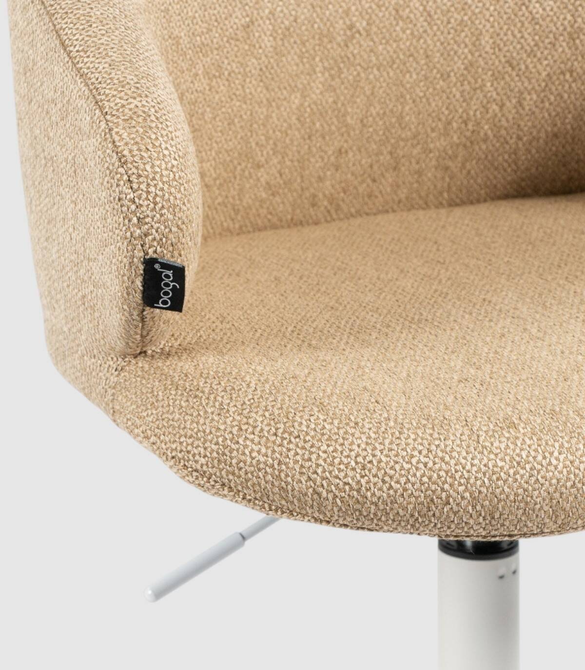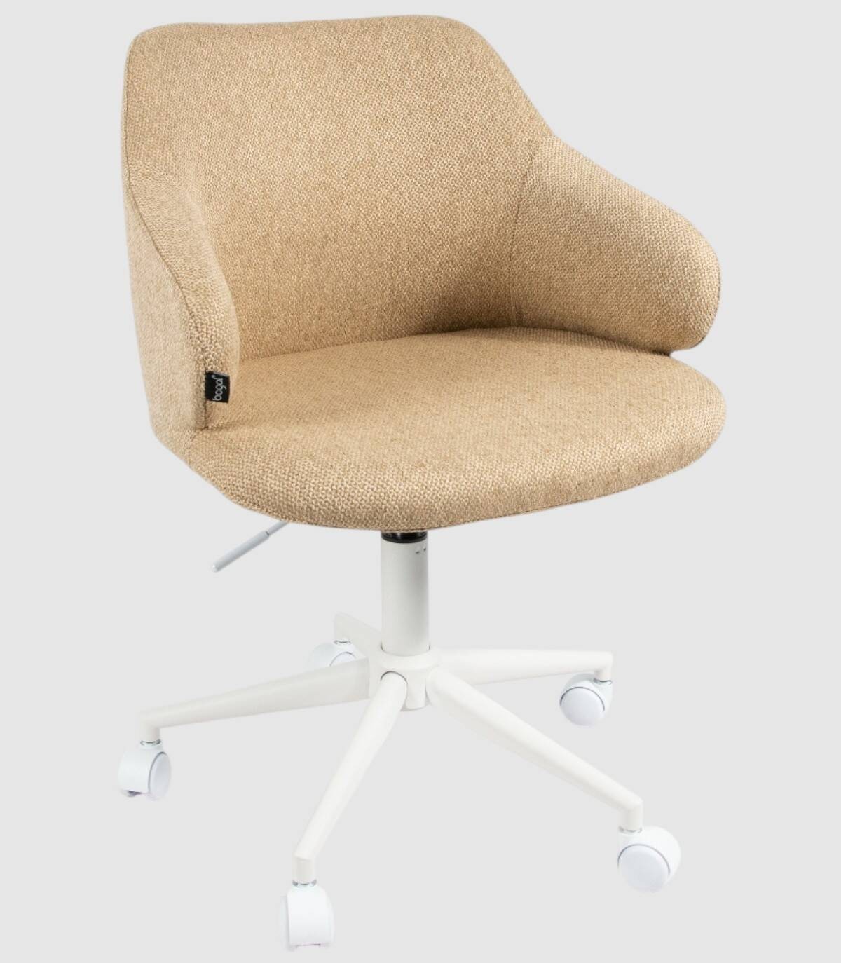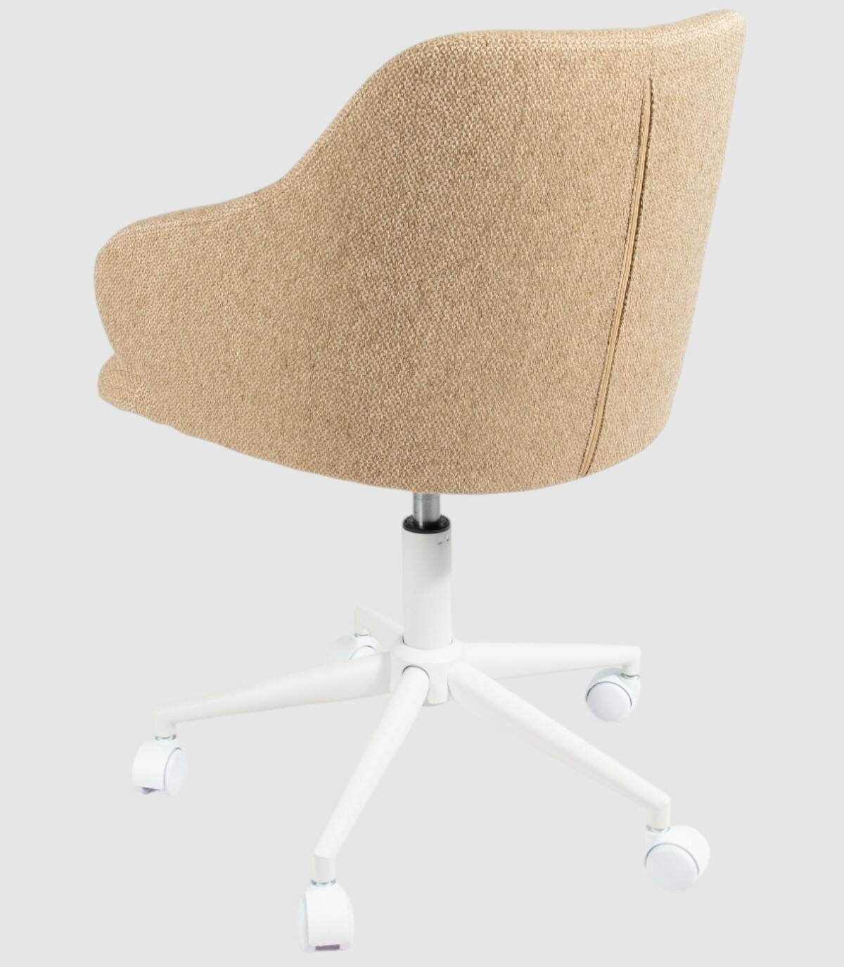 La silla Zurich elevable giratoria 360 grados de escritorio y oficina se compone de respaldo, asiento, reposabrazos tapizado y cinco patas metálicas blancas con ruedas.