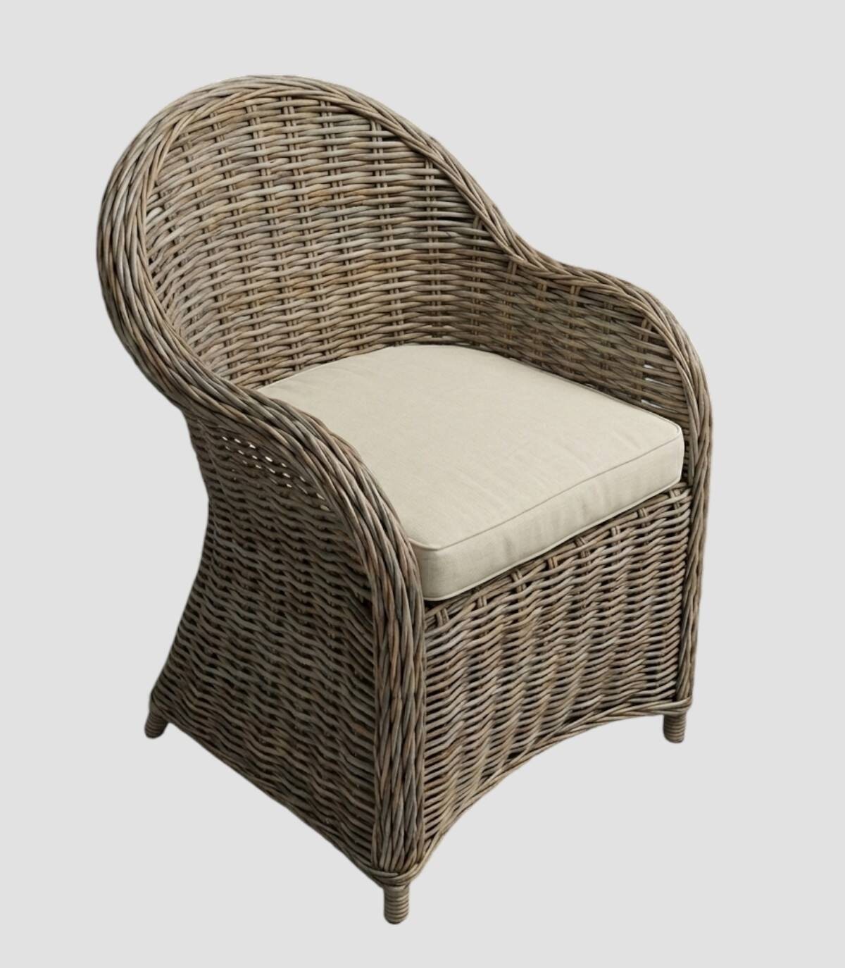La silla Anigor está fabricada con una trama de ratán natural con respaldo y reposabrazos con forma redondeada. Incluye cojín color blanco.