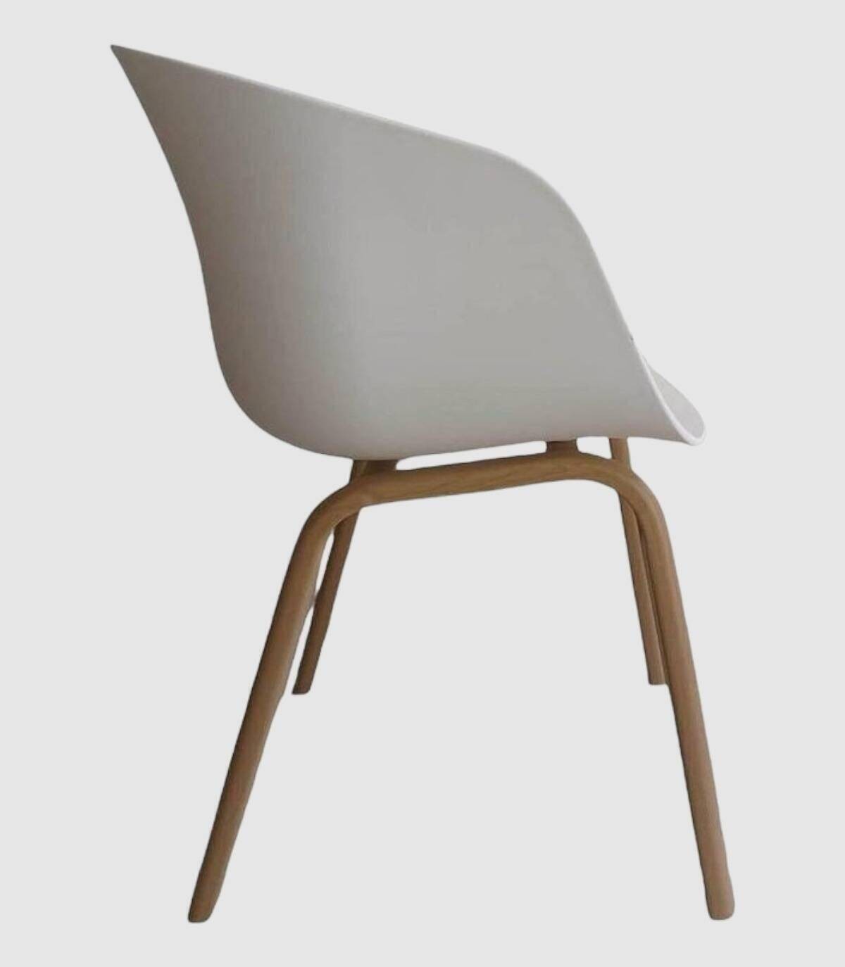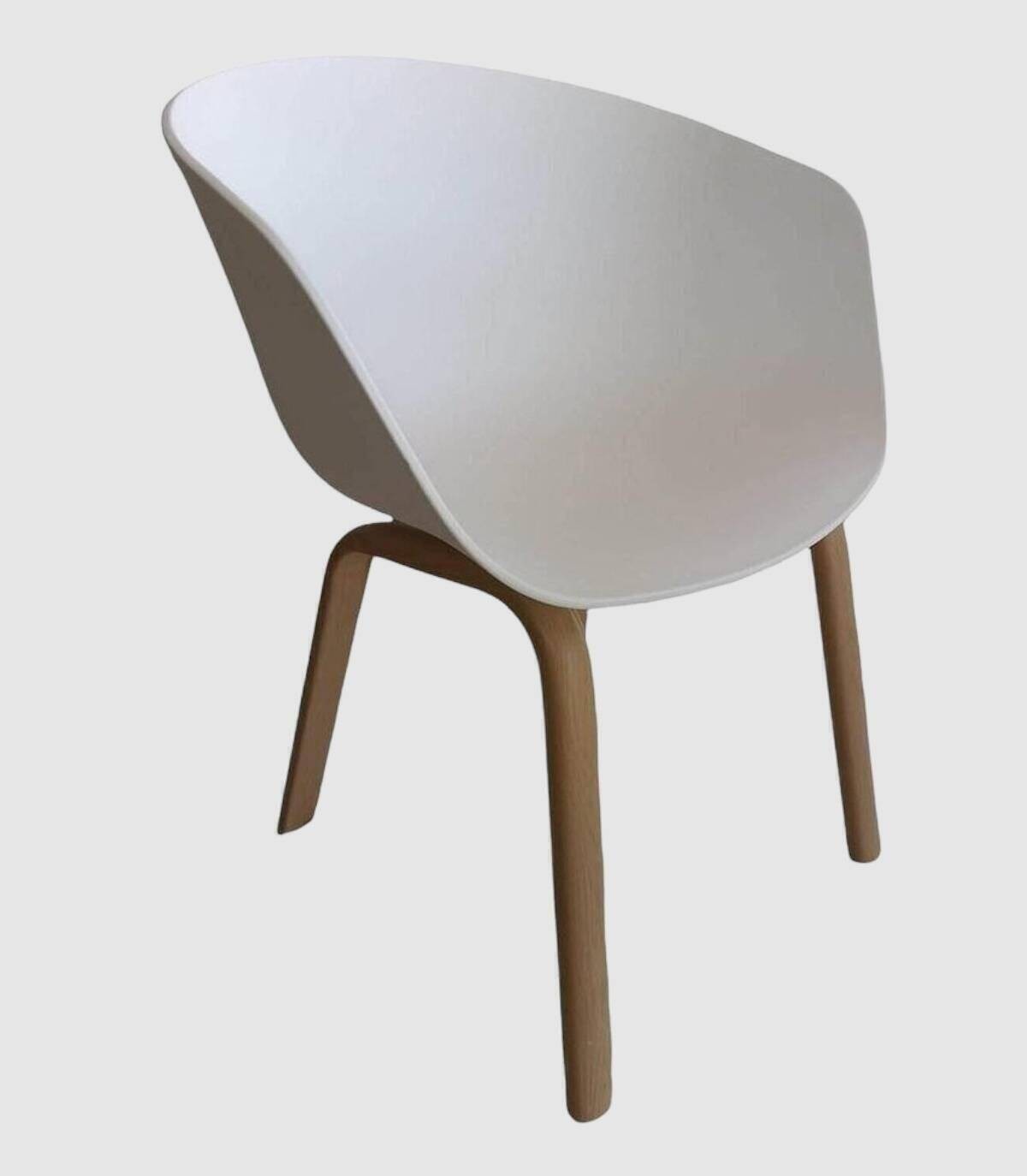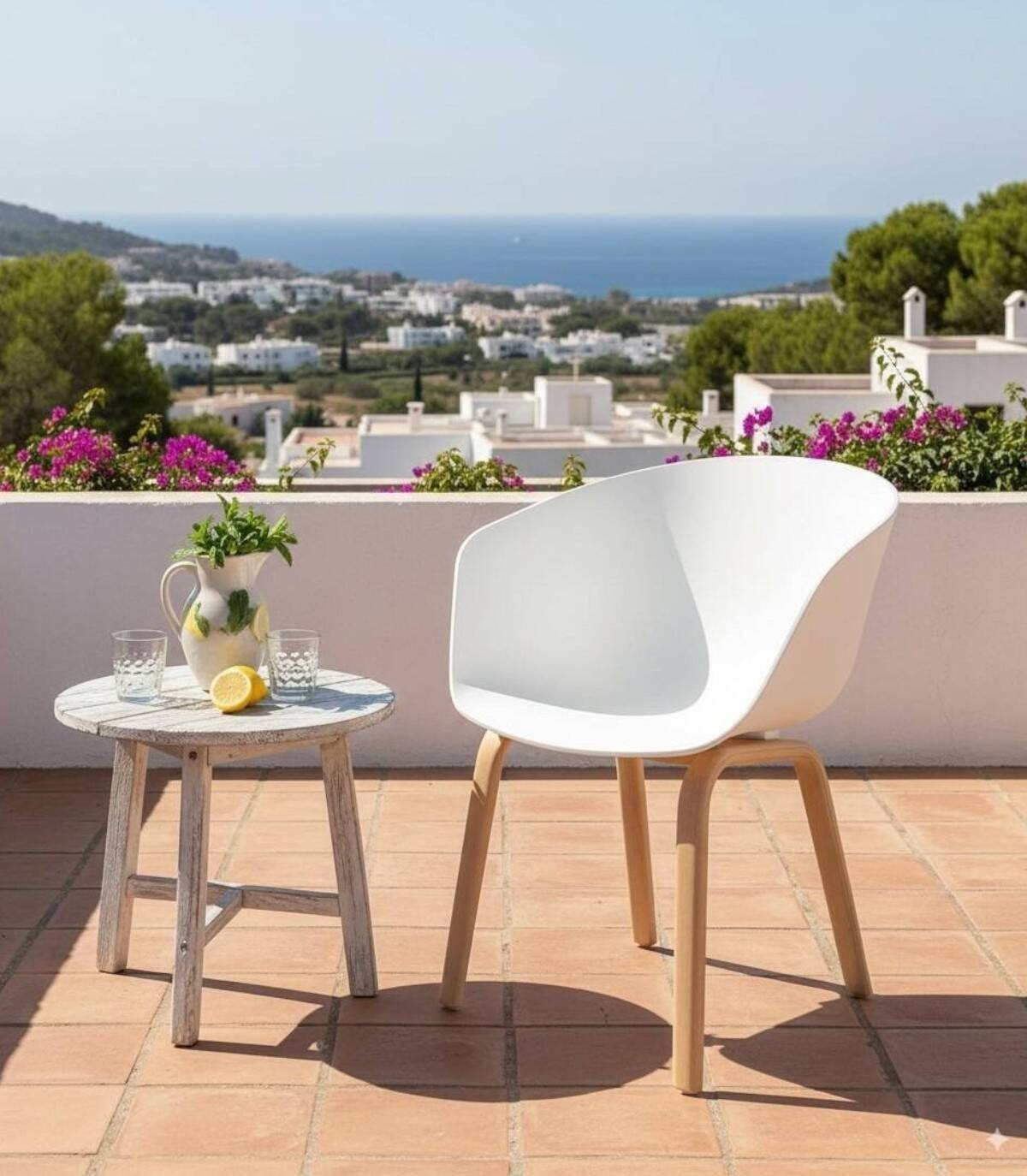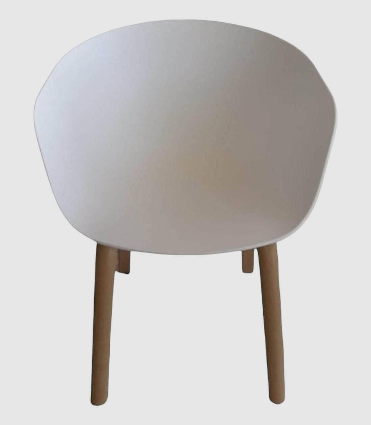 La silla Goa está compuesta por un asiento blanco de polipropileno fiberglass tratado anti-UV sobre 4 patas con tapones antideslizantes hechas de aluminio con revestimiento en polvo (poliéster) de color madera, perfecto para usar en las cocinas o en las terrazas ya que tiene tratiemnto de conta Uv contra el sol.