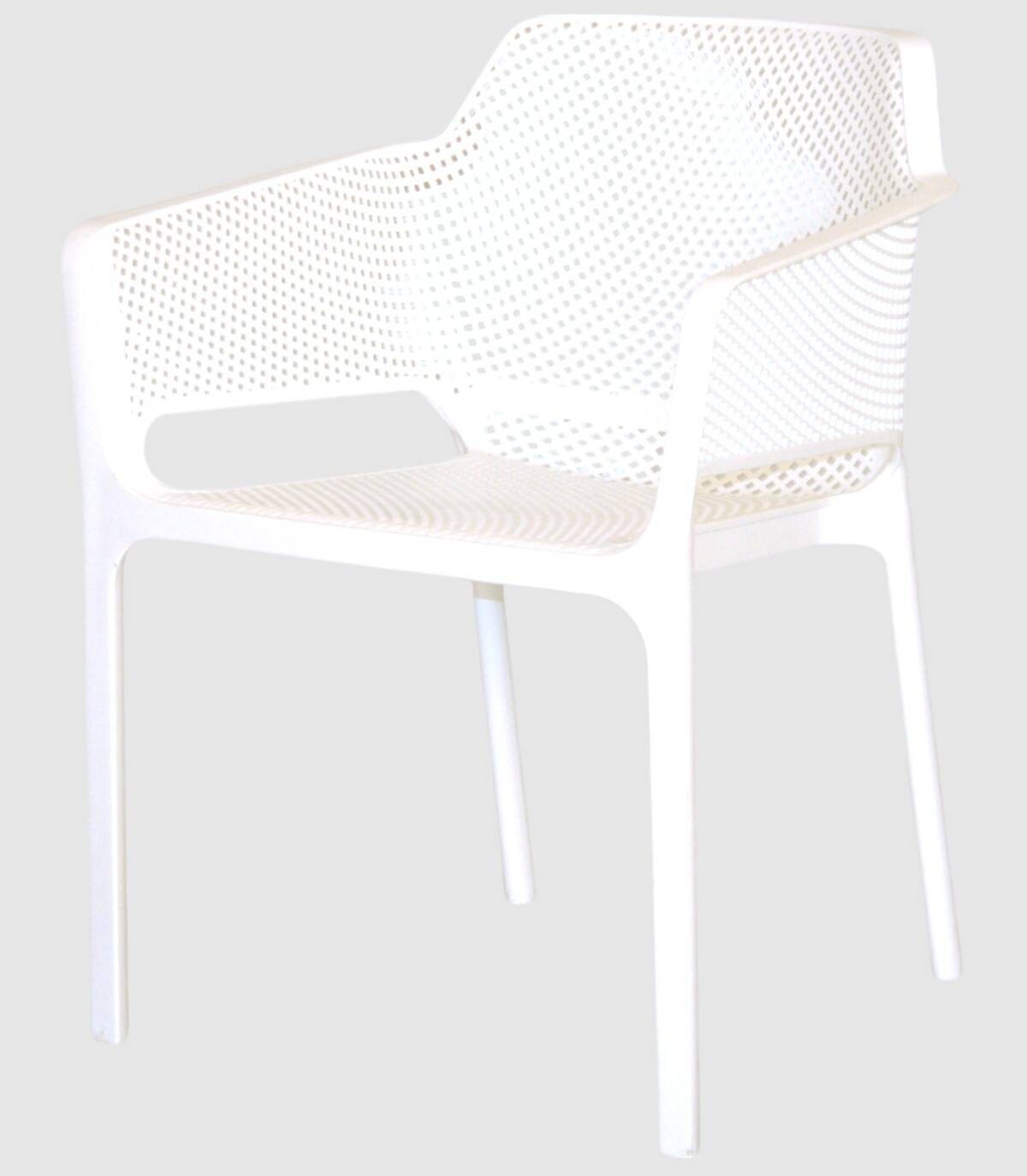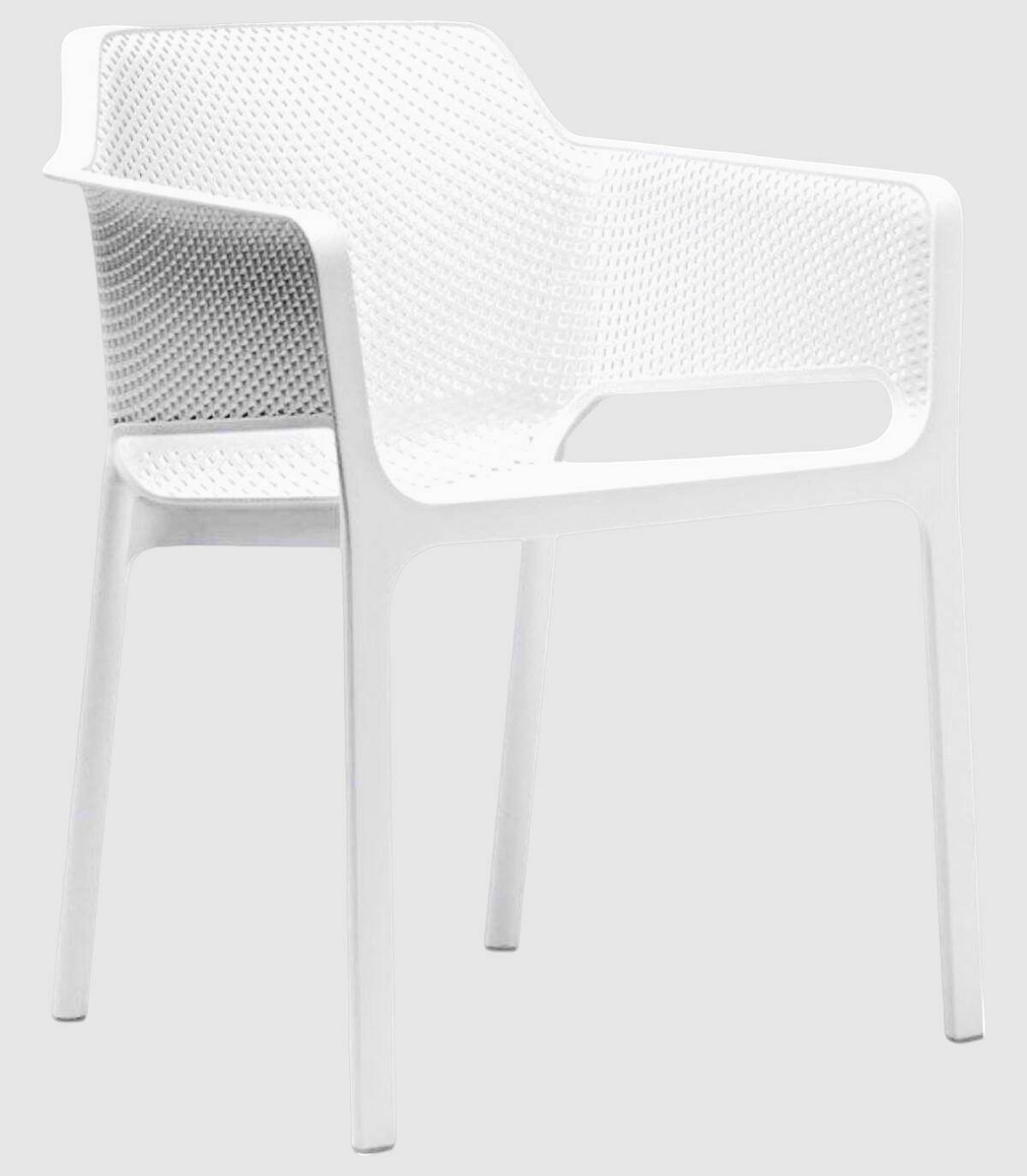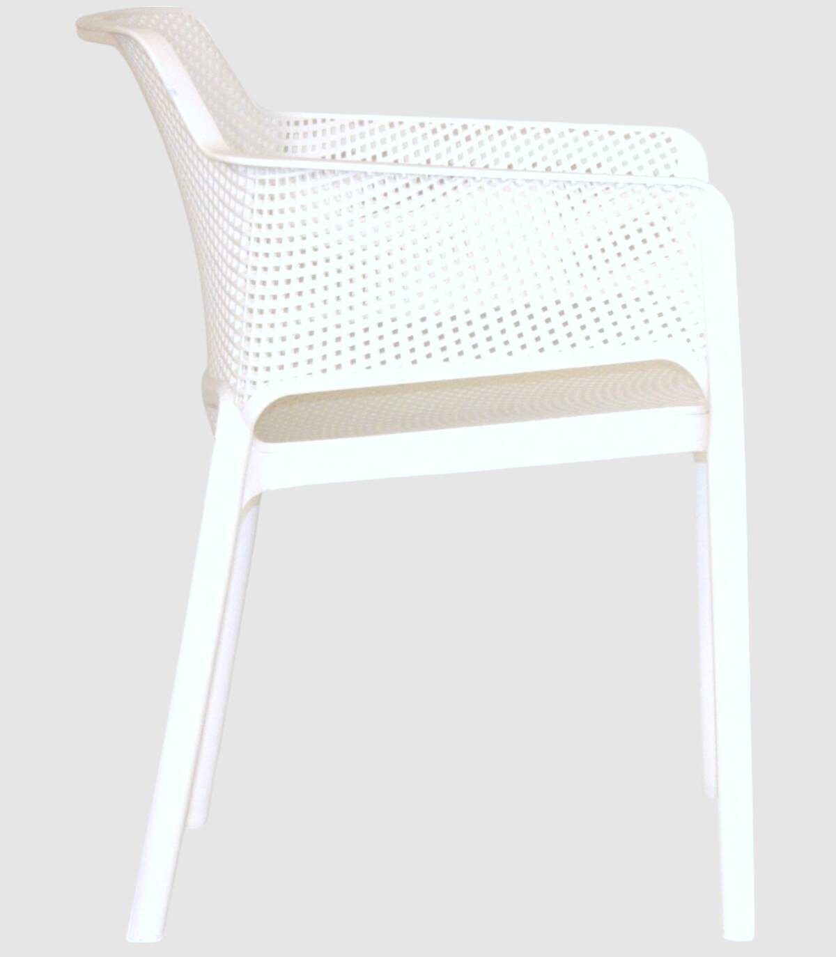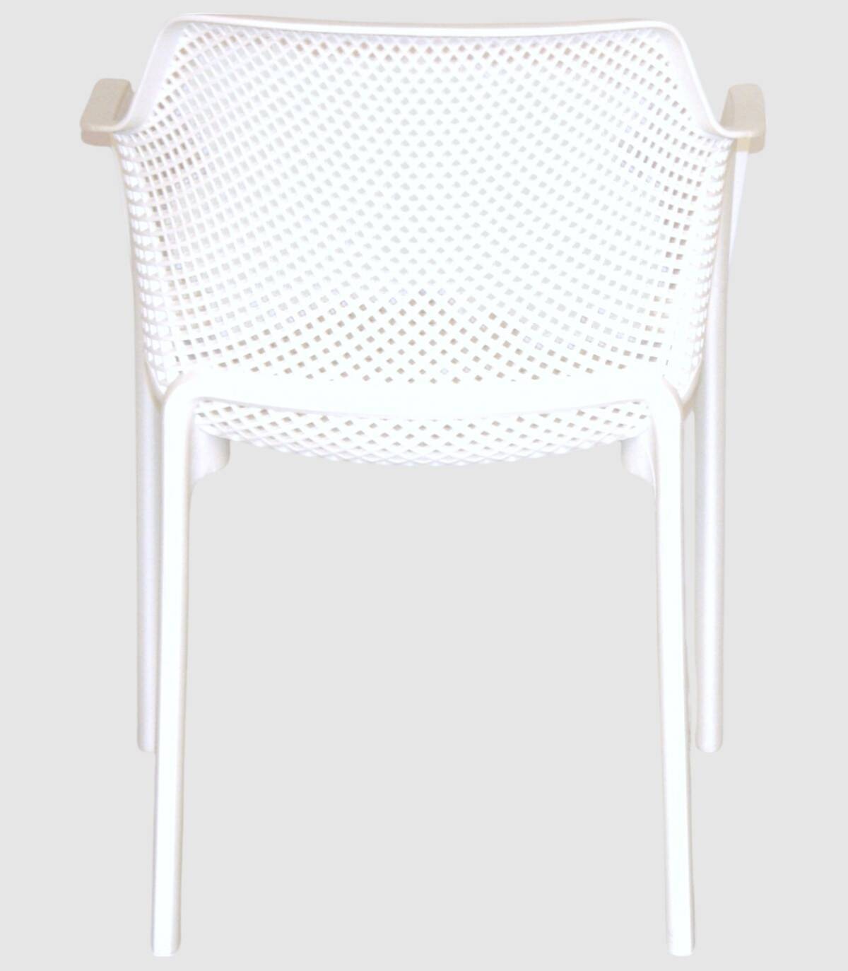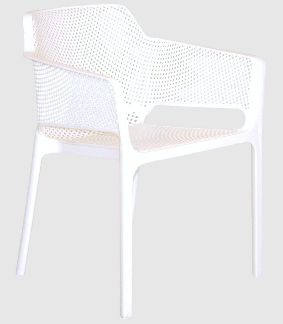 La silla Kabul con brazos tiene una estructura fabricada en polipropileno tratado anti-UV y teñido en masa, resina reciclable efecto mate de fibra de vidrio. Todas las patas tienen tapones antideslizantes.