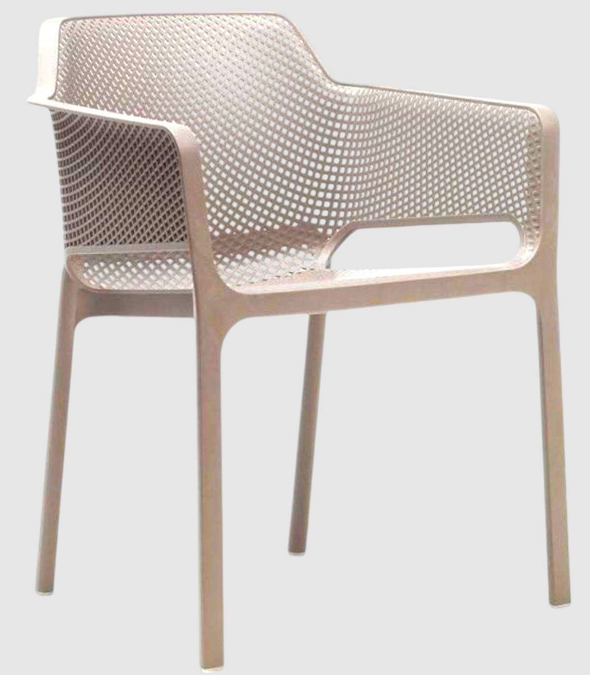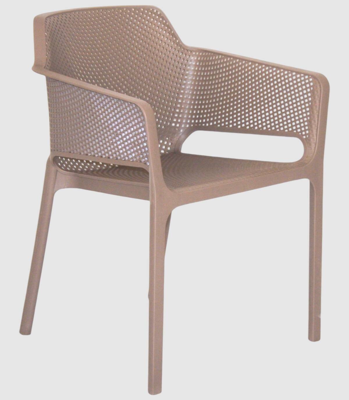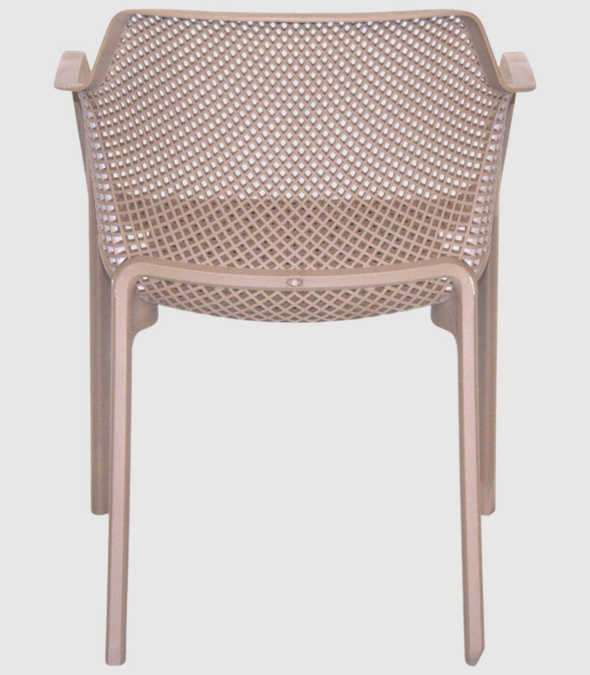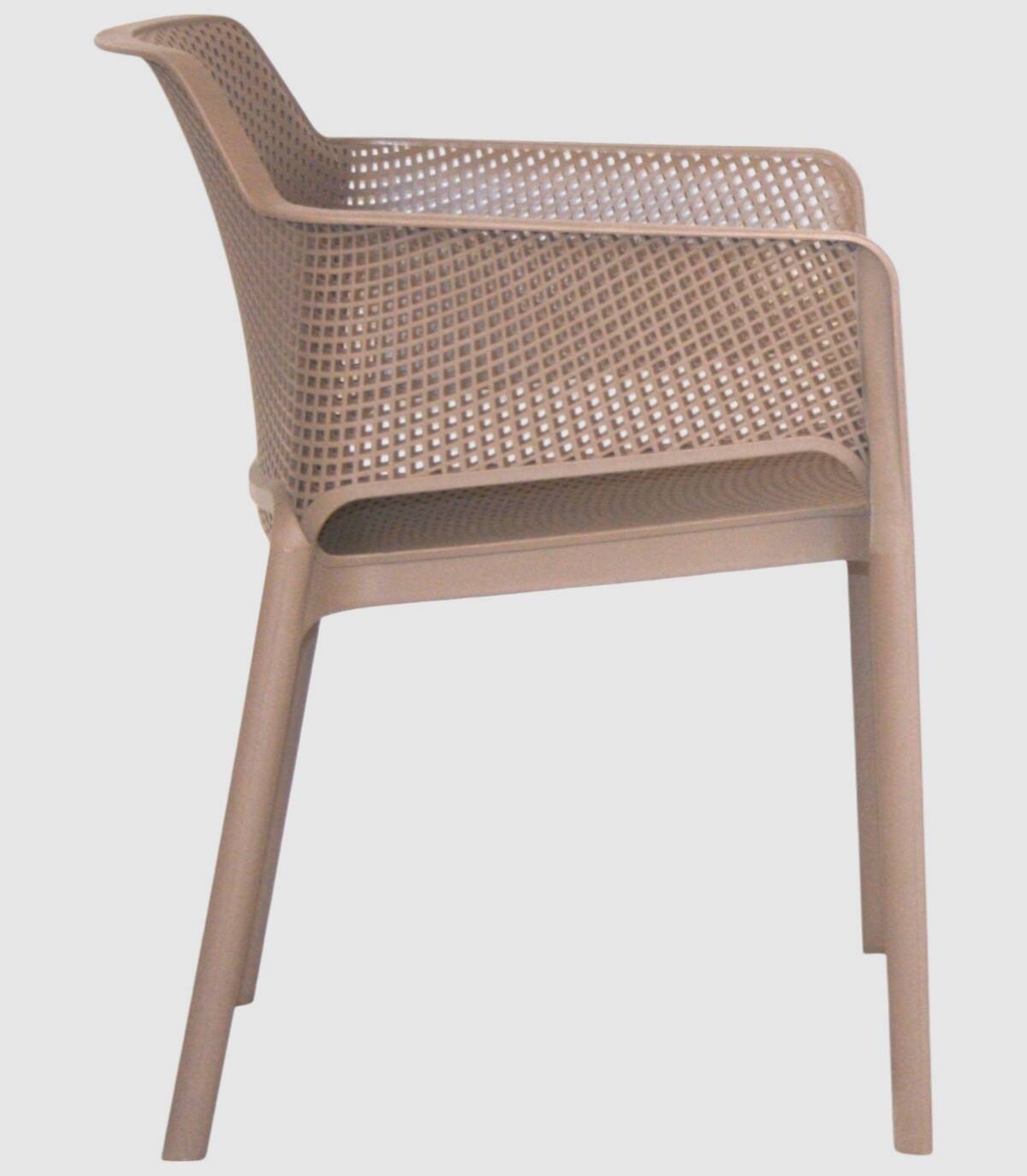La silla Kabul con brazos tiene una estructura fabricada en polipropileno tratado anti-UV y teñido en masa, resina reciclable efecto mate de fibra de vidrio. Todas las patas tienen tapones antideslizantes.