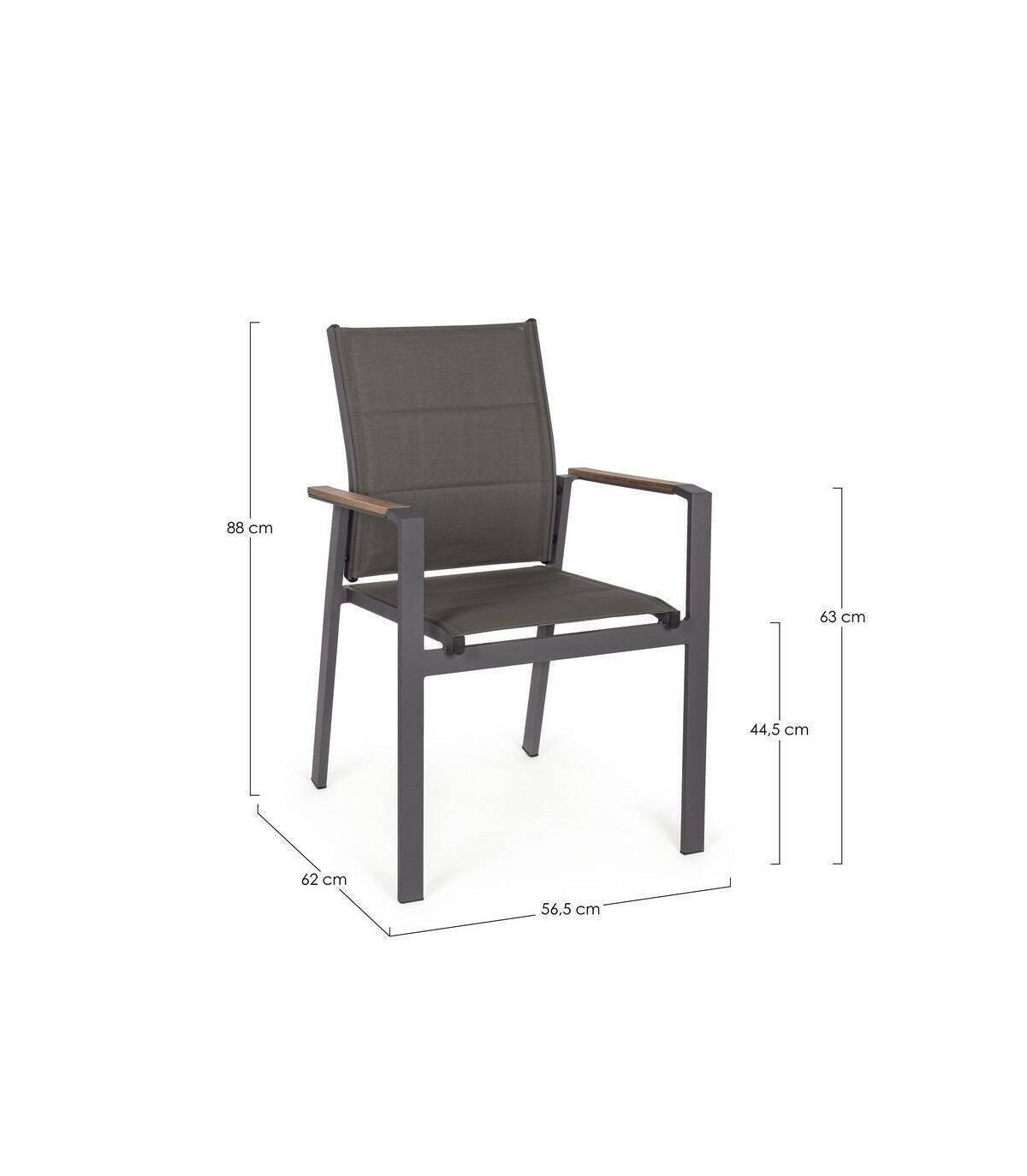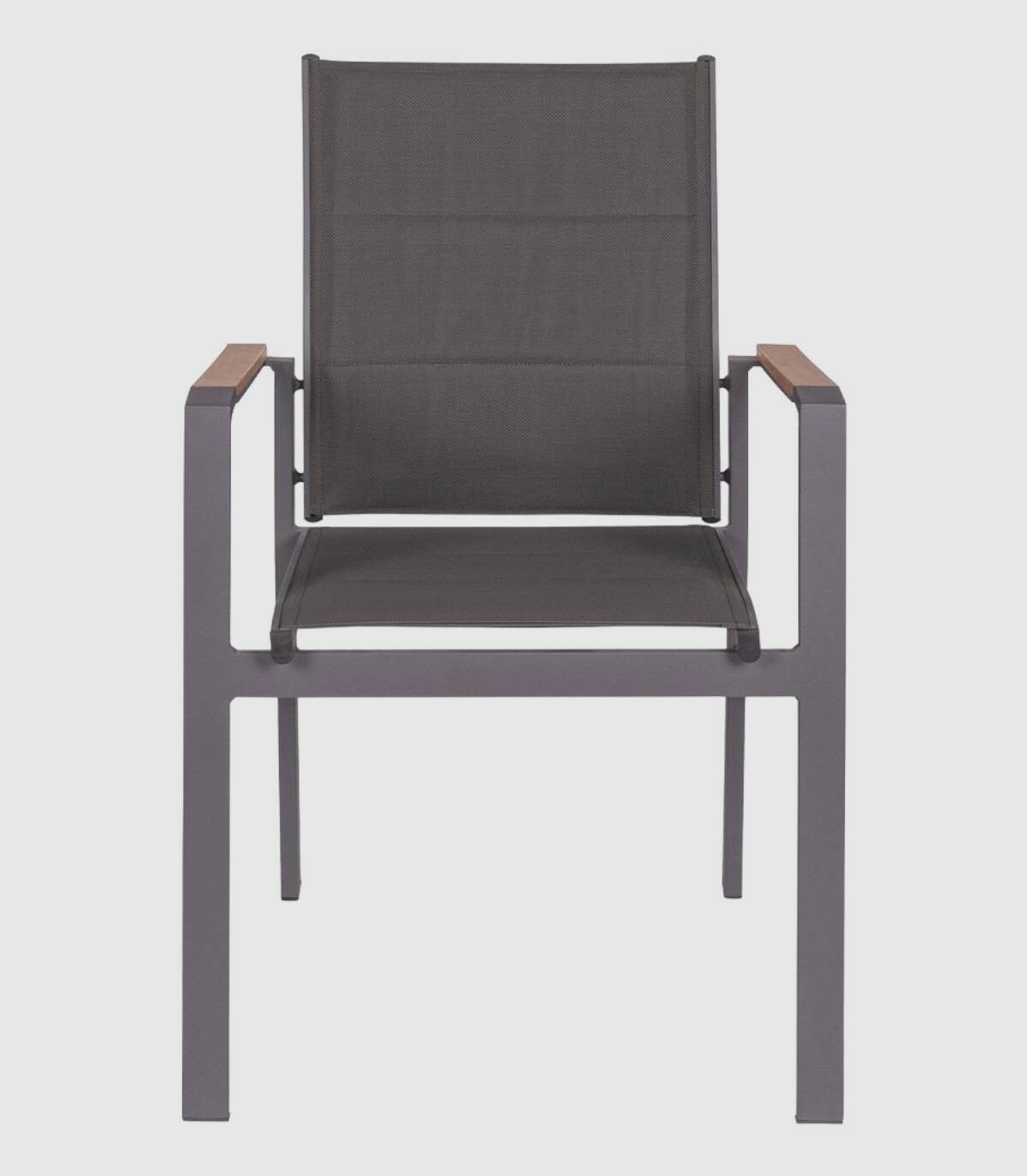 8La silla C-BR Kubik de jardin en color antracita está hecha de aluminio con revestimiento en polvo (poliéster) y brazo cubiertos de madera de polywood, el asiento y respaldo son de textiline 2x1 (relleno) lo que hace la sujecion mas fuerte , al llevar textiline no hace falta cojín.