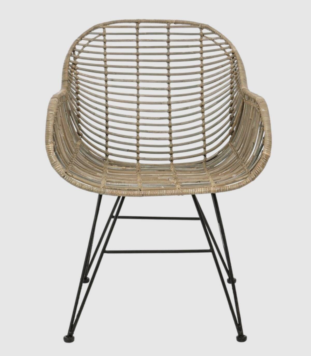 La silla de ratán natural Raquel está compuesta por una estructura de acero con pintura en polvo. El asiento y el respaldo se compone de un entramado de kubu, buena para usar en salón comedor debido a la composición de su ratán natural pero puede cambiar de color por el uso excesivo del exterior. Al tener brazos hace que la sentada sea más agradable durante mucho más tiempo.