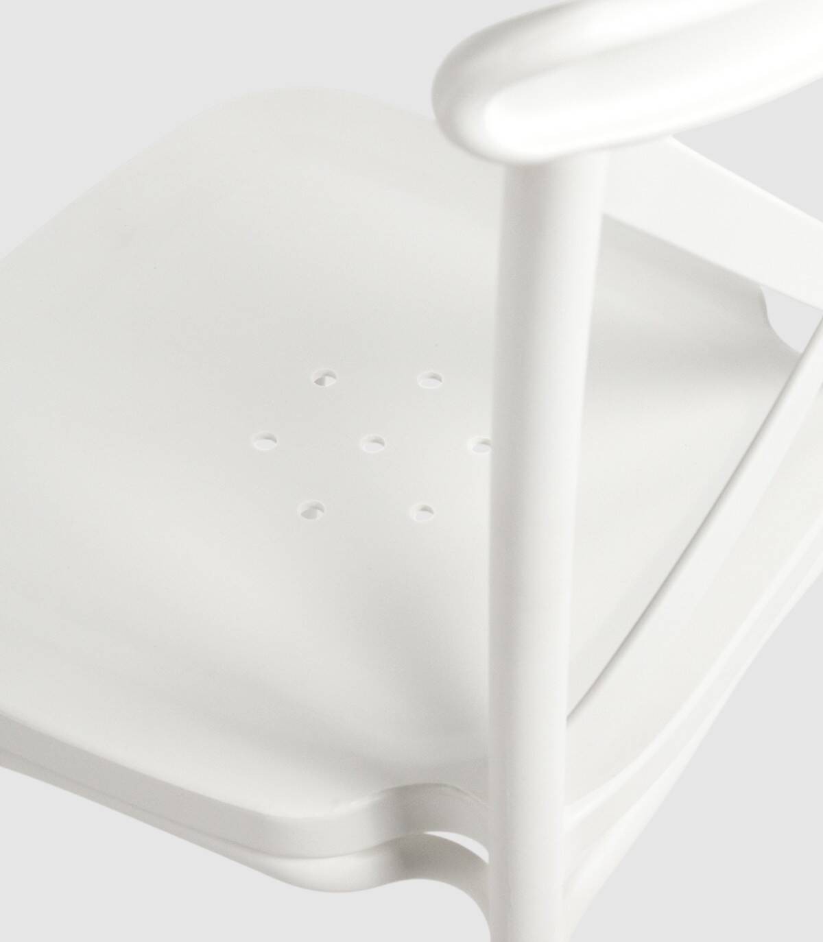 La silla Roma apilable estilo monobloc, de diseño elegante y moderno, tiene una estructura de polipropileno con acabado todo del mismo color.