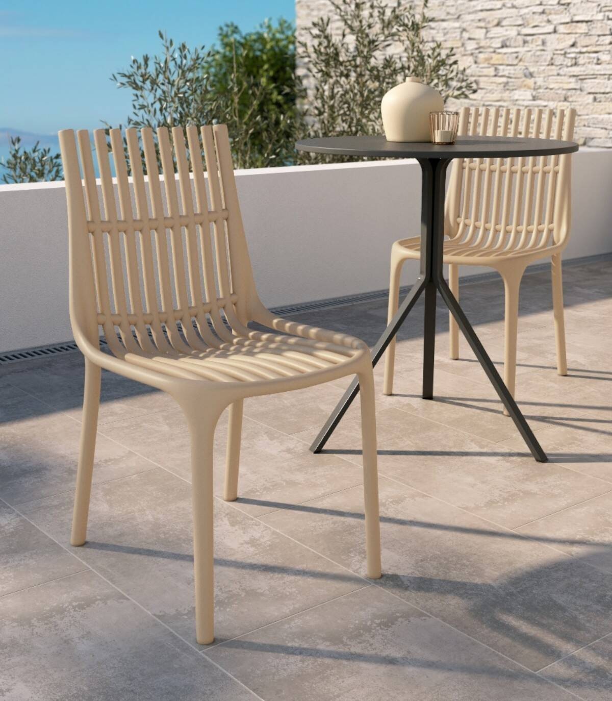 La silla Milán apilable estilo monobloc, de diseño elegante y moderno, tiene una estructura de polipropileno con acabado todo del mismo color.