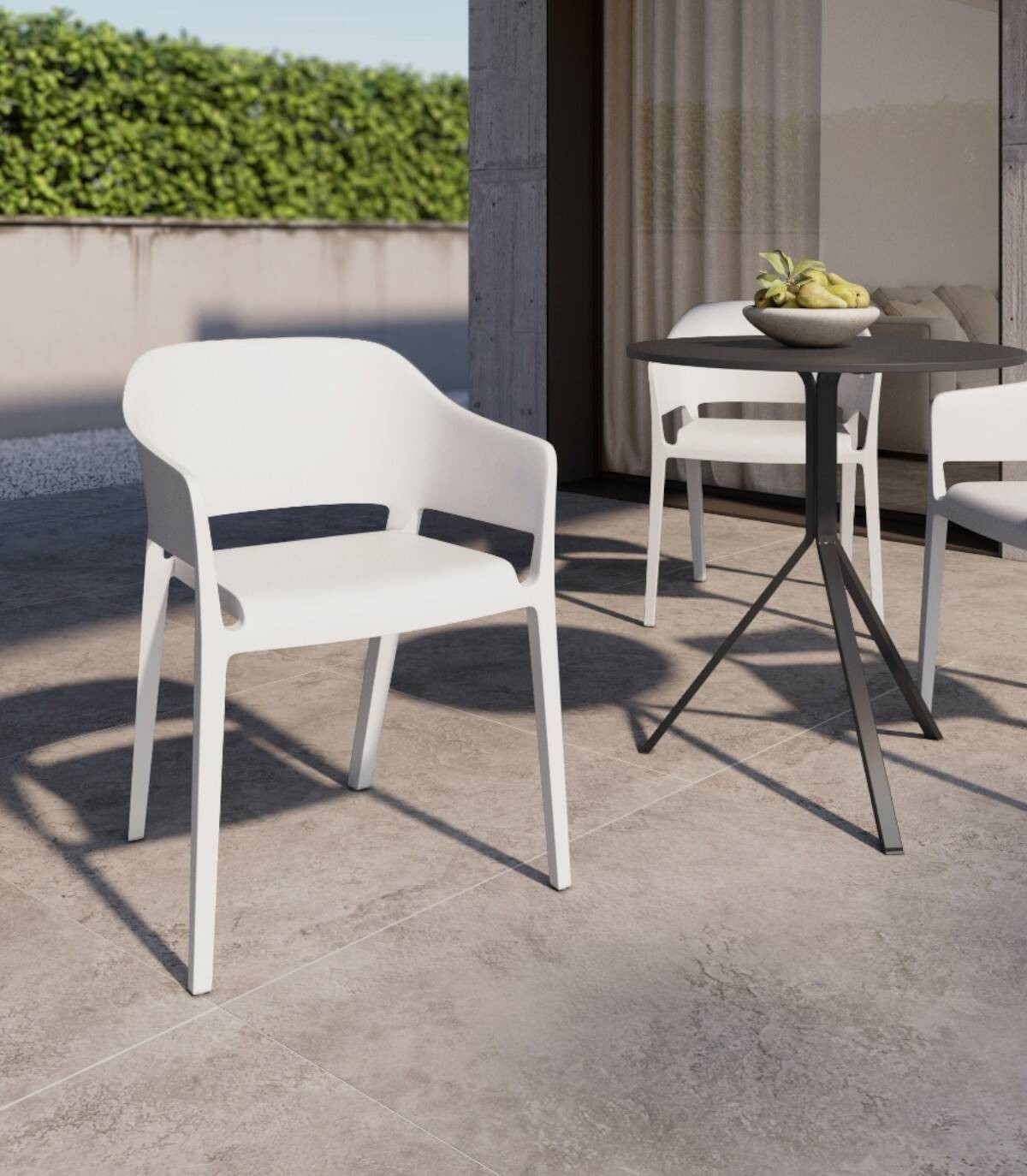 La silla Valeta apilable estilo monobloc, de diseño elegante y moderno, tiene una estructura de polipropileno con acabado todo del mismo color.