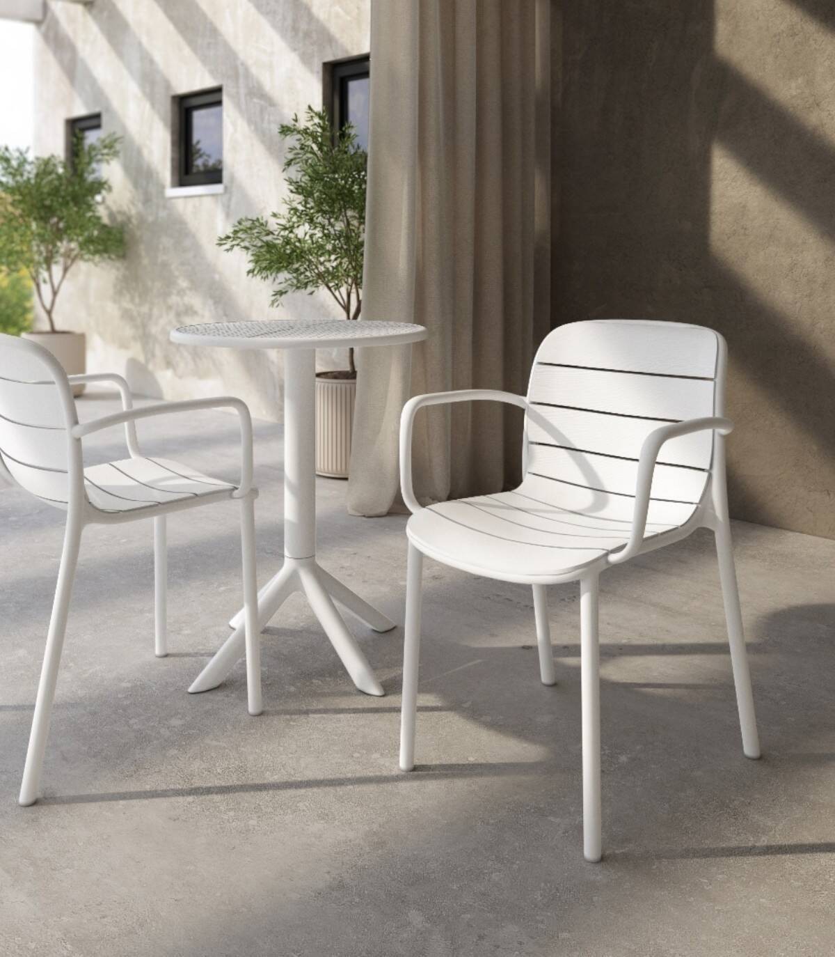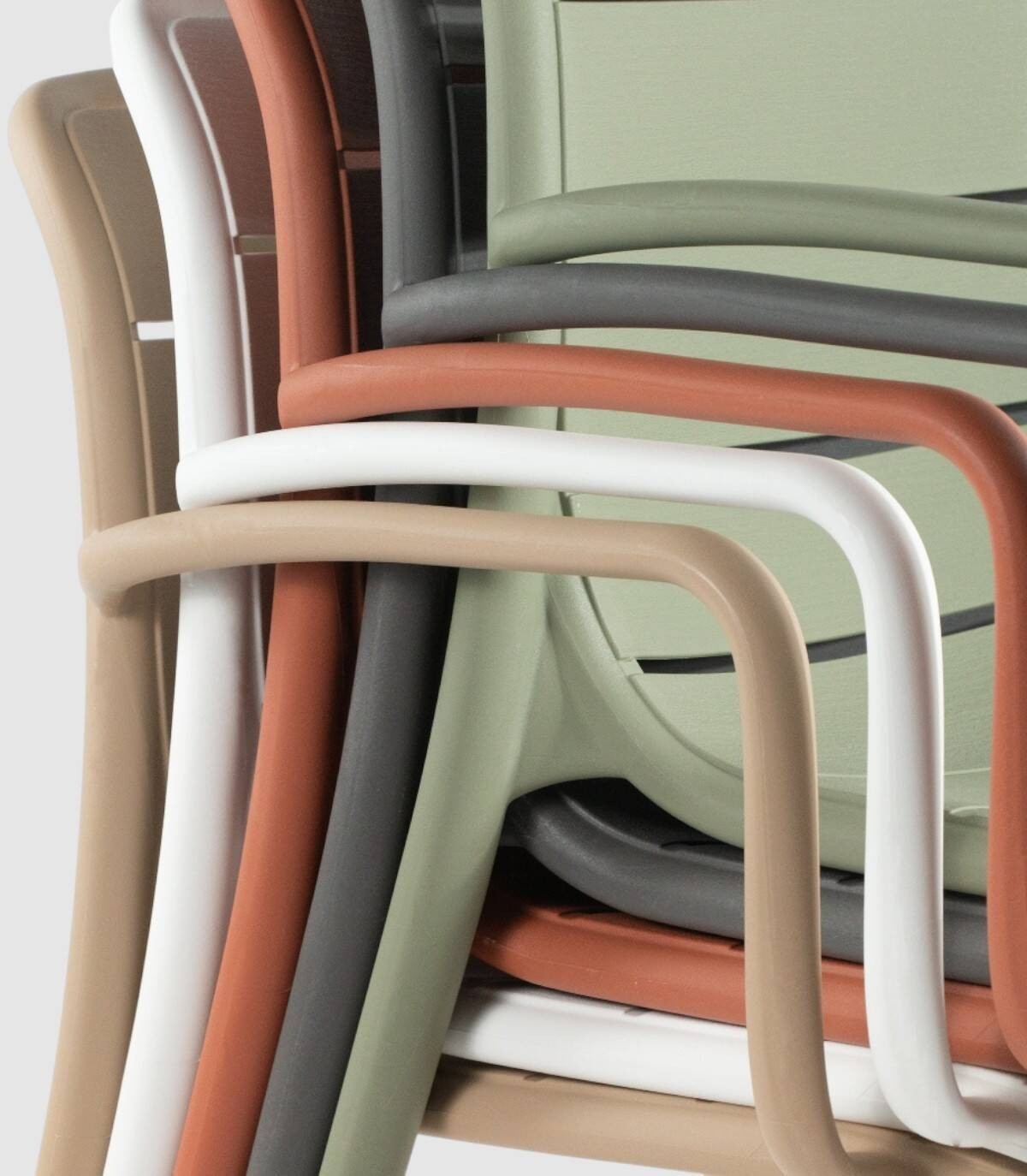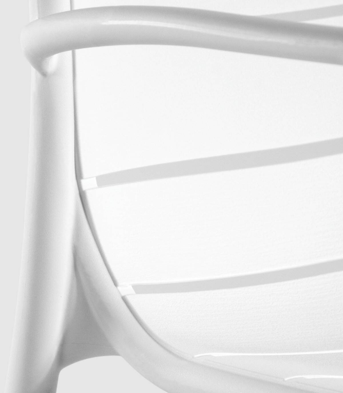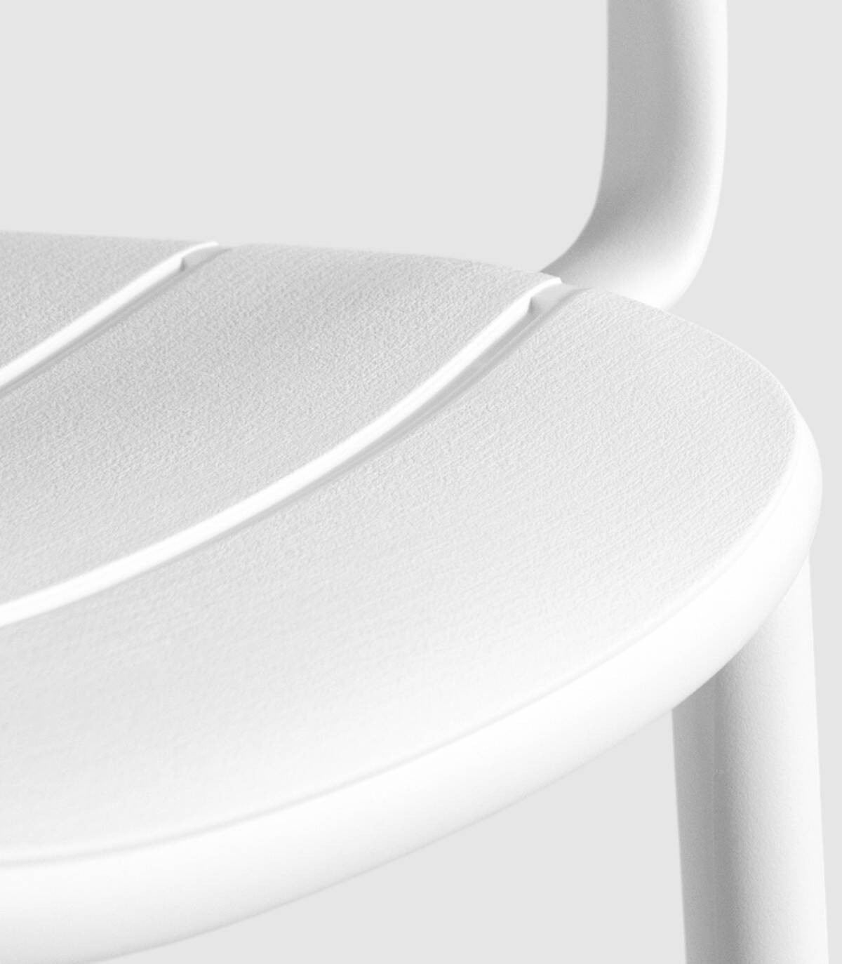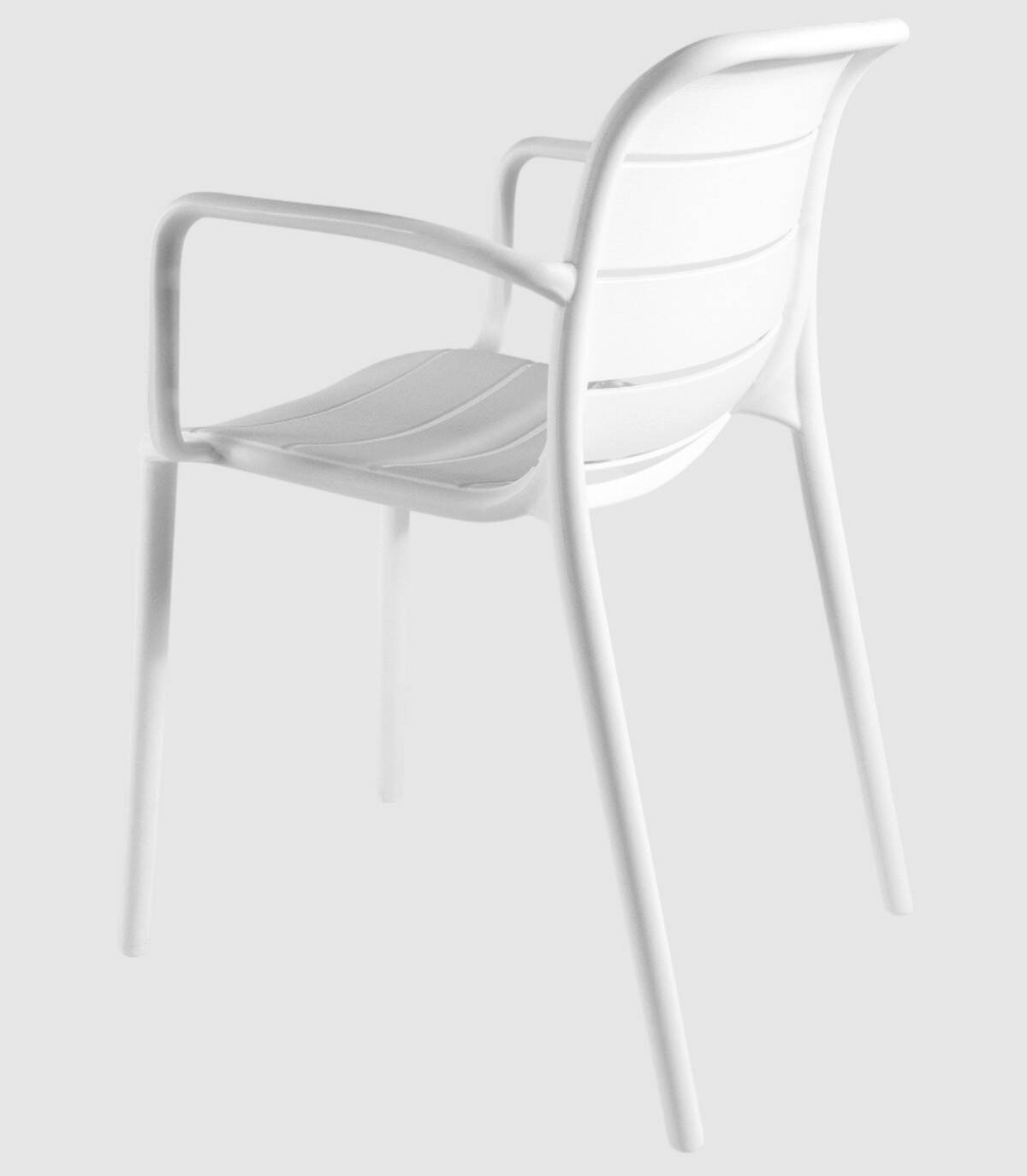 La silla Cancún apilable apta para exterior se compone de respaldo, asiento, reposabrazos y patas fabricado en polipropileno pintado del mismo color con diseño de listones perforado en horizontal.