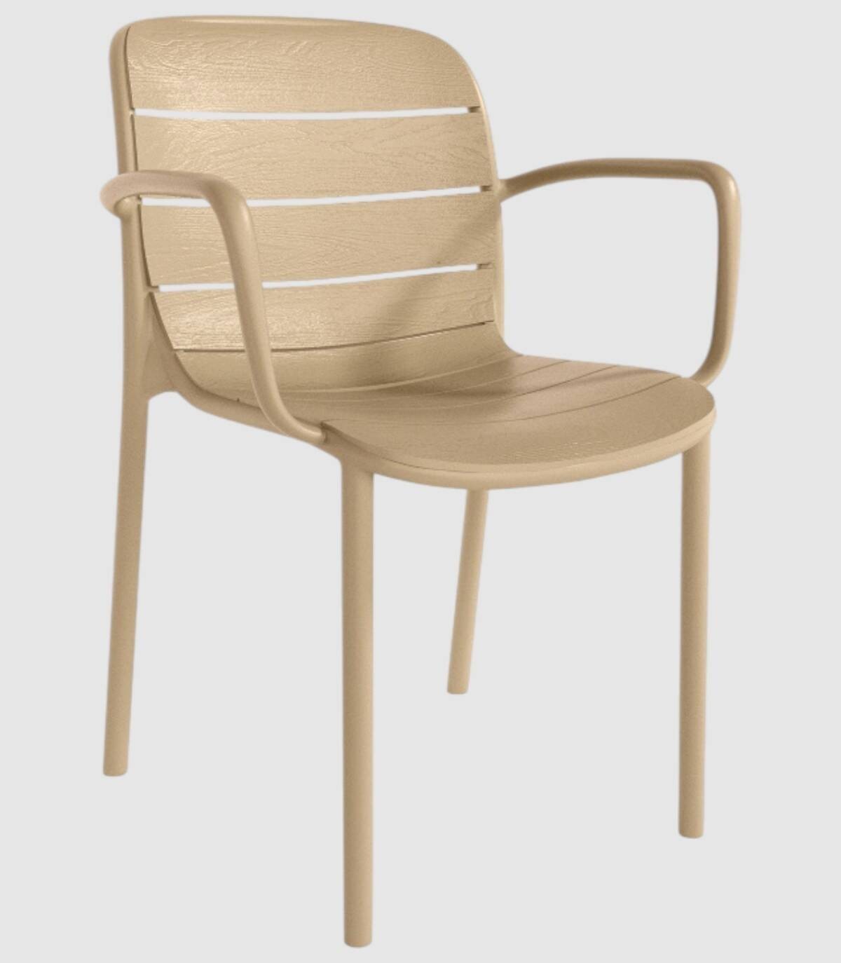 La silla Cancún apilable apta para exterior se compone de respaldo, asiento, reposabrazos y patas fabricado en polipropileno pintado del mismo color con diseño de listones perforado en horizontal.