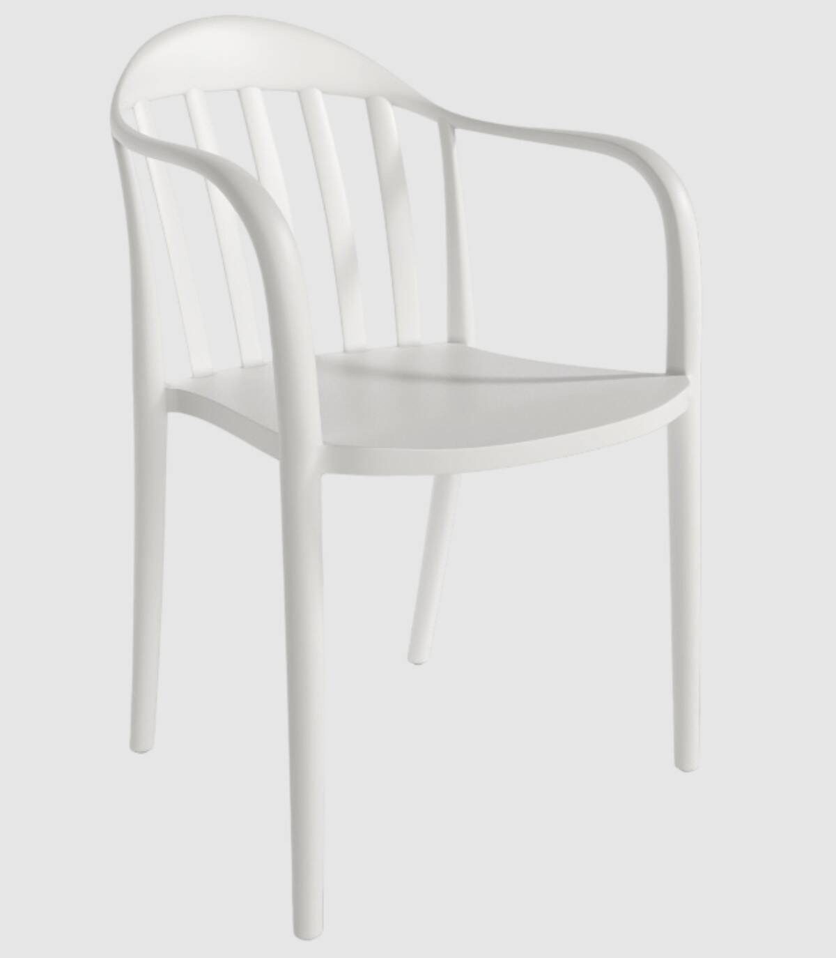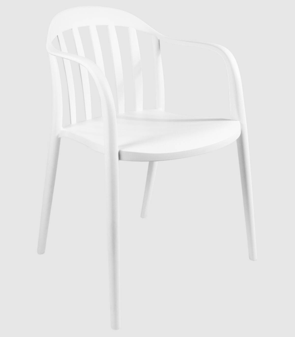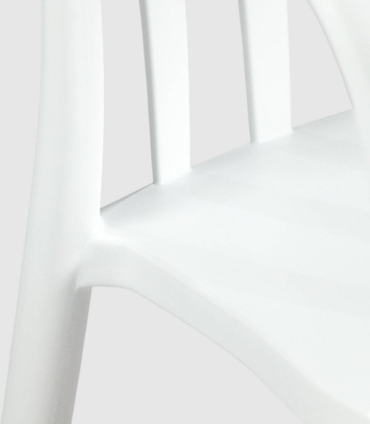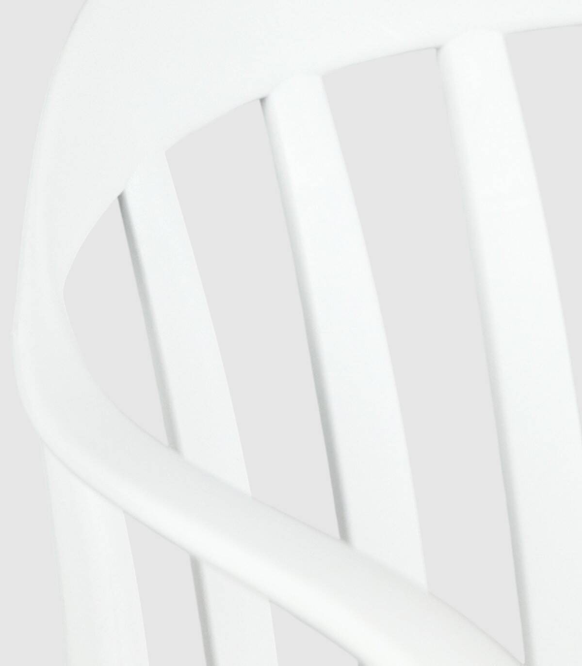La silla Malibú apilable apta para exterior se compone de respaldo, asiento, reposabrazos y patas fabricado en polipropileno pintado del mismo color con diseño de barras verticales.