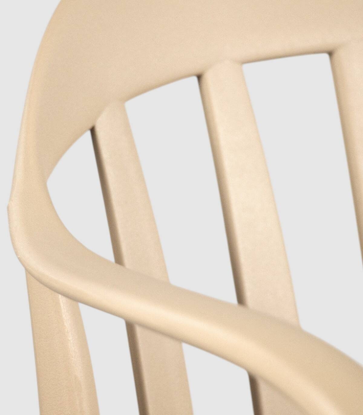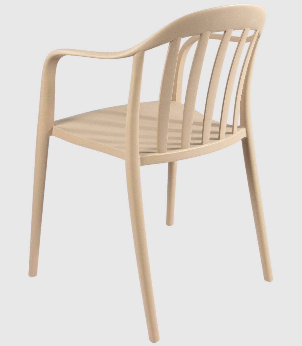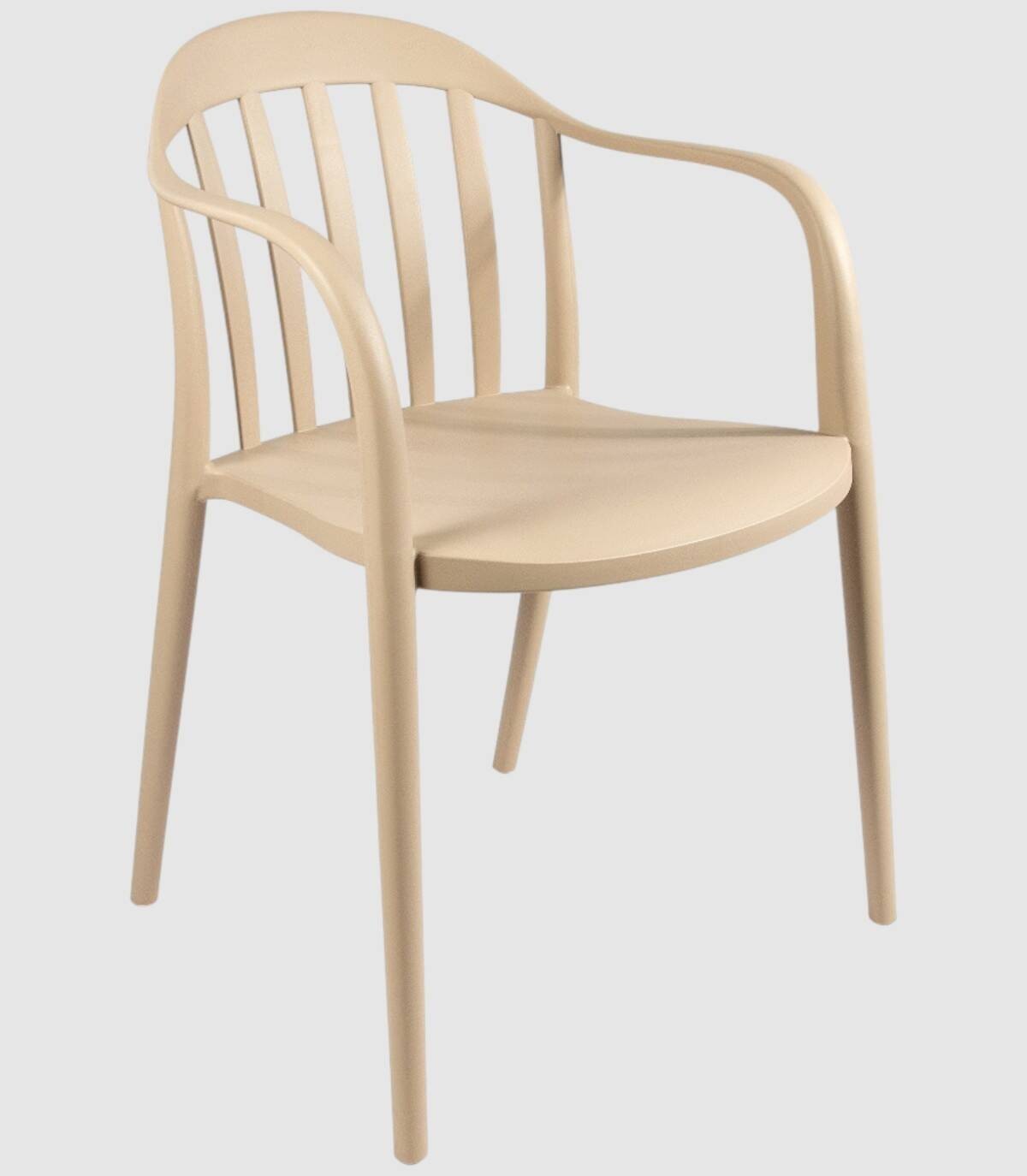 La silla Malibú apilable apta para exterior se compone de respaldo, asiento, reposabrazos y patas fabricado en polipropileno pintado del mismo color con diseño de barras verticales.