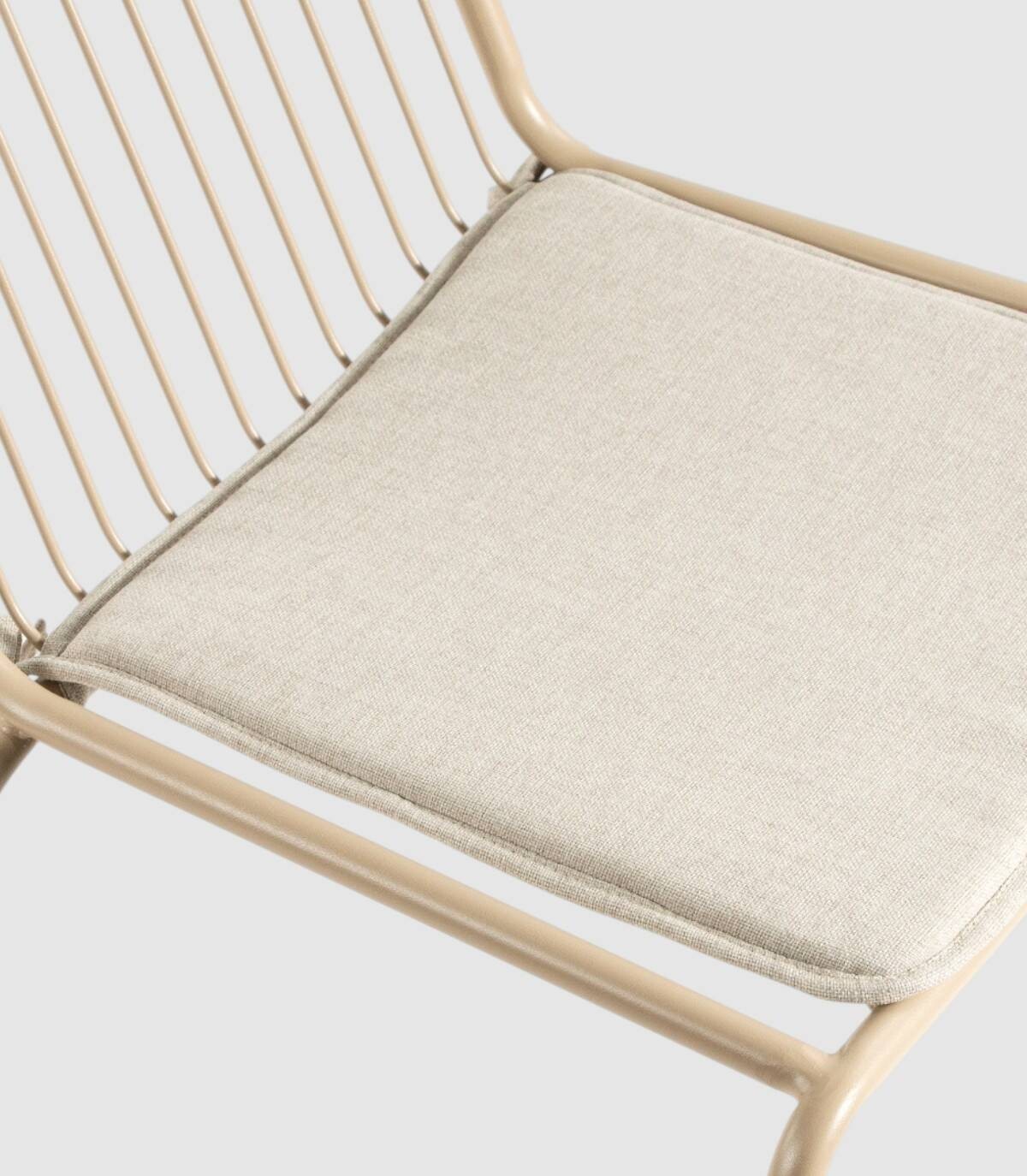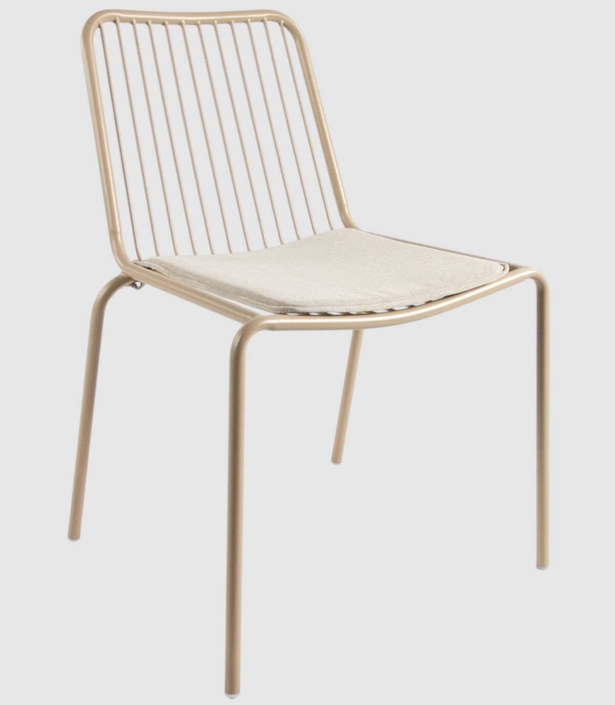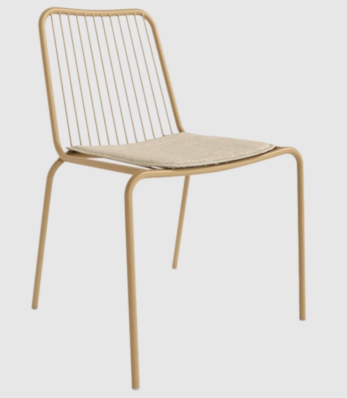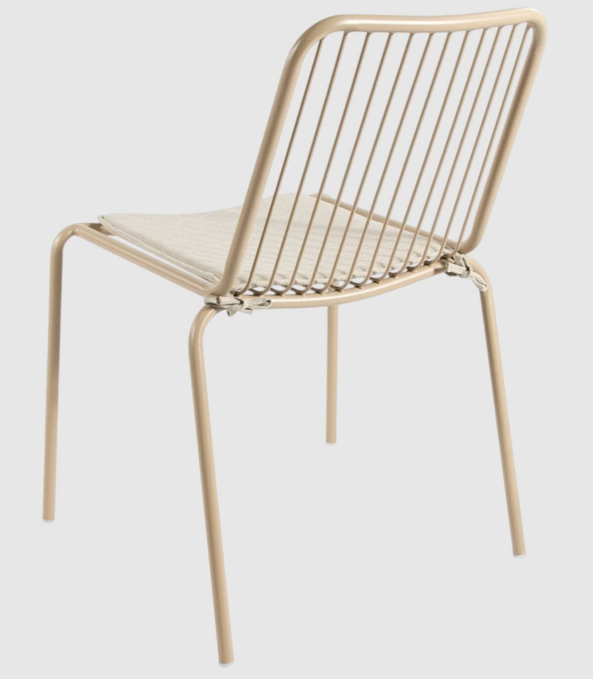 La silla Aloha apilable apta para exterior se compone de respaldo, asiento y patas fabricado en metal pintado del mismo color con diseño de varillas verticales, incluye cojín.
