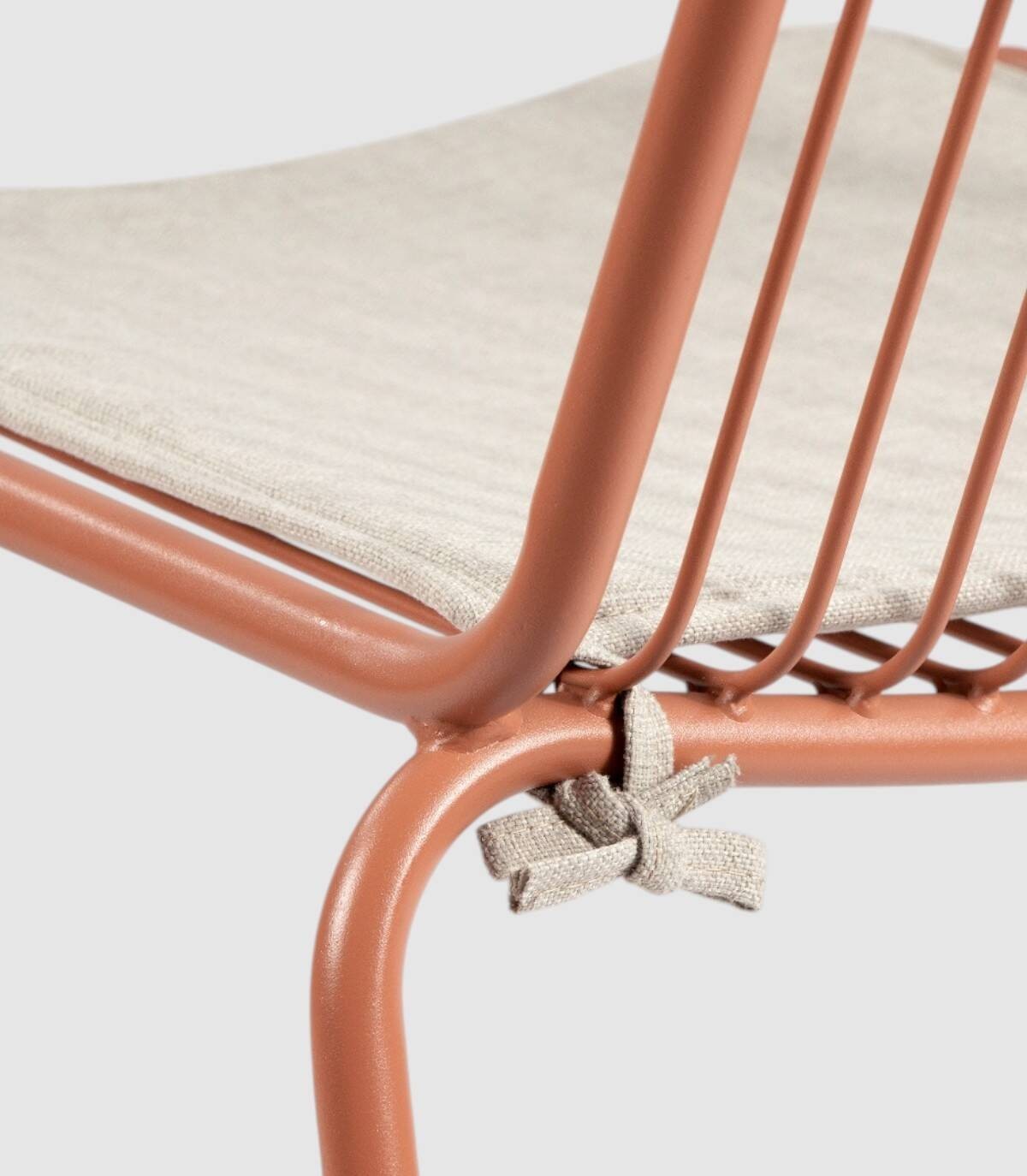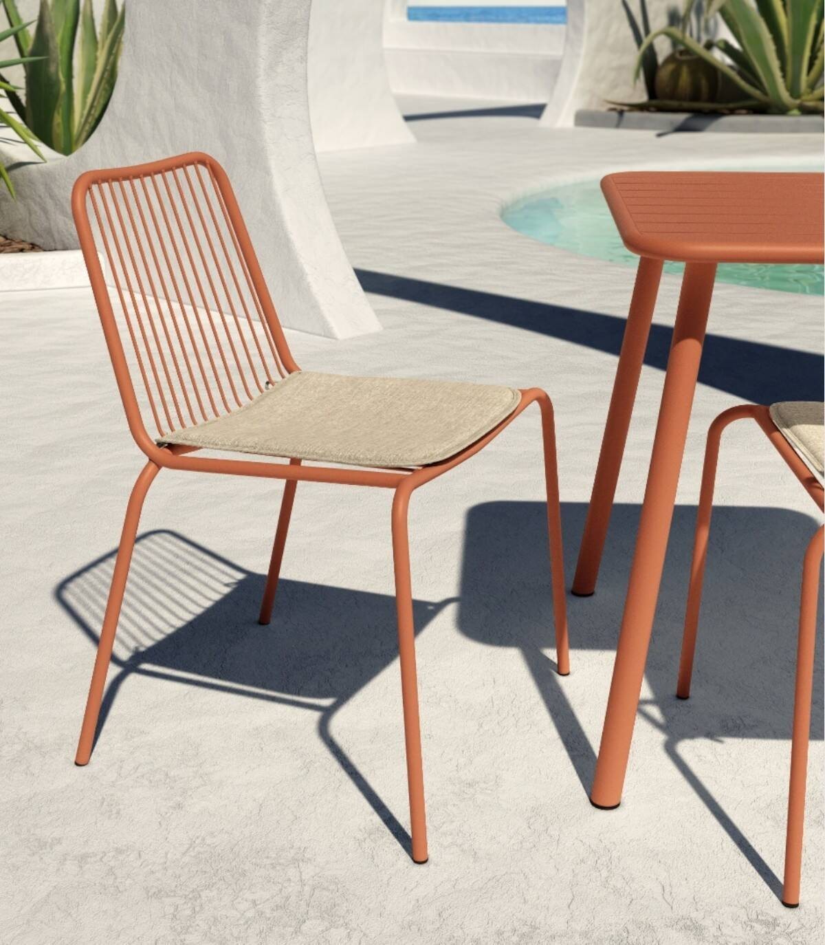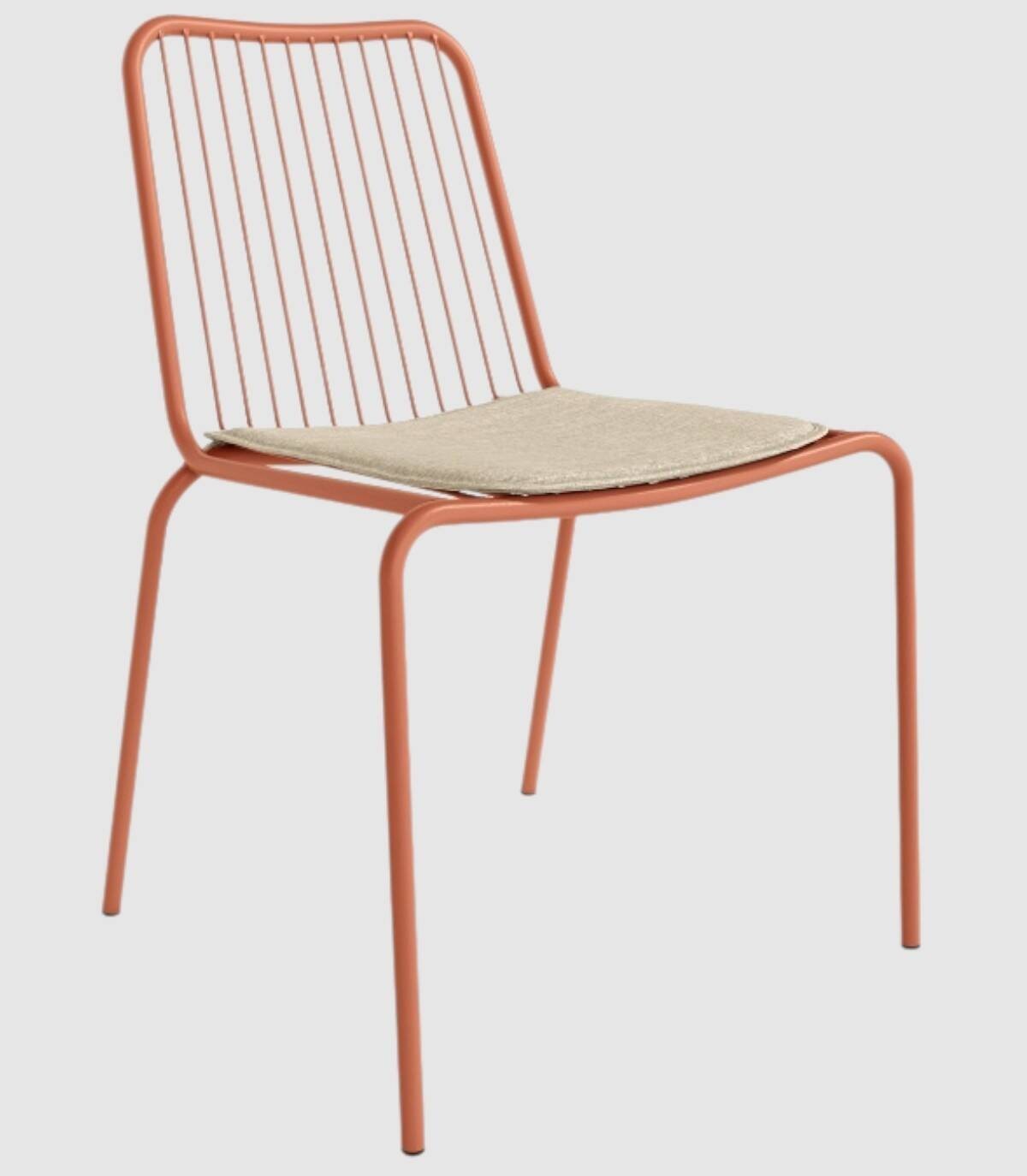 La silla Aloha apilable apta para exterior se compone de respaldo, asiento y patas fabricado en metal pintado del mismo color con diseño de varillas verticales, incluye cojín.