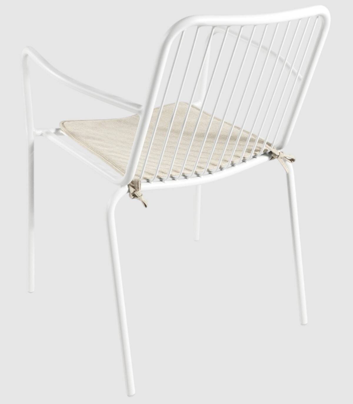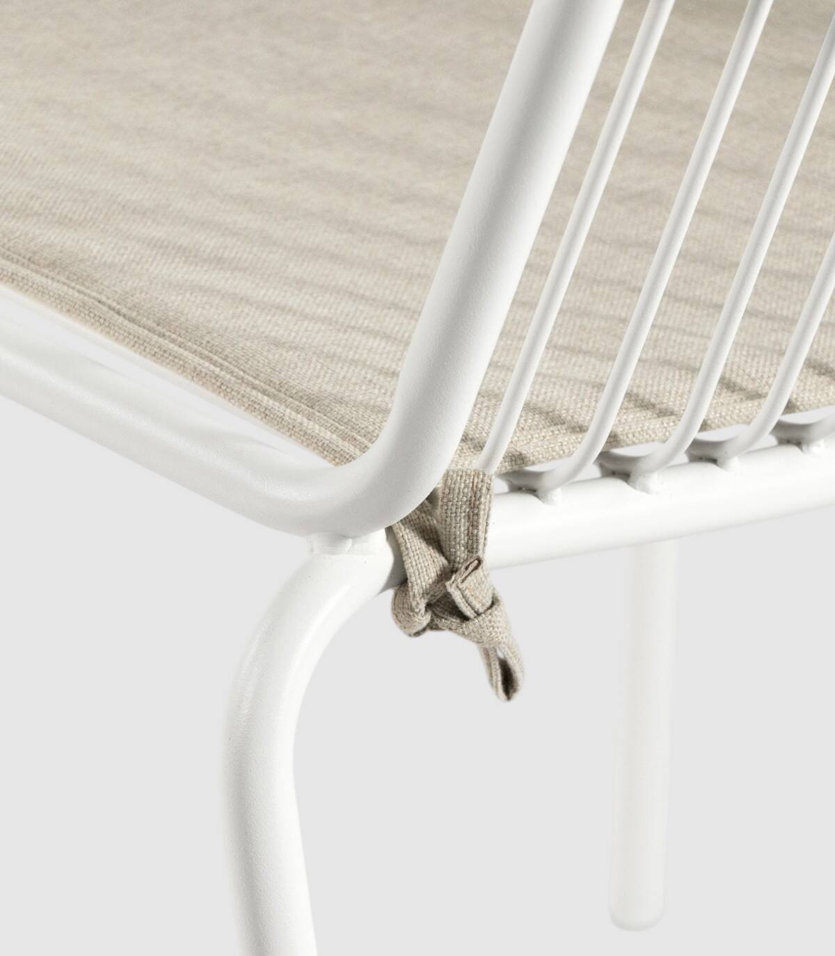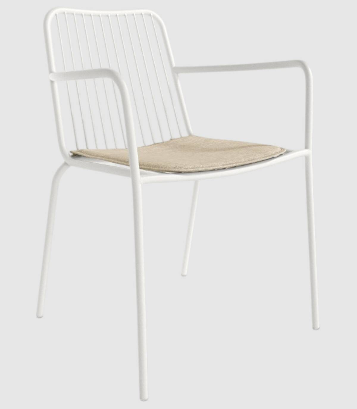 La silla Ohana apilable apta para exterior se compone de respaldo, asiento, reposabrazos y patas fabricado en metal pintado del mismo color con diseño de varillas verticales, incluye cojín.