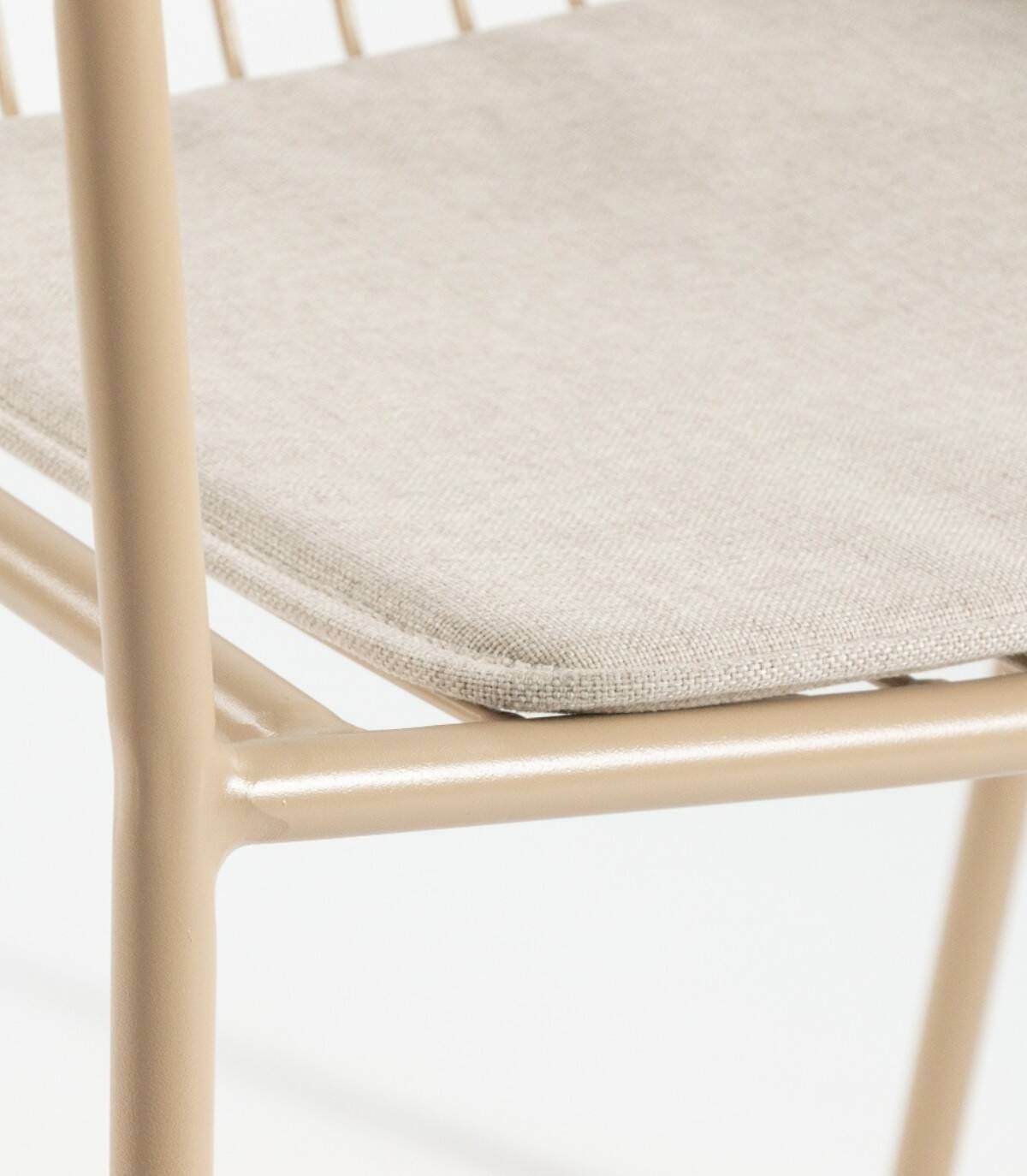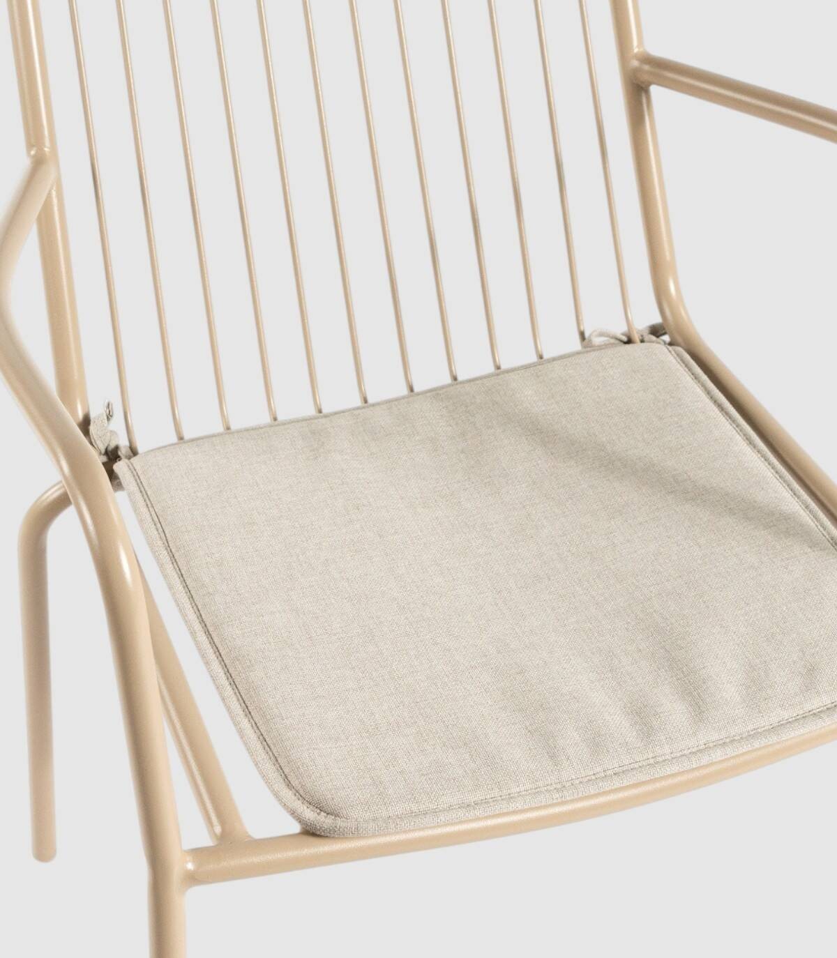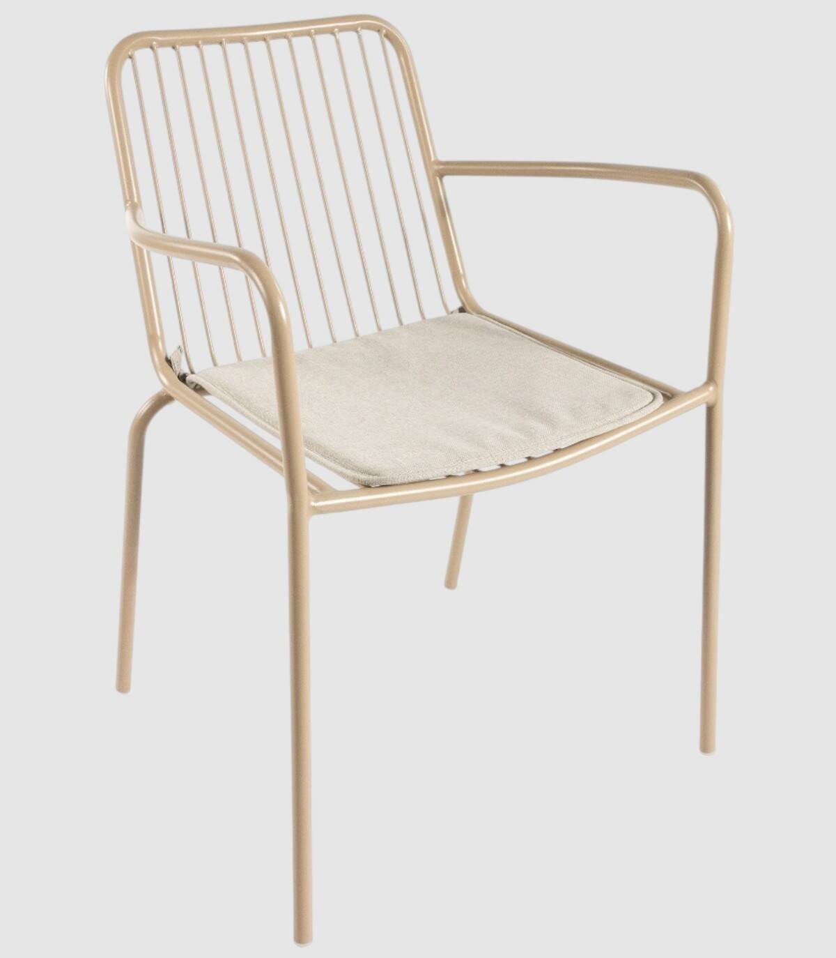 La silla Ohana apilable apta para exterior se compone de respaldo, asiento, reposabrazos y patas fabricado en metal pintado del mismo color con diseño de varillas verticales, incluye cojín.