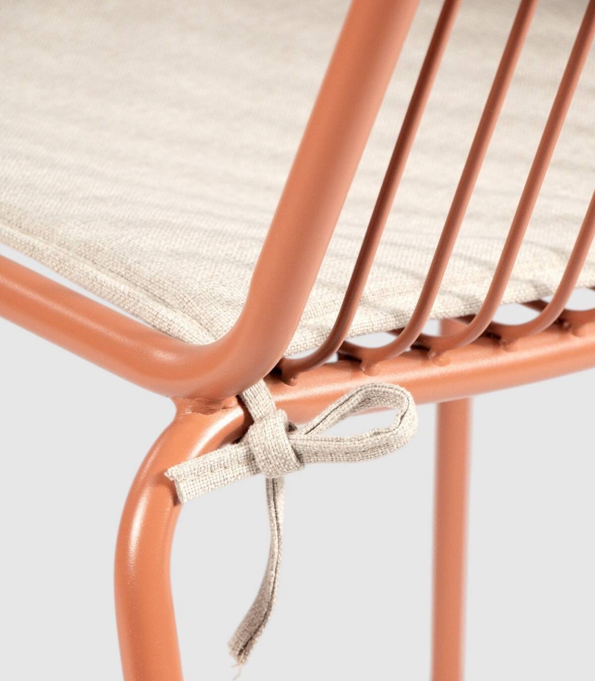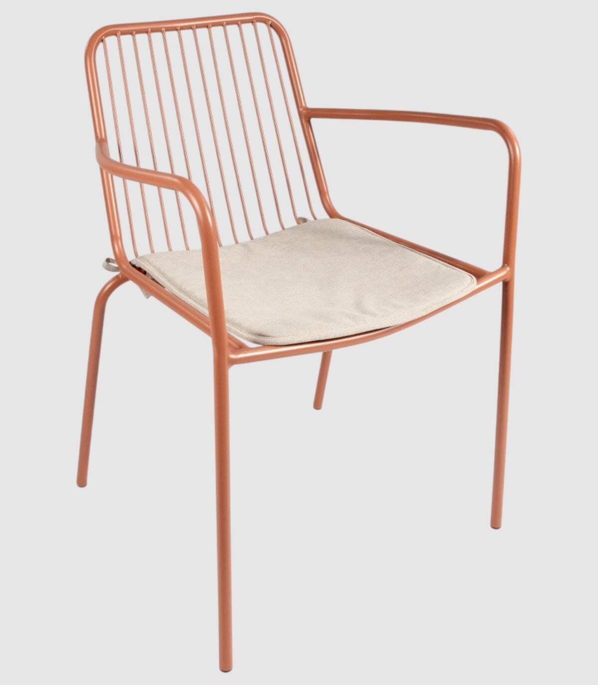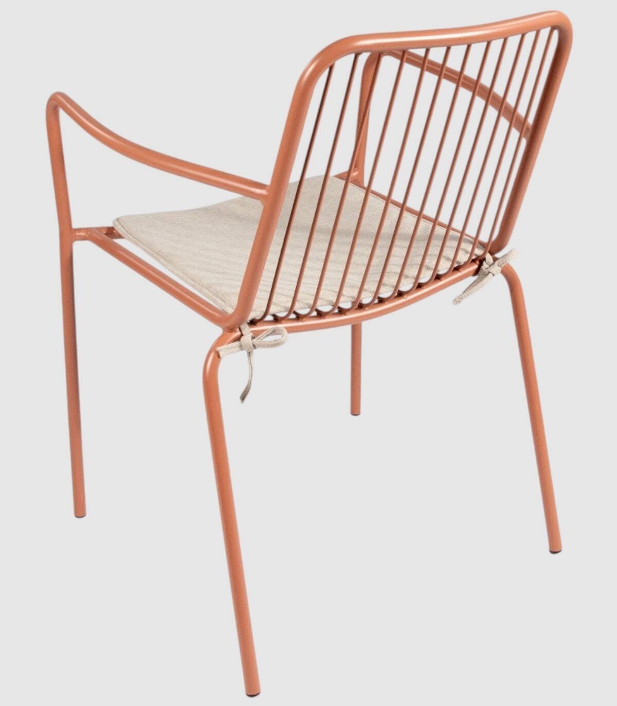 La silla Ohana apilable apta para exterior se compone de respaldo, asiento, reposabrazos y patas fabricado en metal pintado del mismo color con diseño de varillas verticales, incluye cojín.