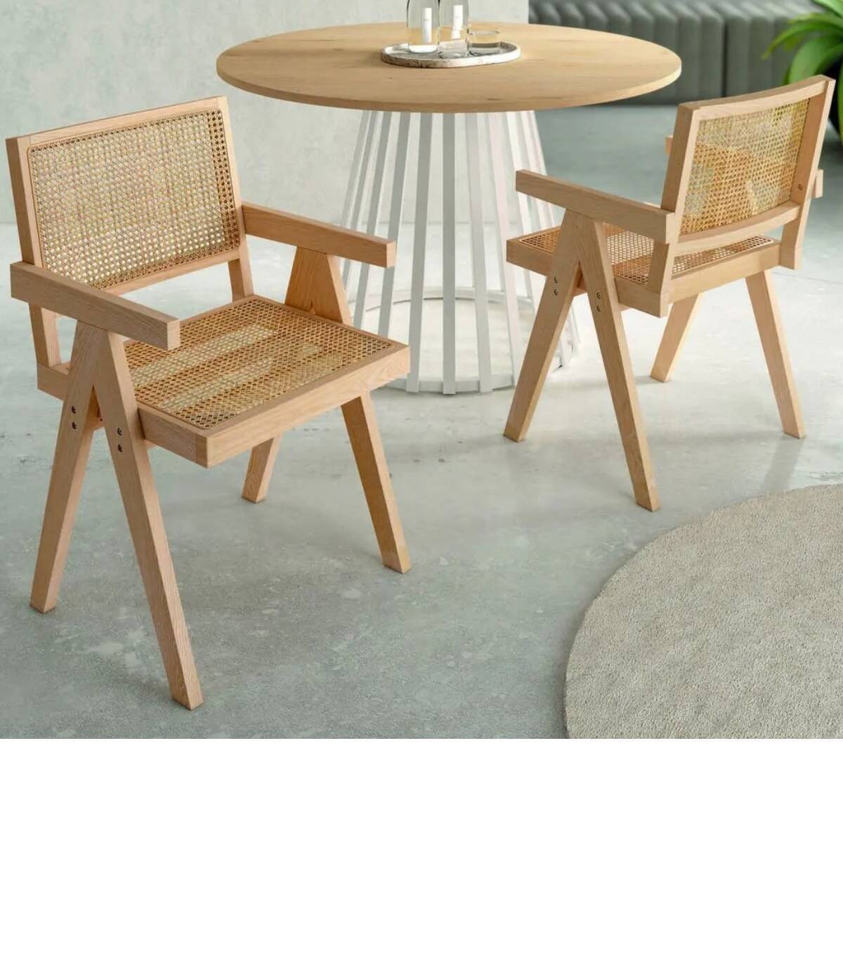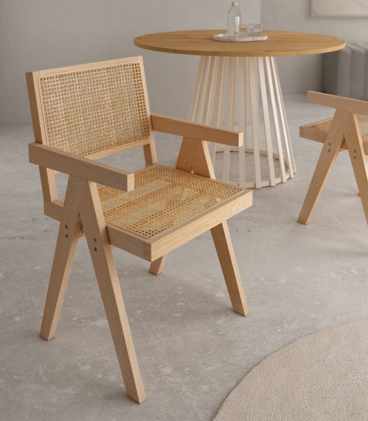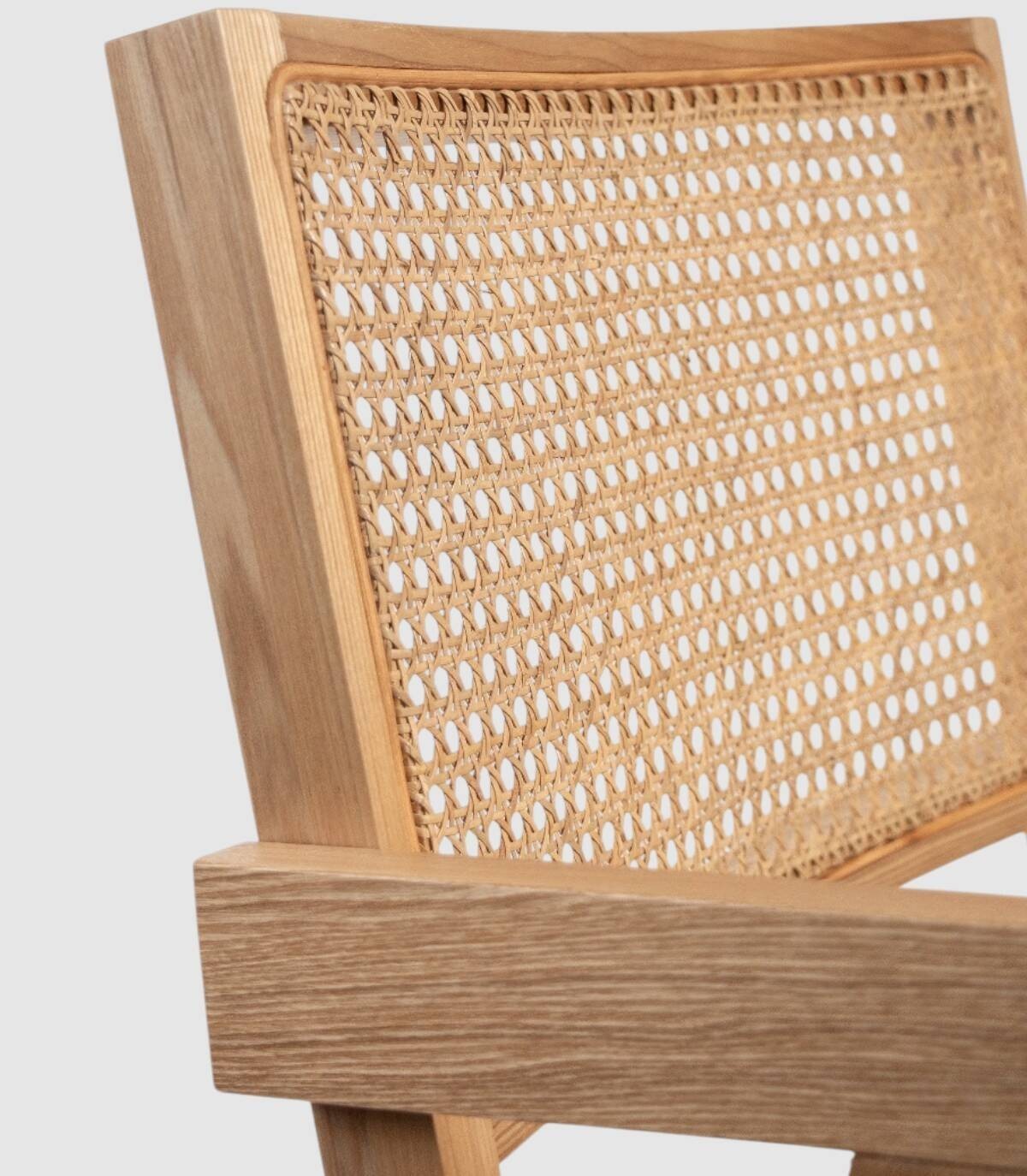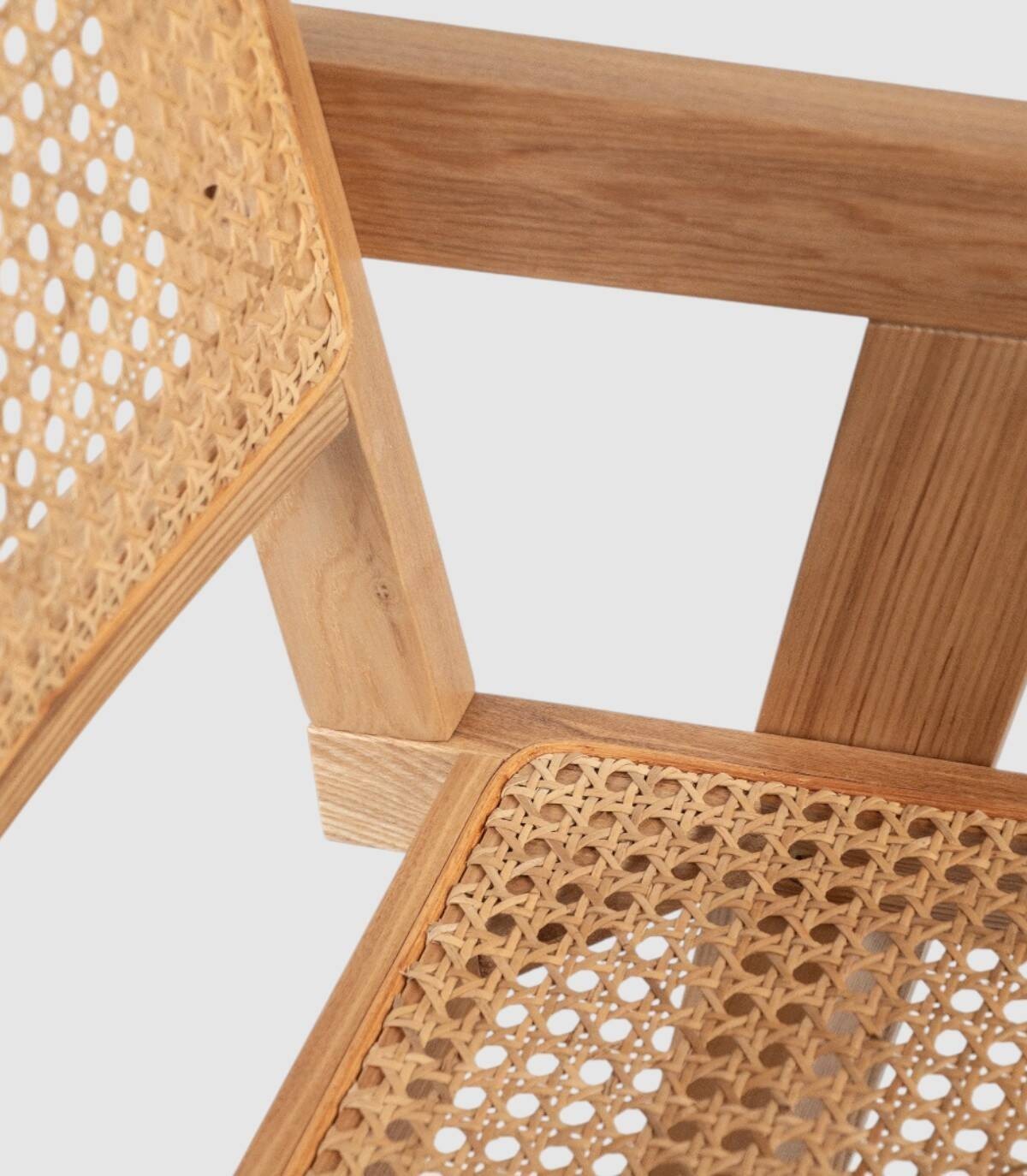 La silla Enea de jardín se compone de asiento, respaldo de mimbre natural y madera, reposabrazos, patas de madera de color fresno natural.