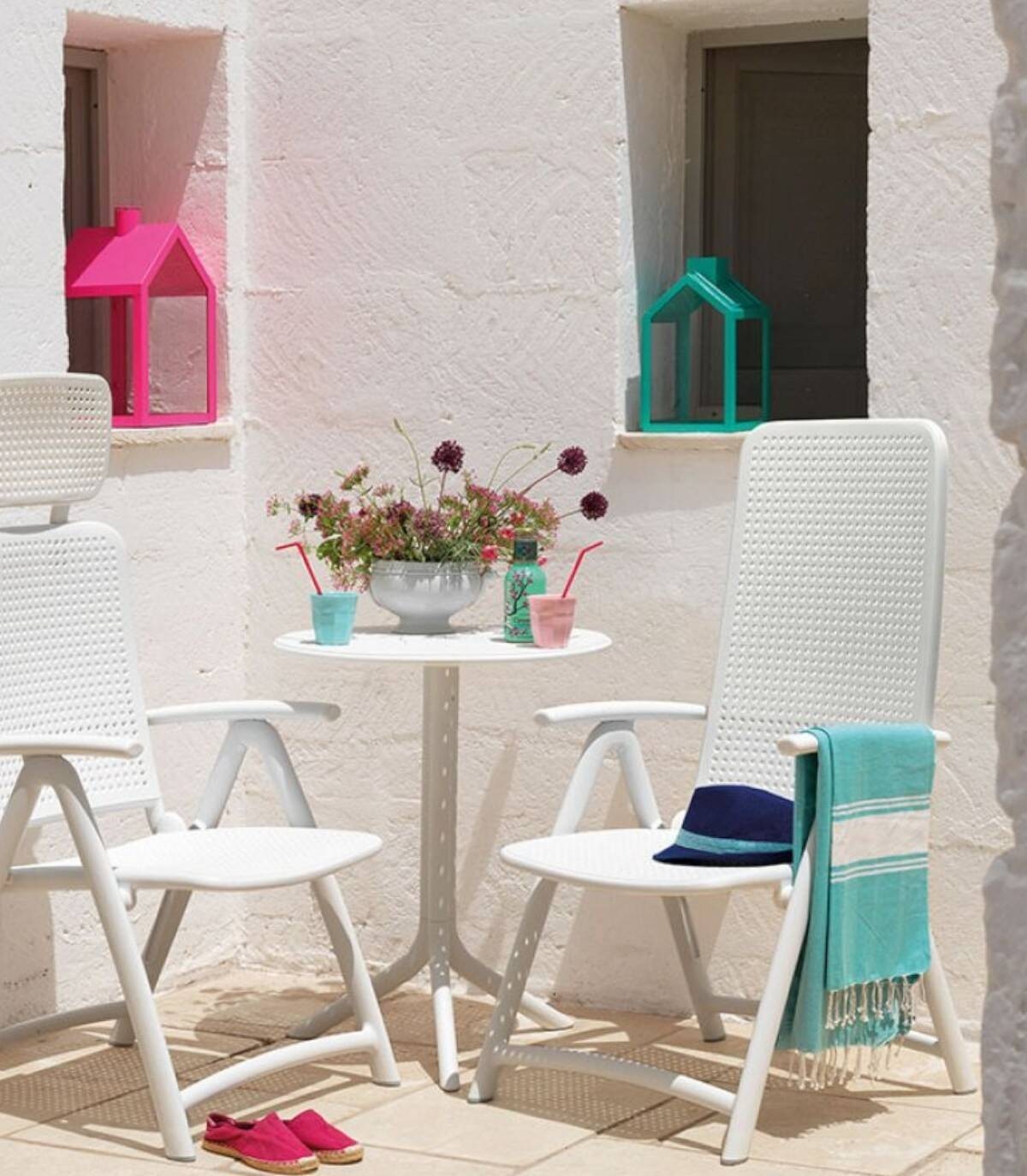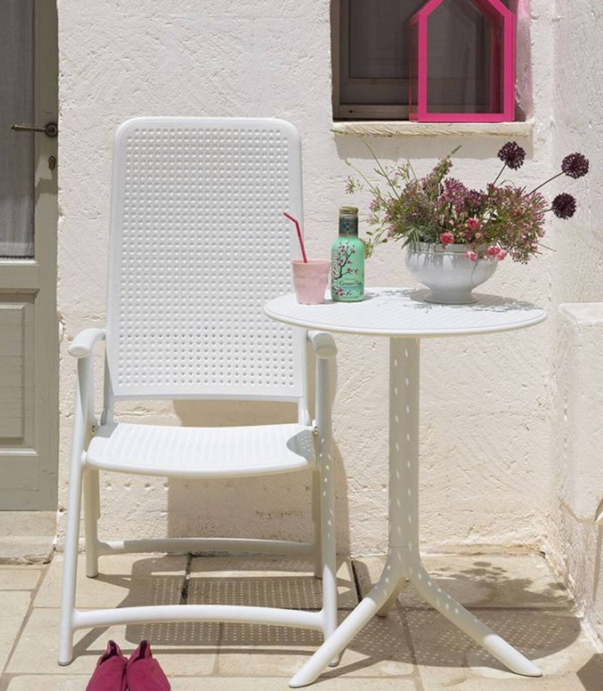 El sillón de exterior Darsena se compone de asiento, respaldo y reposabrazos fabricado en polipropileno fiberglass, tratado anti-UV, teñido en masa, efecto mate, con perforaciones en forma de puntos, con estructura y cuatro patas plegables.