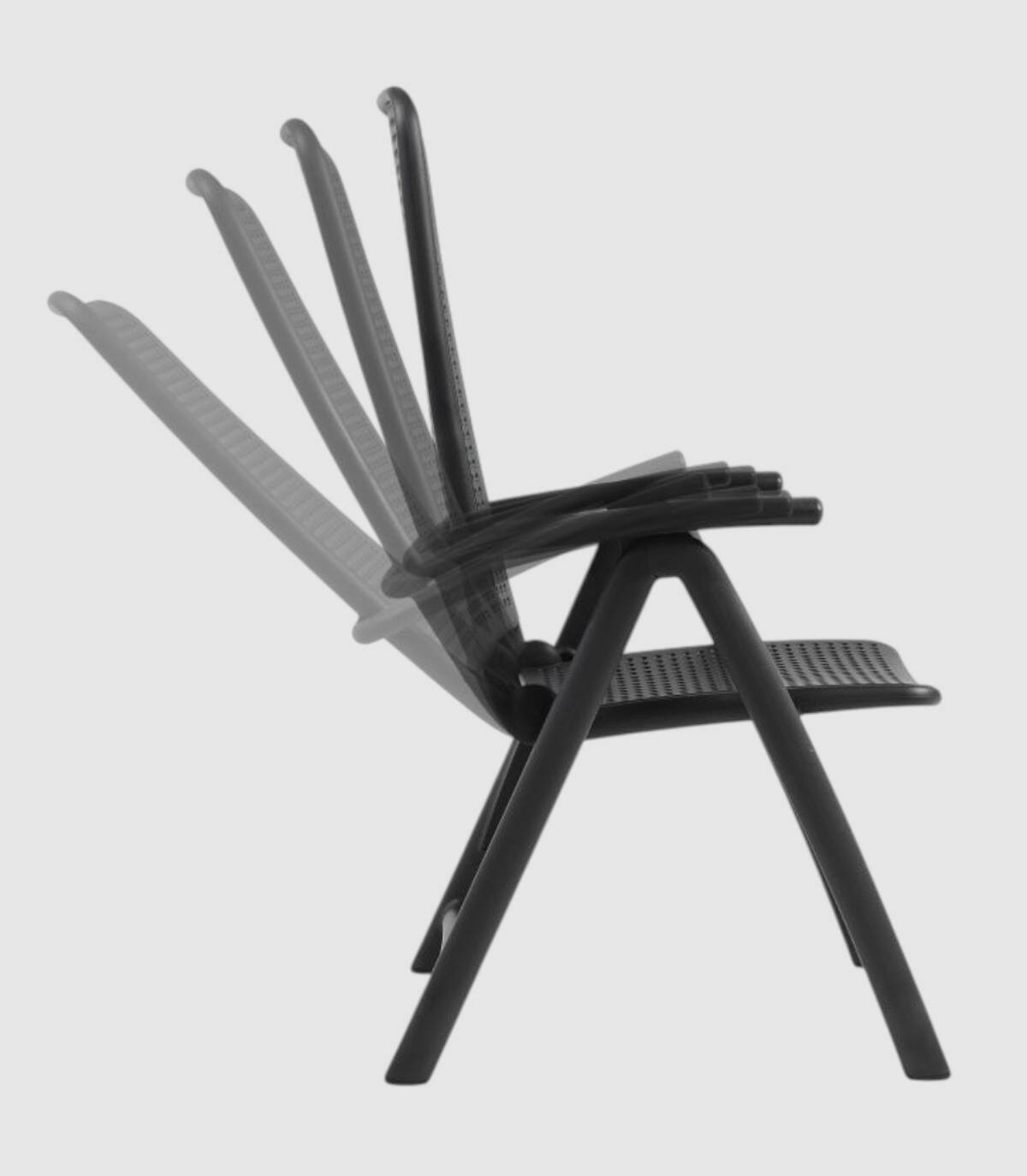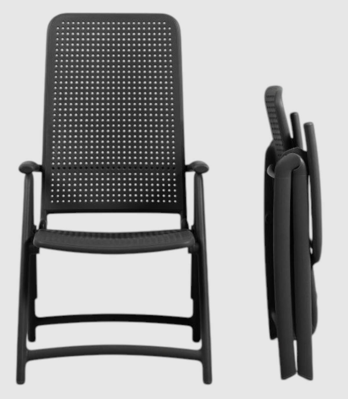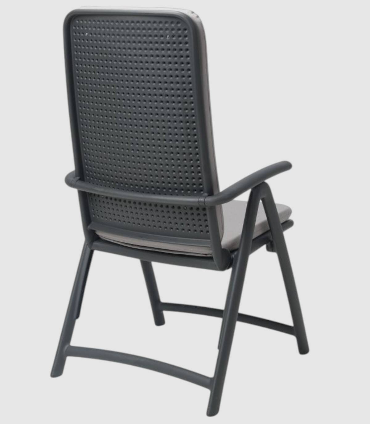 El sillón de exterior Darsena se compone de asiento, respaldo y reposabrazos fabricado en polipropileno fiberglass, tratado anti-UV, teñido en masa, efecto mate, con perforaciones en forma de puntos, con estructura y cuatro patas plegables.