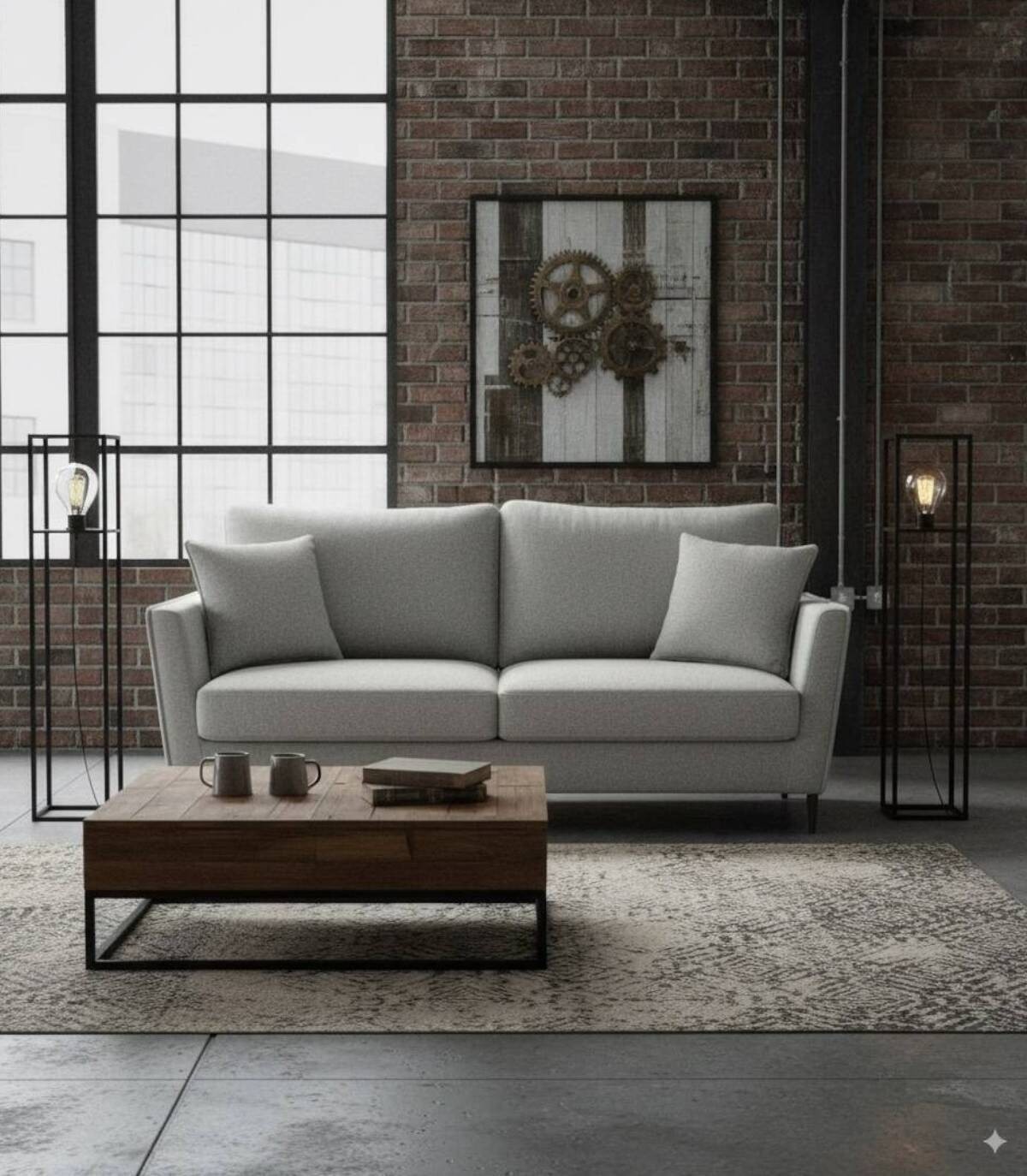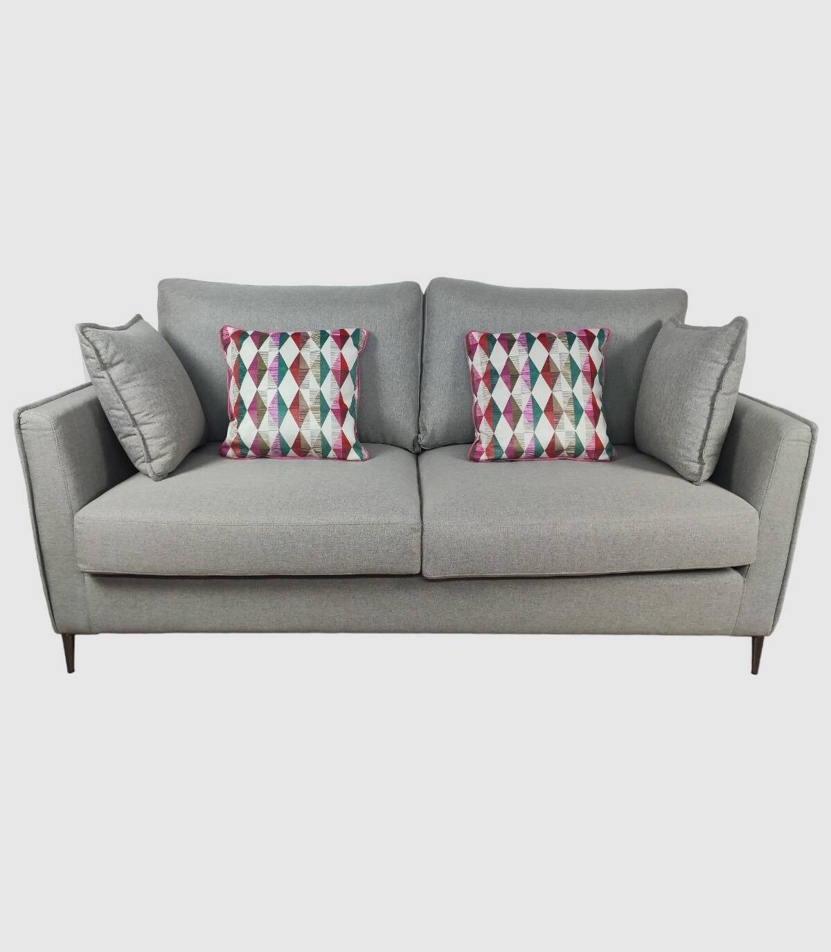 El sofá de tres asientos Denver con dos cojines a juego tiene estructura de pino macizo y aglomerado. Los almohadones de respaldo están hechos de fibra 100% y los asientos de espuma de 30 kg suave cubierta por una capa de 3 cm de espuma de 20 kg súper suave. La altura de los asientos es de 48 cm y el ancho de los brazos es de 17 cm. Un sofá de fácil limpieza ya que los cojines son desenfundables.