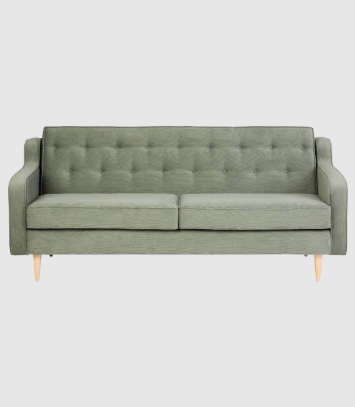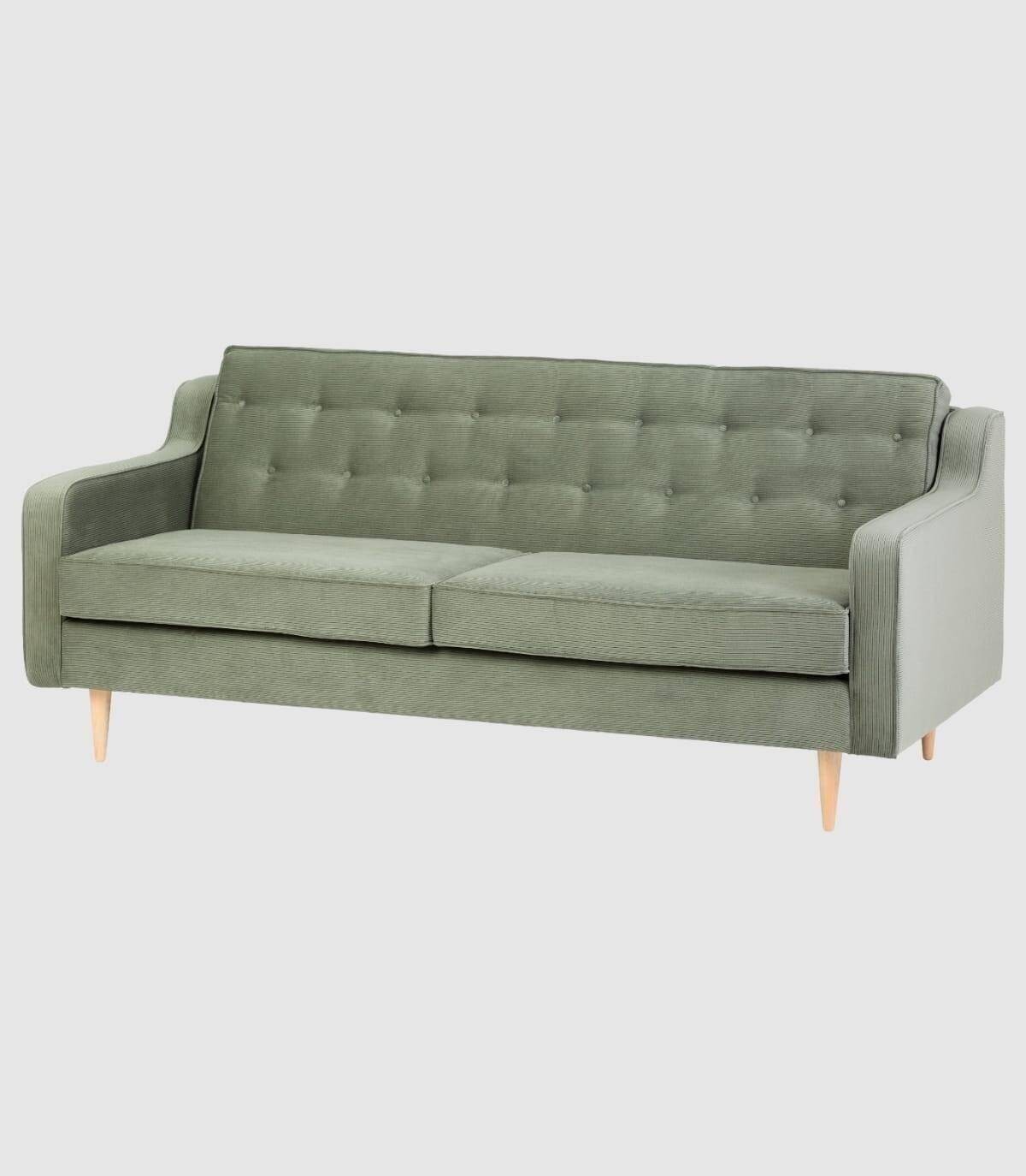 Sofá nórdico verde México de 3 plazas con tela de pana y patas de madera estructura de pino macizo. Los almohadones de respaldo están hechos de espuma 20 kg suave y los asientos de espuma de 30 kg . La altura de los asientos es de 47 cm y la distancia de los brazos de 10 cm.