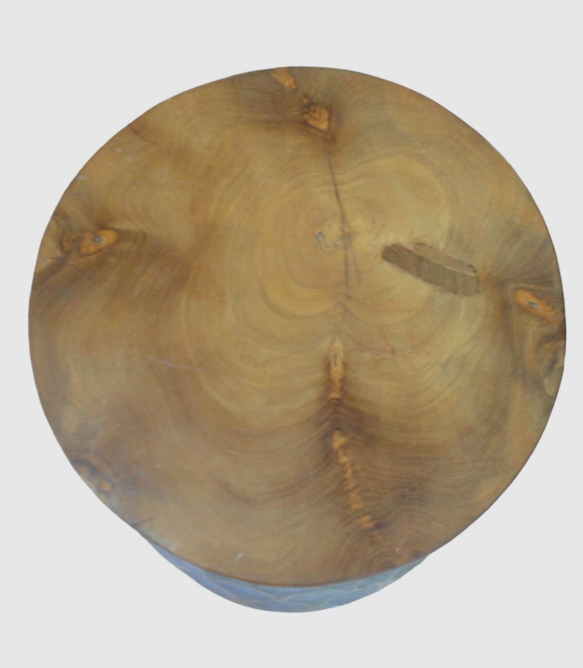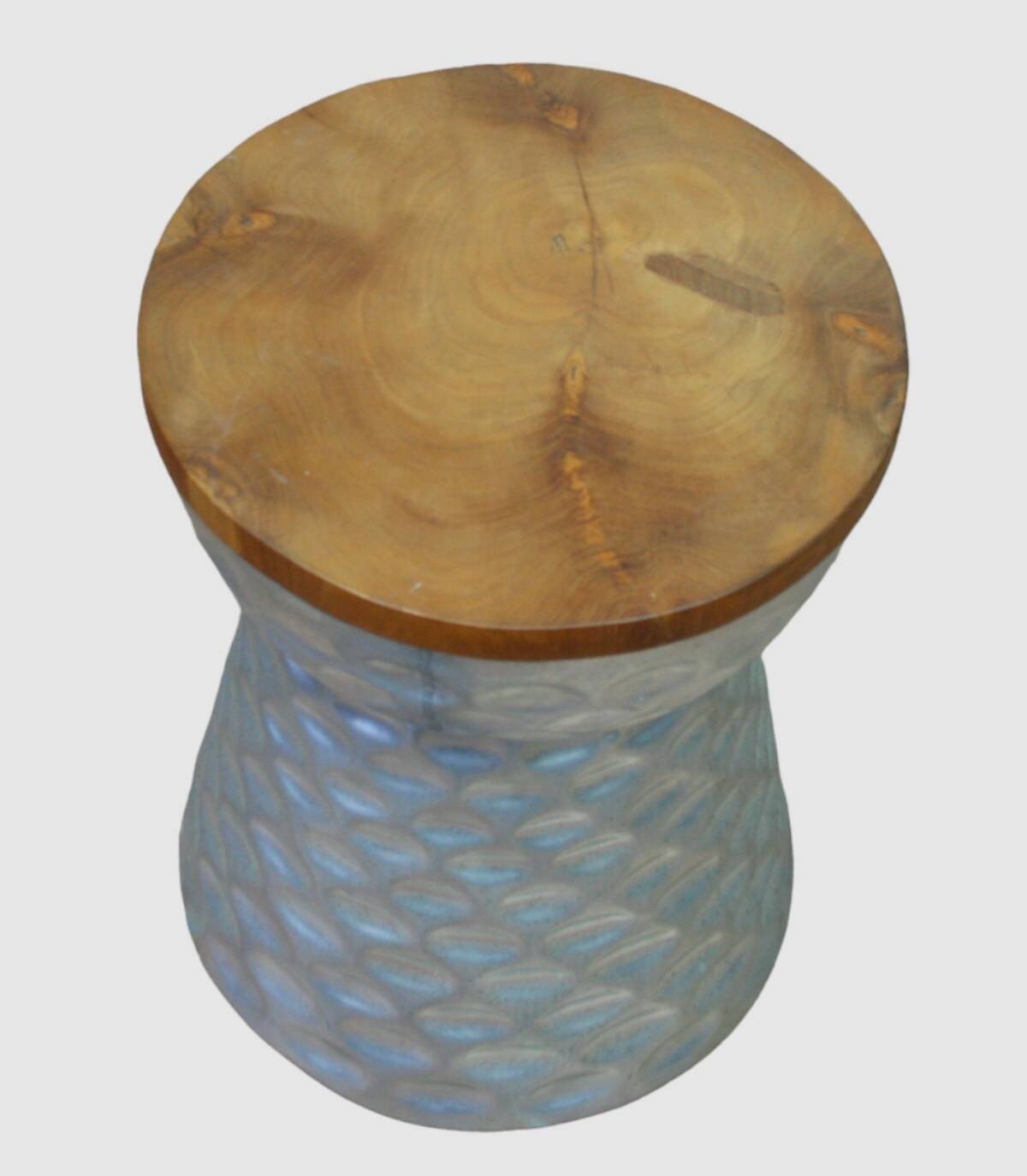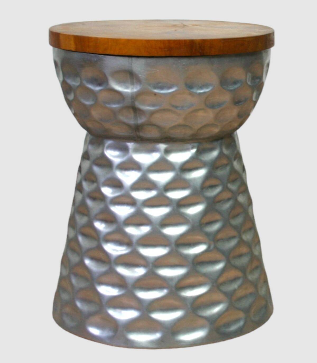 Este taburete con superficie moldeada con formas ovaladas esta compuesto de aluminio. Tiene tapa de madera circular extraible. Es muy ligero y tiene espacio debajo ya que esta hueco.